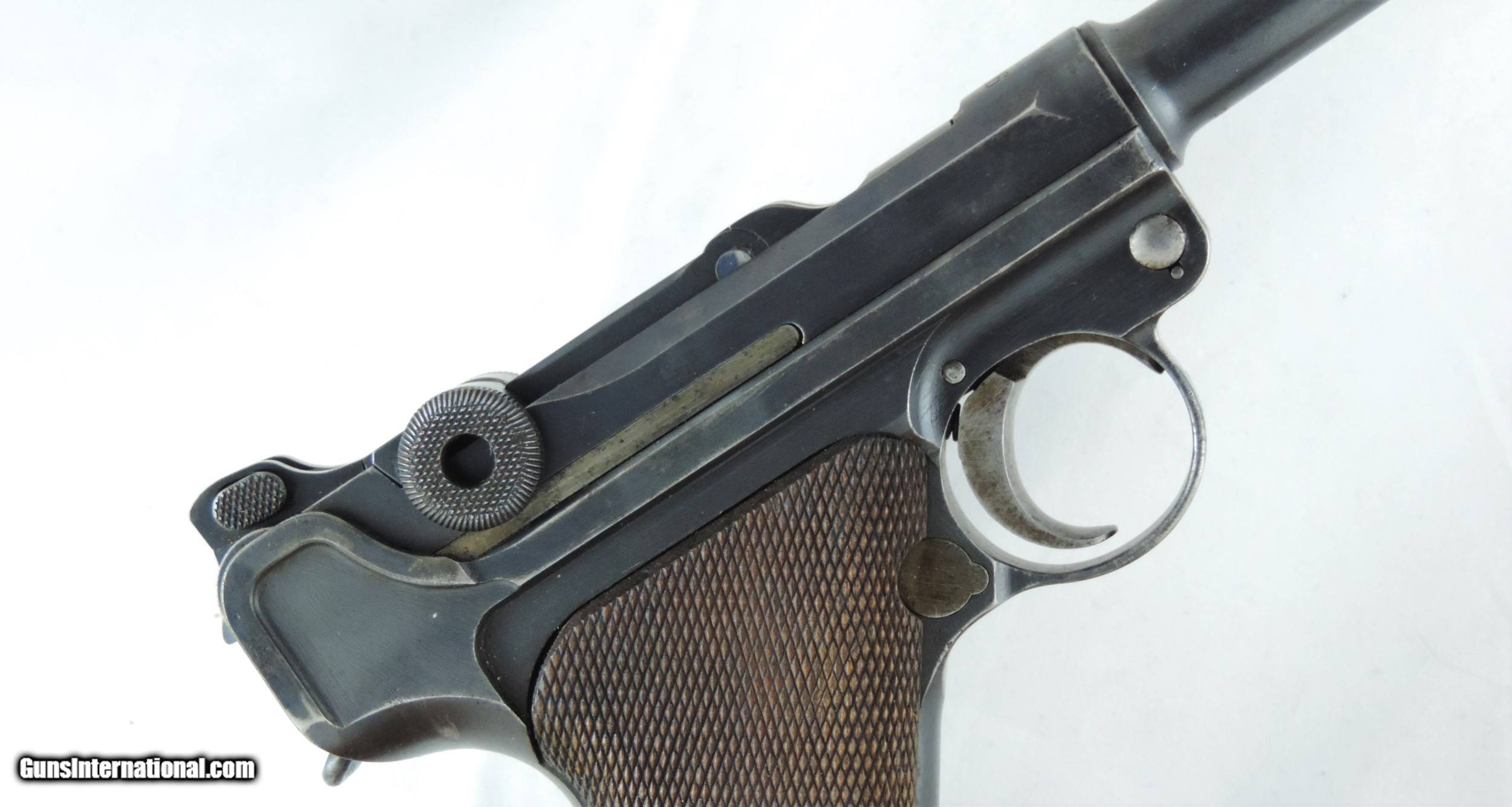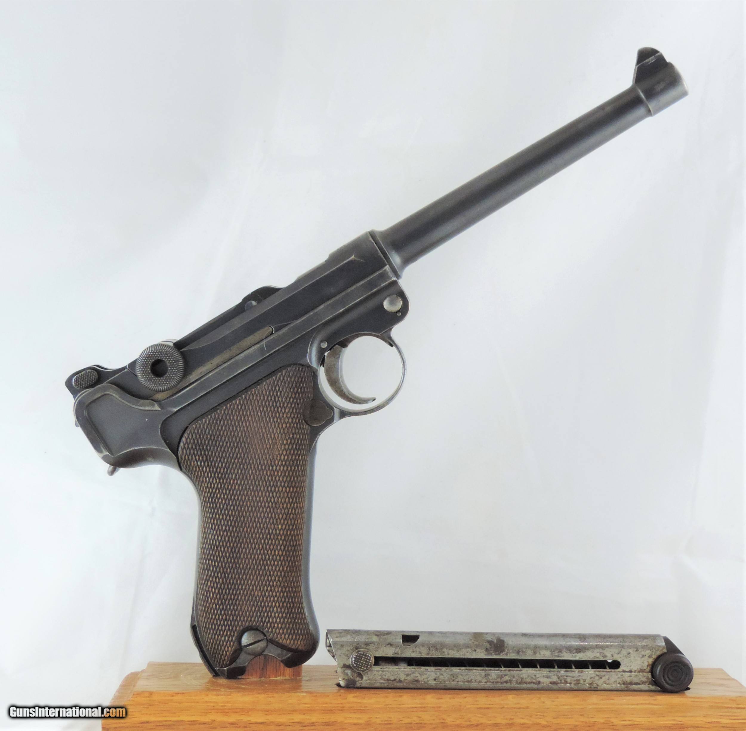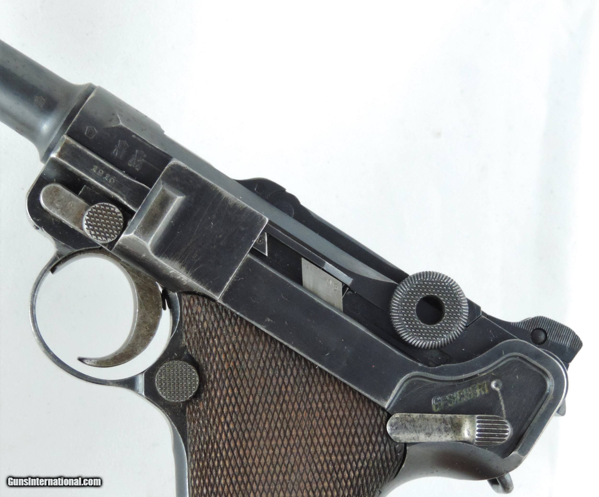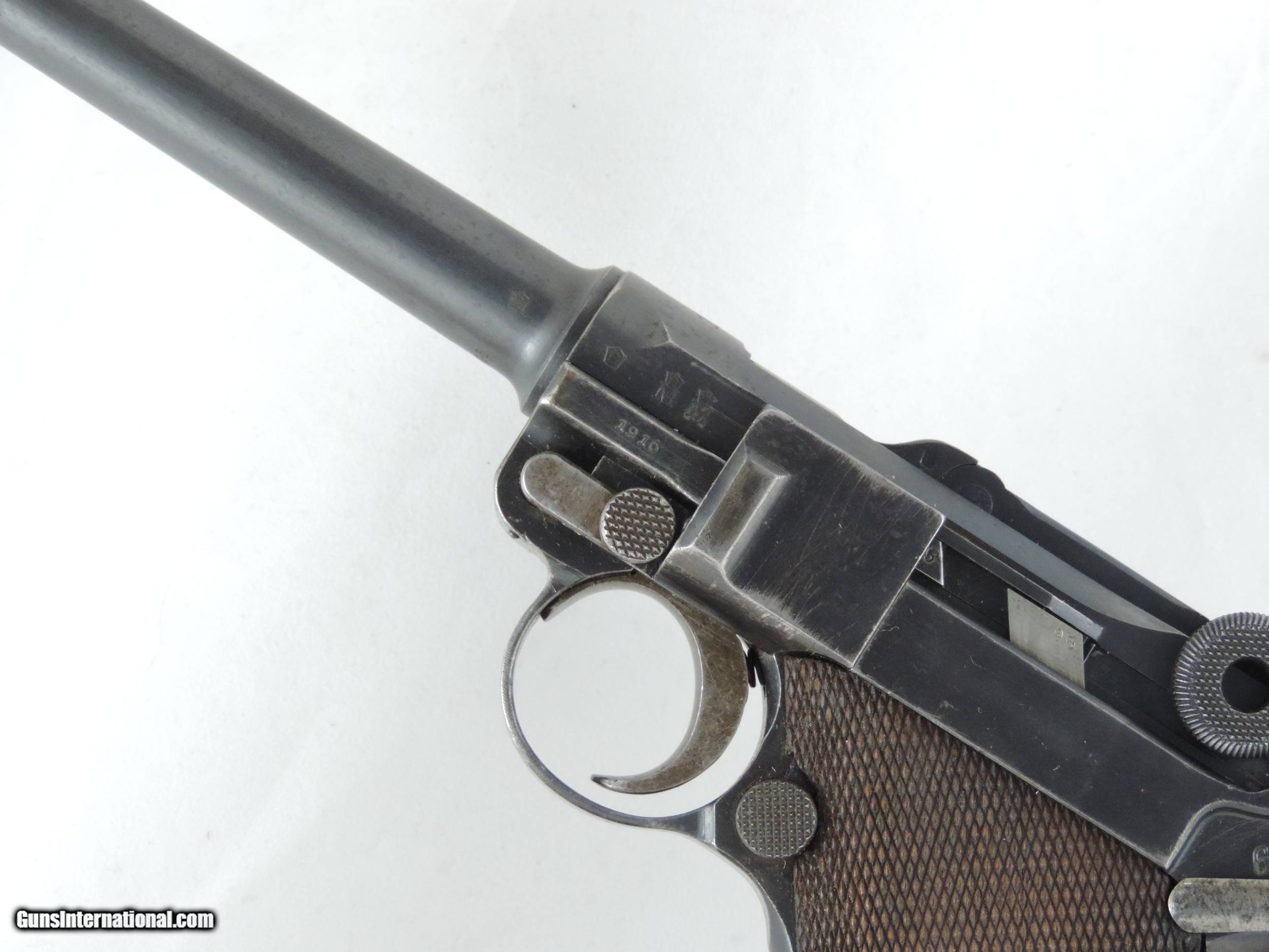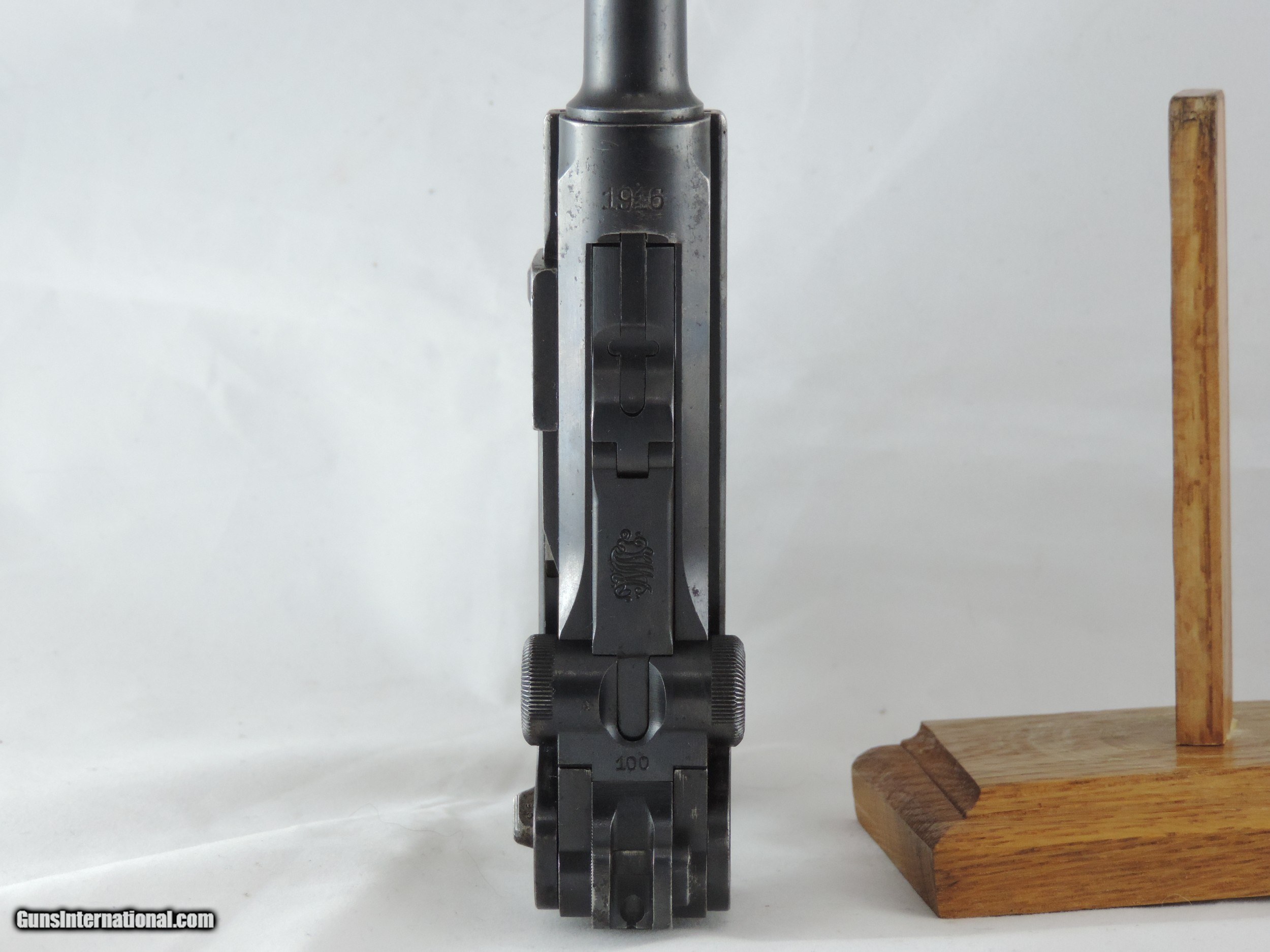Description: Inv. 7675 DWM NAVY P-08, Cal. .9mm, Ser. 2195, Dated 1916. Outstanding in every way. The gun retains about 95+% of the original factory finish. The little loss there is, is from holster wear, the usual side plate wear and some light scattered pin pricks. The frame is stamped Crown, Crown/M, Crown/M. The barrel is marked Crown/M. ALL NUMBERS MATCH INCLUDING THE CORRECT 3 RING WOODEN BASE MAGAZINE PROPERLY STAMPED CROWN/M. The strawed parts have age faded to about 45%. The safety does show some slight surface pinpricks. The grip straps have not started to gray. The walnut grips are pristine. Not even a flattened point. The bore is bright with well defined rifling and some light scattered frost. The front sight and side plate are stamped 1916 matching the receiver. It comes with one matching magazine as described above. For the very critical investor/collector it would be very difficult to find a better example anywhere near this price would be very difficult....Shipped... $4295.*** ***And it comes with our "Purchase Satisfaction Guarantee". To purchase this firearm or if you want to request more information contact us at: Email ckguns[at]ymail[dot]com Phone 201-512-0002 Cell 201-575-6838 FAX 201-215-4759 We accept most major credit cards. Prices shown are Discounted 3% for Cash or Check. The buyer must be familiar with all the laws governing the purchase and the ownership of firearms in their own city and state. The Yankee Armorer, Inc is not responsible for any failure to comply with or observe these laws. The Yankee Armorer, Inc will only ship after full payment and receipt of all required documents. Shipping: Add $35.00 for handguns, $45.00 for long guns. New Jersey buyers are subject to a 7% sales tax. The Yankee Armorer, Inc offers a 3 day inspection period with full refund upon return of intact firearm and in the original condition. The Yankee Armorer, Inc offers a no interest lay away program - 25% down; 25% in 30 days; 25% in 60 days; and full payment in 90 days. Any violation of this policy is subject to restocking and forfeiture of all payments. Any variation from this policy must be agreed to in advance. Unshipped Cancelled sales are subject to a 20% restocking fee. Be advised that all firearms sold by The Yankee Armorer, Inc. or the Gun Exchange, LLC (SELLER) are sold as collector’s items. They have not been fired or tested for safety and must be examined by a license gunsmith prior to use. By purchasing any item from the (SELLER), you are agreeing to hold the (SELLER) free from any damages or lawsuits of any nature. Any item left for transfer or storage will be charged to $25.00 per month, per item from the day of its receipt. Any variation from this policy must be agreed to in advance. Store hours 10:00 am to 5:00 pm Tuesday -Saturday. It's always best to call for appointment. Store 201-512-0002, cell 201-575-6838. SOLD Curio/Relic: Yes Manufacturer: DWM Model: 1914 Navy Military Serial Number: 2195 Caliber Info: 9mm Condition: 95% |