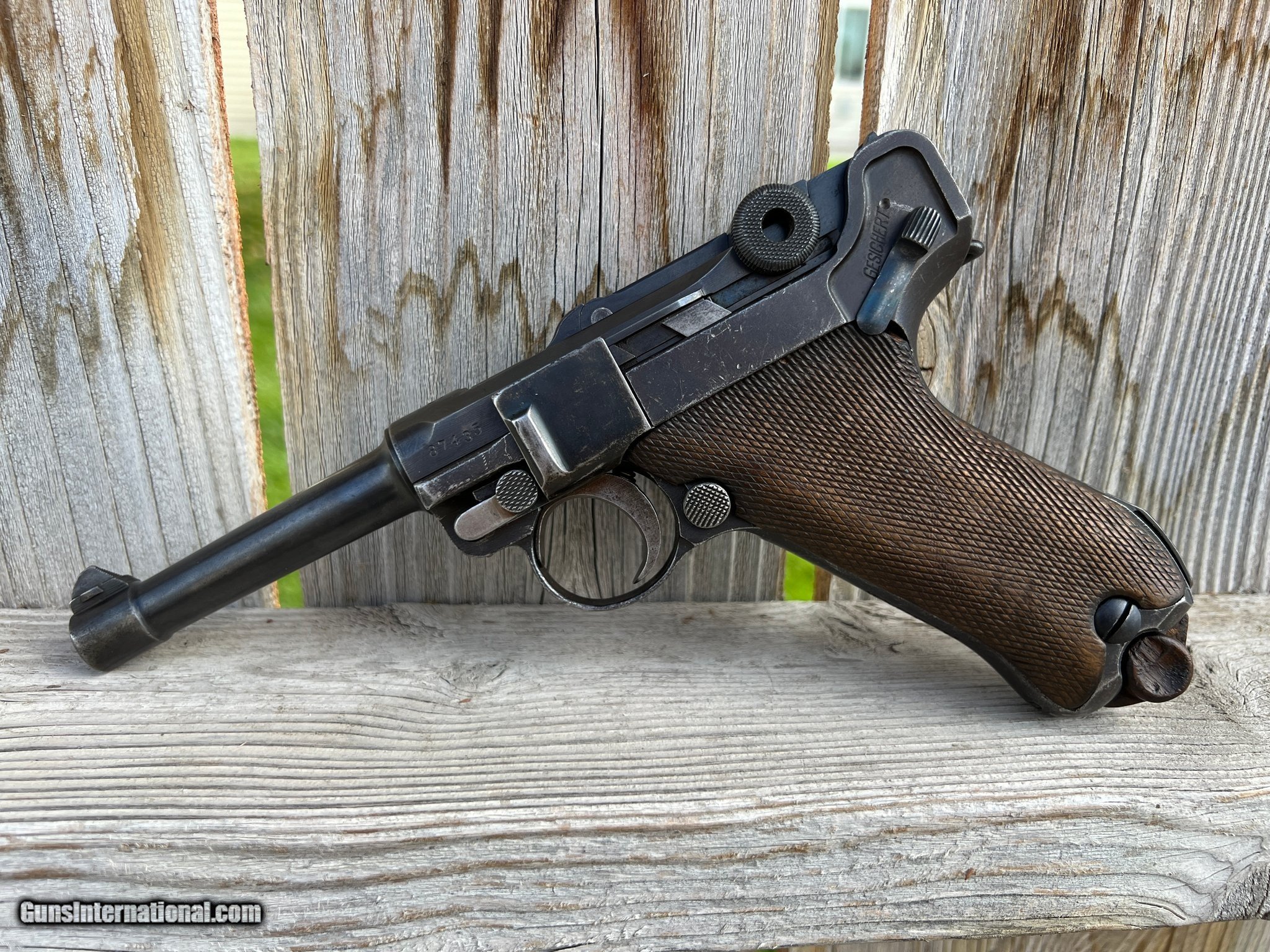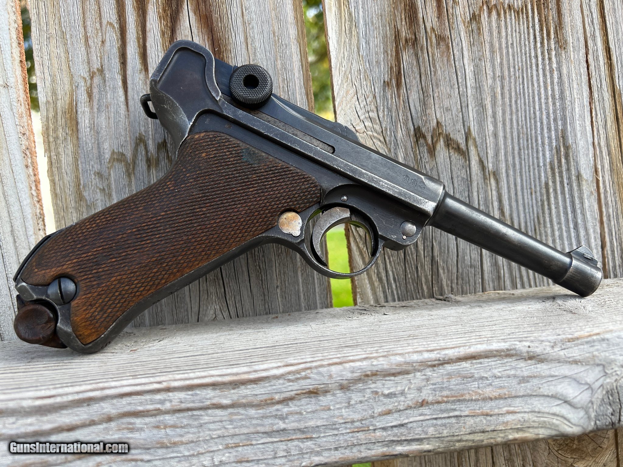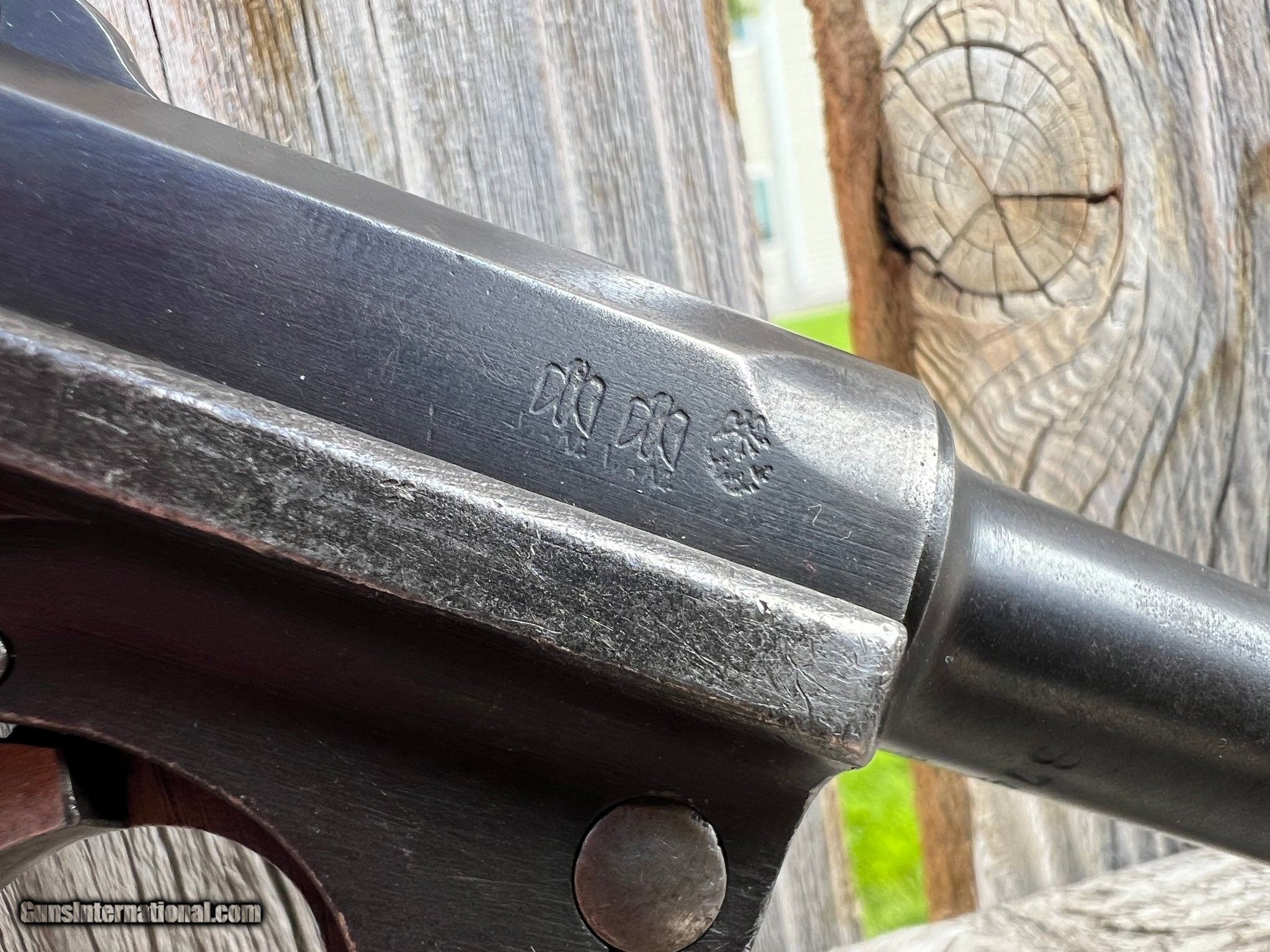 Description: Guns Listing ID: 573686 1921 Police Luger (P08) — 9×19mm — Historic Police Contract Item Specifics (fill before posting) Make: DWM Model: P08 Luger Caliber: 9×19mm Parabellum Year: 1921 Action: Toggle-lock, semi-automatic Finish: Blued Grips: Orginal Wood Barrel Length: 4\" Sights: Fixed Rear/ Adjustable Front Markings: Receiver has acceptance proofs on the side and the front of the handle has German police markings (both pictured) Magazine: Wood base plate, period correct but non numbers matching Condition: Good. This firearm will show wear that should be expected from a gun carried in police duty over 100 years ago. Bore: Semi-Dark and has some pitting Full Description For sale: 1921 Police contract Luger (P08) chambered in 9×19mm. This historic pistol bears a 1921 date marking and police/inspection stamps consistent with period police contracts. Toggle, receiver, and barrel present average wear and tear to be expected from a gun carried in police serivce over 100 years ago. Grips are original wood and in decent shape. Bore condition: Semi-Dark with some pitting. Function: Everything seems to good working order. This is the actual firearm pictured. Photos show serials/markings, bore, any damage, and included accessories. Historical pistols commonly have non-matching parts and service repairs. This pistol has no import marks and was more than likely a GI bring back. SOLD Curio/Relic: Yes Manufacturer: DWM Model: P08 Caliber Info: 9MM LUGER (9x19 PARA) Condition: Used - Non-Certified Barrels: 4" BARREL Action: SEMI AUTOMATIC Finish: black and wood |