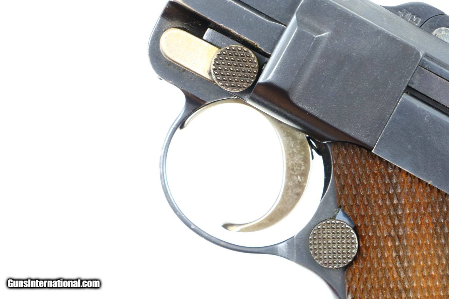 Description: Synopsis: DWM, German Luger, 1908 Commercial, 50818, FB00782 Description: Scarce DWM 1908 Commercial Luger, 9mmP with usual 4" barrel with drift adjustable front sight and fixed "V" notch rear sight. Full serial number on forward frame and under barrel, all appropriate small parts matched to the last two digits. BUG proofs under barrel and on toggle linkage. As true for all original 1908 Commercial Lugers THERE IS NO HOLD OPEN NOR GRIP SAFETY OR STOCK LUG. Unmarked grips. Tinned magazine with unmarked walnut plug. Condition: Excellent as partially professional refurbished with sharp planes and easily ledgible markings, particularly under the barrel where the markings are still haloed. Slightly dull bore with sharp rifling. Perfect manual mechanics. One of the more unusual Lugers to add to your collection! ~~Insured shipping fee of $65; most packages shipped using FedEx 2nd Day.~~ SOLD Manufacturer: DWM Serial Number: 50818 Caliber Info: 9mmP |