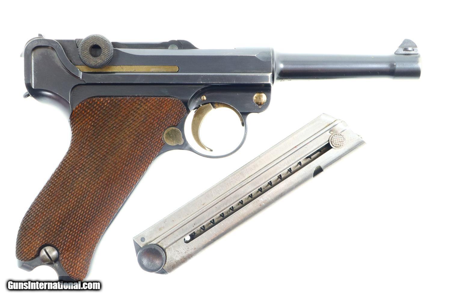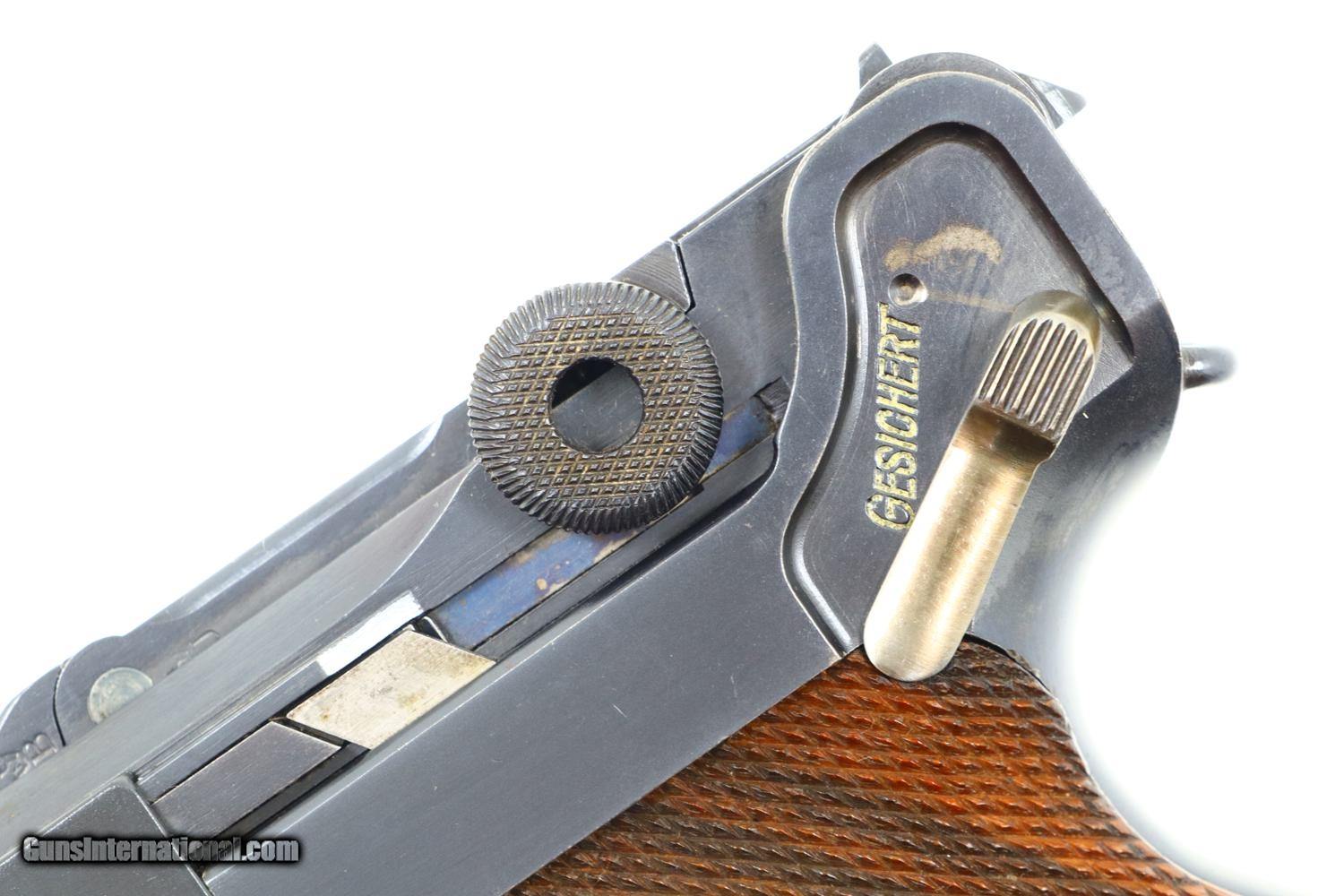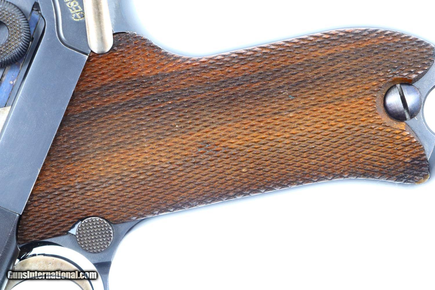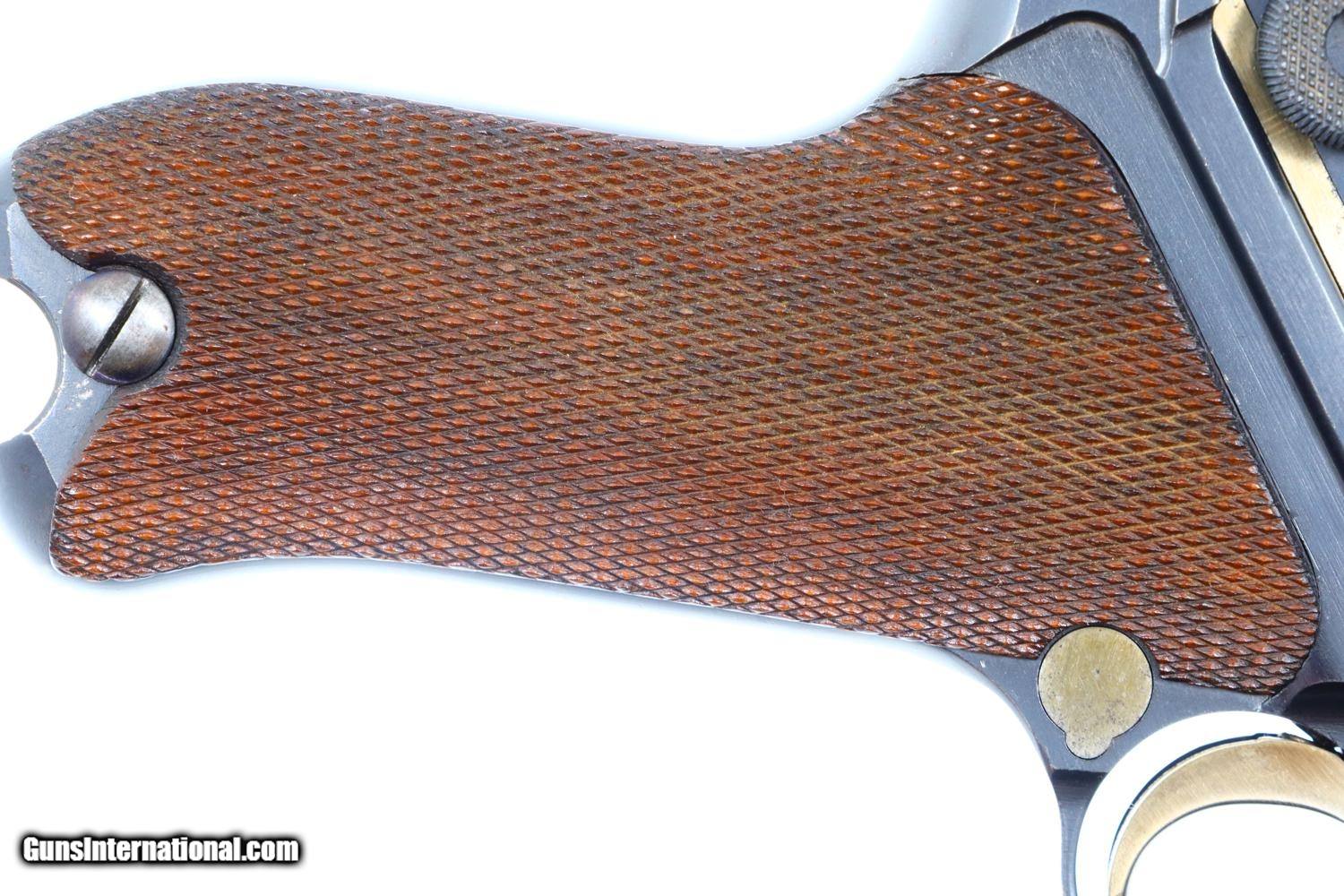 Description: Synopsis: DWM, German Luger, 1908 Commercial, 50818, FB00782 Description: Scarce DWM 1908 Commercial Luger, 9mmP with usual 4" barrel with drift adjustable front sight and fixed "V" notch rear sight. Full serial number on forward frame and under barrel, all appropriate small parts matched to the last two digits. BUG proofs under barrel and on toggle linkage. As true for all original 1908 Commercial Lugers THERE IS NO HOLD OPEN NOR GRIP SAFETY OR STOCK LUG. Unmarked grips. Tinned magazine with unmarked walnut plug. Condition: Excellent as partially professional refurbished with sharp planes and easily ledgible markings, particularly under the barrel where the markings are still haloed. Slightly dull bore with sharp rifling. Perfect manual mechanics. One of the more unusual Lugers to add to your collection! ~~Insured shipping fee of $65; most packages shipped using FedEx 2nd Day.~~ SOLD Manufacturer: DWM Serial Number: 50818 Caliber Info: 9mmP |