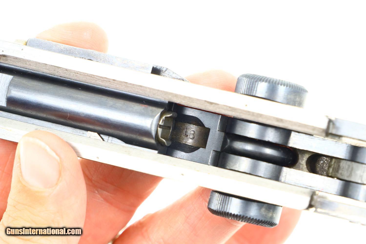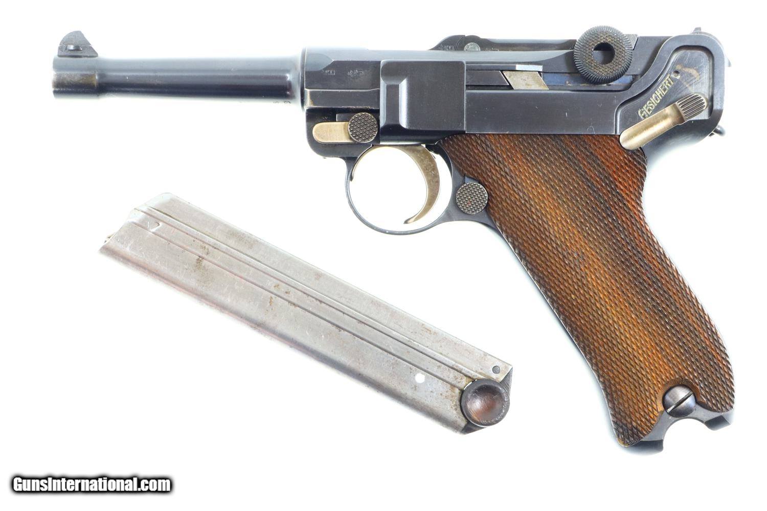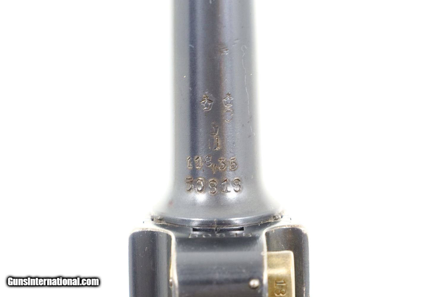 Description: Synopsis: DWM, German Luger, 1908 Commercial, 50818, FB00782 Description: Scarce DWM 1908 Commercial Luger, 9mmP with usual 4" barrel with drift adjustable front sight and fixed "V" notch rear sight. Full serial number on forward frame and under barrel, all appropriate small parts matched to the last two digits. BUG proofs under barrel and on toggle linkage. As true for all original 1908 Commercial Lugers THERE IS NO HOLD OPEN NOR GRIP SAFETY OR STOCK LUG. Unmarked grips. Tinned magazine with unmarked walnut plug. Condition: Excellent as partially professional refurbished with sharp planes and easily ledgible markings, particularly under the barrel where the markings are still haloed. Slightly dull bore with sharp rifling. Perfect manual mechanics. One of the more unusual Lugers to add to your collection! ~~Insured shipping fee of $65; most packages shipped using FedEx 2nd Day.~~ SOLD Manufacturer: DWM Serial Number: 50818 Caliber Info: 9mmP |