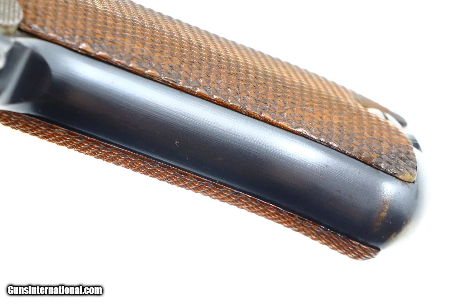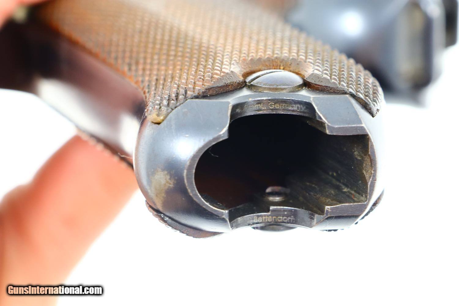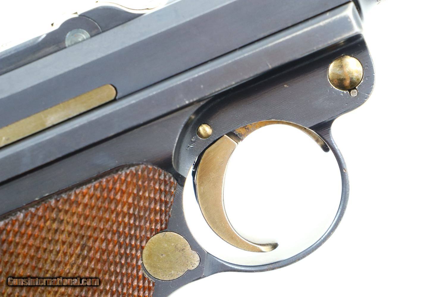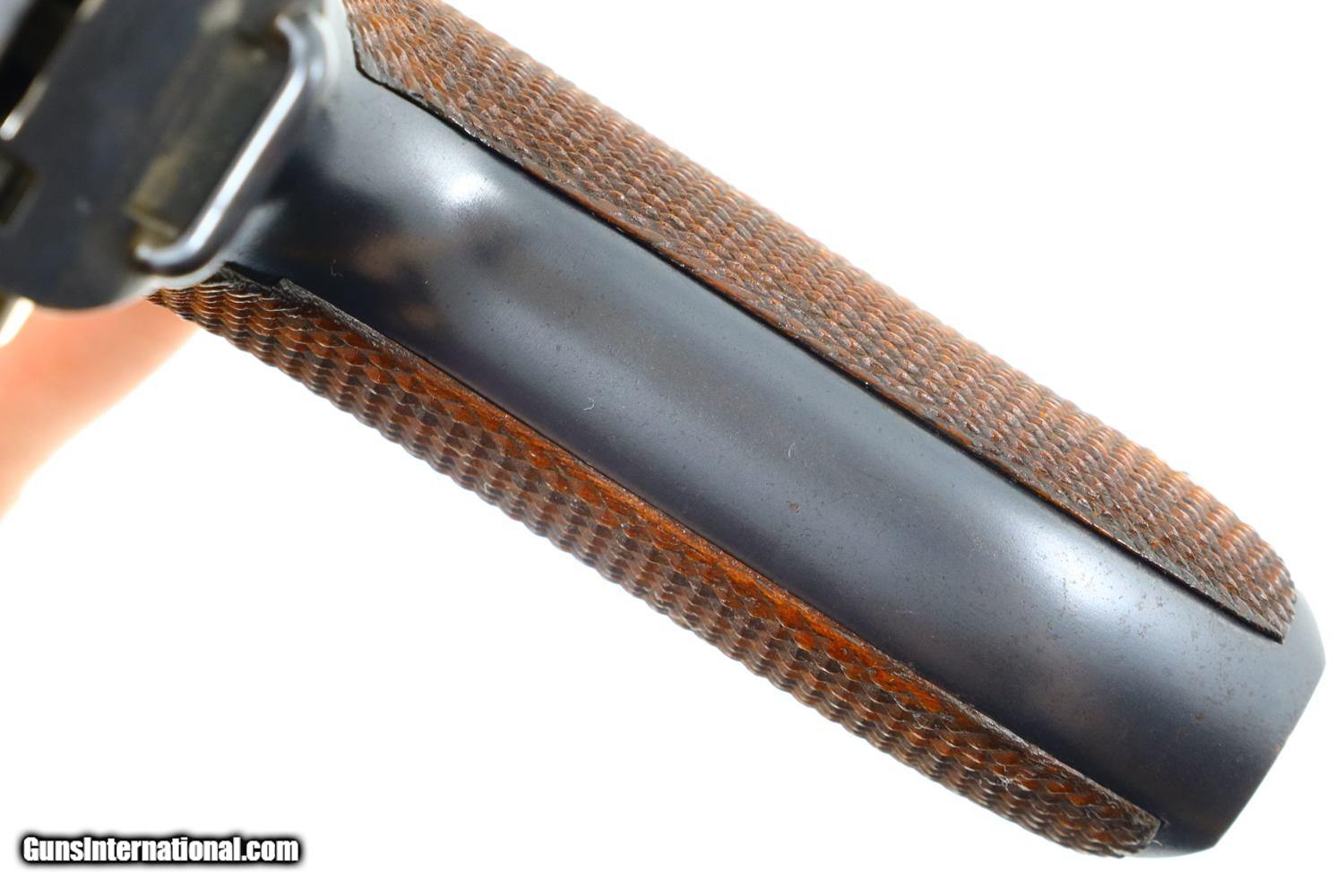 Description: Synopsis: DWM, German Luger, 1908 Commercial, 50818, FB00782 Description: Scarce DWM 1908 Commercial Luger, 9mmP with usual 4" barrel with drift adjustable front sight and fixed "V" notch rear sight. Full serial number on forward frame and under barrel, all appropriate small parts matched to the last two digits. BUG proofs under barrel and on toggle linkage. As true for all original 1908 Commercial Lugers THERE IS NO HOLD OPEN NOR GRIP SAFETY OR STOCK LUG. Unmarked grips. Tinned magazine with unmarked walnut plug. Condition: Excellent as partially professional refurbished with sharp planes and easily ledgible markings, particularly under the barrel where the markings are still haloed. Slightly dull bore with sharp rifling. Perfect manual mechanics. One of the more unusual Lugers to add to your collection! ~~Insured shipping fee of $65; most packages shipped using FedEx 2nd Day.~~ SOLD Manufacturer: DWM Serial Number: 50818 Caliber Info: 9mmP |
