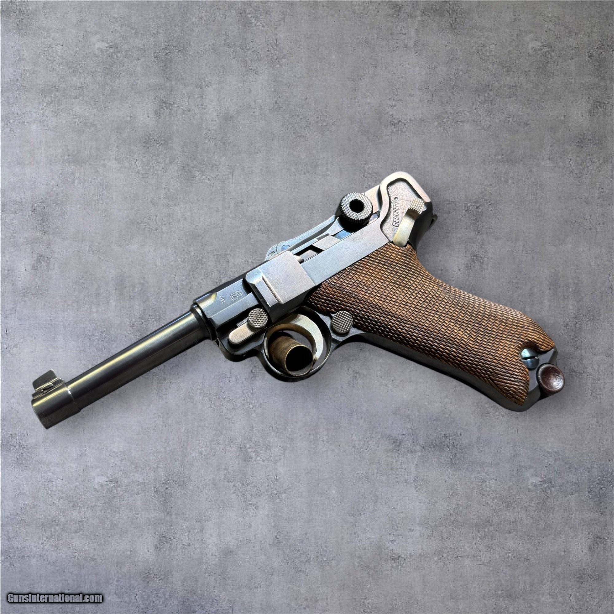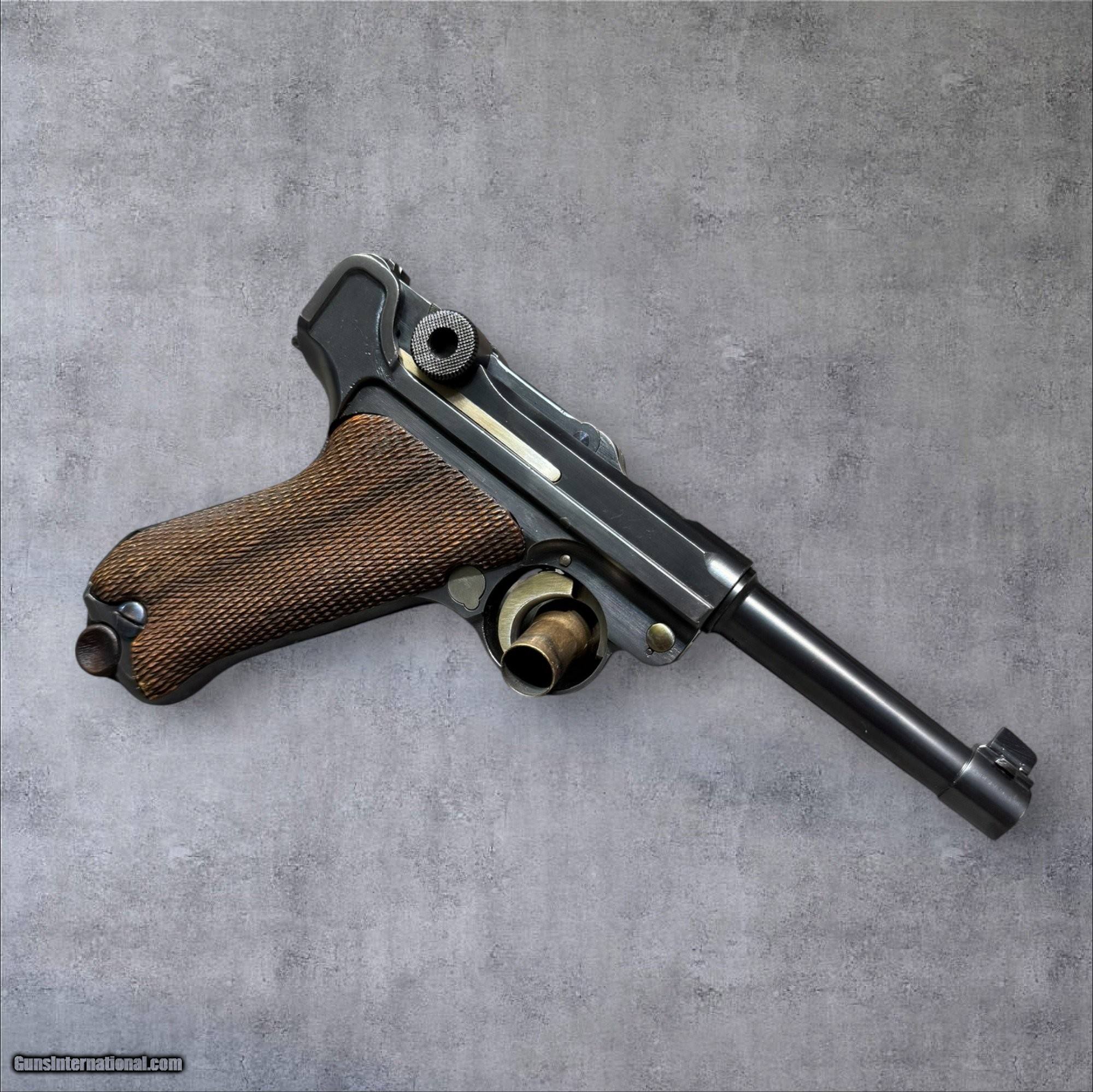 Description: Guns Listing ID: 623904 Own the ultimate symbol of ballistic history with this magnificent P08 Luger, featuring the prestigious and highly coveted DWM monogram scroll across its toggle. As the original architects of the Parabellum design, DWM represents the very soul of the Luger legacy, and this example carries that heritage with undeniable presence. Chambered in the world-standard 9mm, this pistol is a stunning showcase of early 20th-century precision, featuring matching serial numbers 9670 across the barrel and receiver that verify its remarkable structural integrity. The deep, even bluing across the frame and barrel highlights a silhouette that changed the course of sidearm development forever. Its checkered walnut grips remain sharp and tactile, perfectly complementing the smooth, mechanical perfection of the toggle-lock action. Every detail, from the crisp \"GESICHERT\" safety engagement to the perfectly aligned factory witness marks, points to a firearm that has been curated with the utmost respect for its lineage. This particular specimen stands out as a \"natural pointer,\" offering the legendary balance and ergonomics that made the P08 the most prized trophy of the World Wars. The DWM engraving on the toggle serves as a hallmark of quality, marking this as a centerpiece-caliber acquisition for the serious historical investor. Rare is the opportunity to find such a clean example that retains the elegant aesthetic of the DWM production line. Secure this masterwork of German craftsmanship today and hold a definitive piece of military and engineering history in the palm of your hand. Includes 1 magazine. Manufacturer: DWM Model: P08 P-08 German Luger Caliber Info: 9MM LUGER (9x19 PARA) Condition: Used - Non-Certified Barrels: 4" BARREL Action: SEMI AUTOMATIC Finish: black blued Price: $3,700.99 Contact Seller |