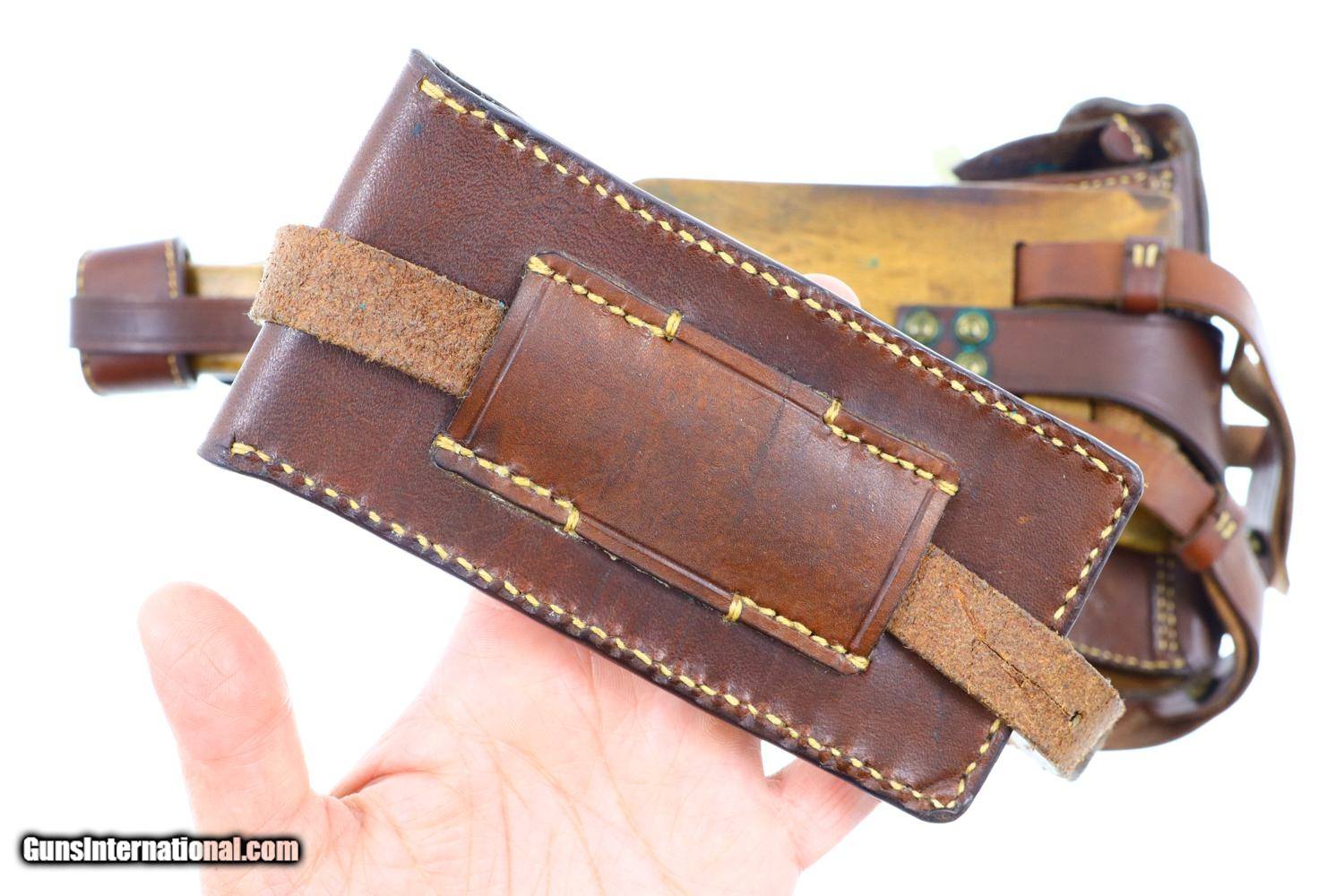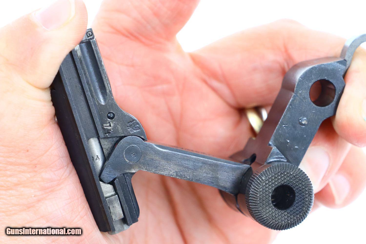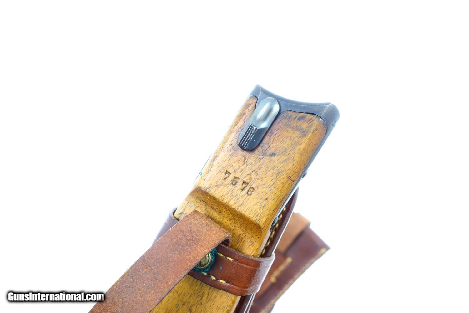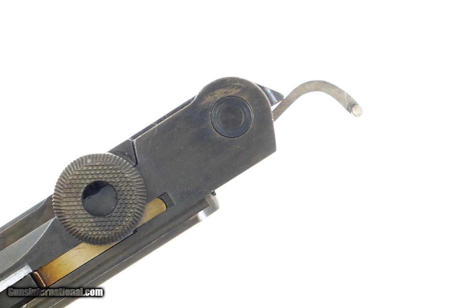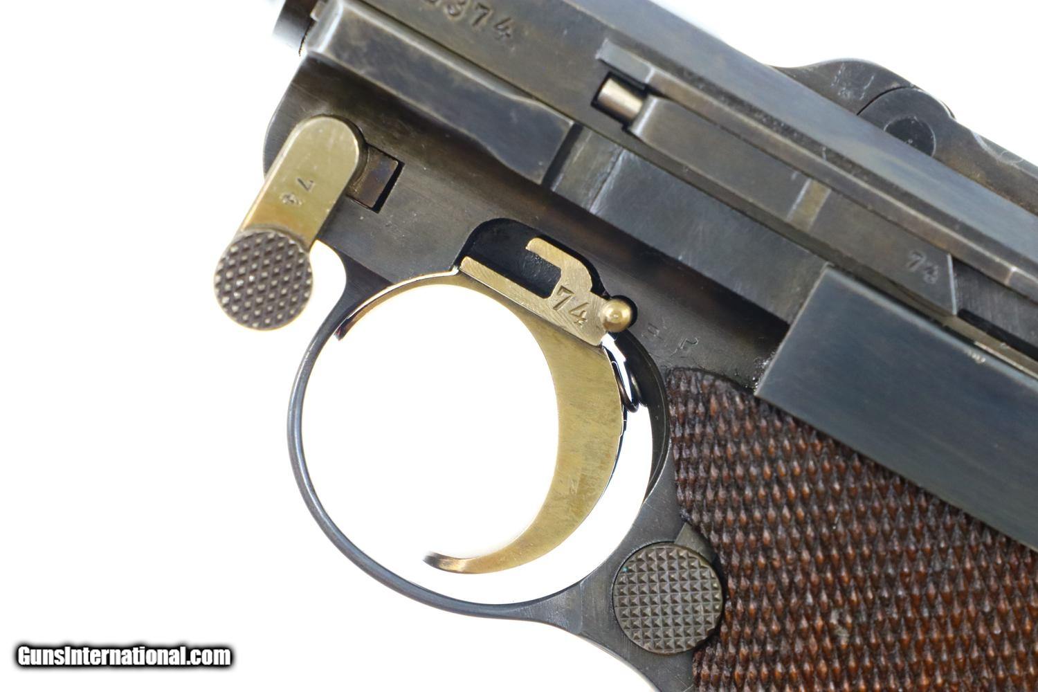 Description: Synopsis: Scarce DWM, 1915 Artillery Luger, German Military WWI, correct magazine. Description: 1915 was the second year that DWM made Artillery Lugers. All the early pistols, as per this example, fitted with fine tune front and rear sights. This standard configuration Artillery Luger from WWI, caliber 9mmP, has an 8 inch barrel and a rear sight fitted the usual 1-8 stops for cursor elevation. Chamber dated 1915 with intertwined DWM on front toggle link. Usual proofs on right side of barrel extention. Full serial number on forward frame, under barrel, and left side of barrel extention. Last two digits on all usual small parts, including the grips, though the cursor "56" and the magazine plug numbered 2133a. Original stock numbered 7578 on left side of neck; lug numbered 2557c. Reproduction holster/associated leather dated 1915. Rig is complete with straps, double magazine pouch, boot, and cleaning rod. No take down tool. Condition: VG as reblued and restrawed. Markings remain crips and planes flat. Oil darkened grips with surprisingly sharp checkering. Exc original magazine. Gernerally bright bore, light oxidative etching, easily discernable rifling. Perfect manual mechanics. VG stock with near EXC reproduction leather. An attractive rig whose pistol figured prominently in WWI. ~~Insured shipping fee of $75; most packages shipped using FedEx 2nd Day.~~ SOLD Manufacturer: DWM Serial Number: 2374a Caliber Info: 9mmP |