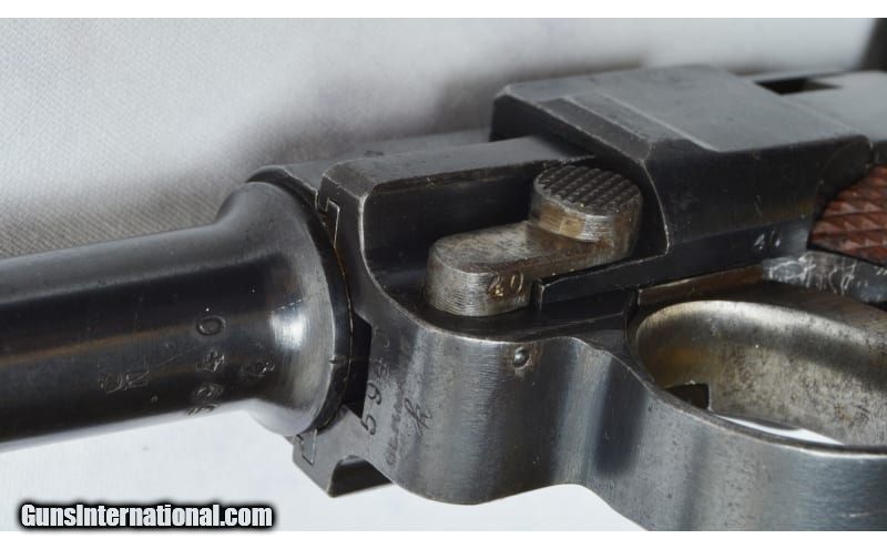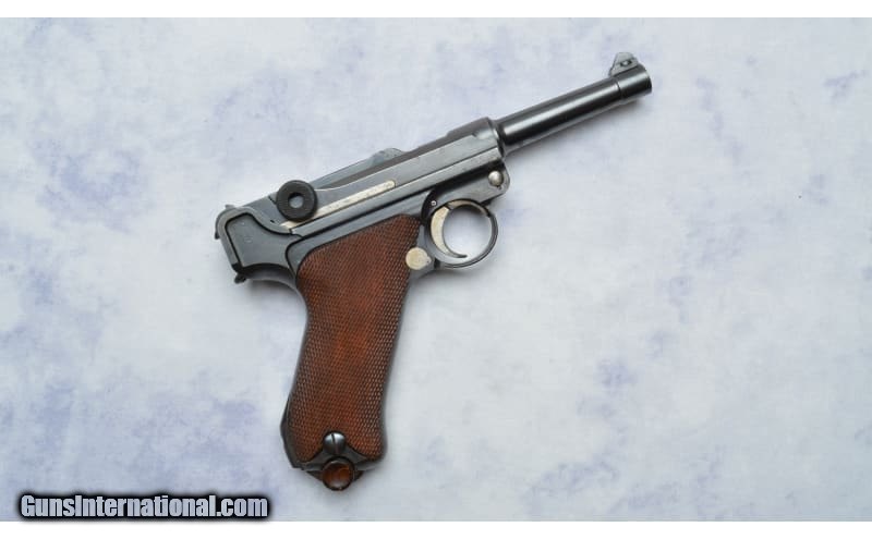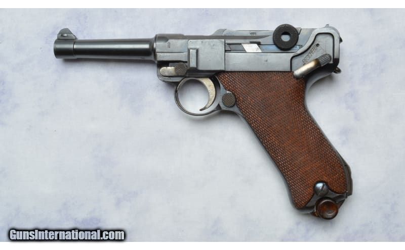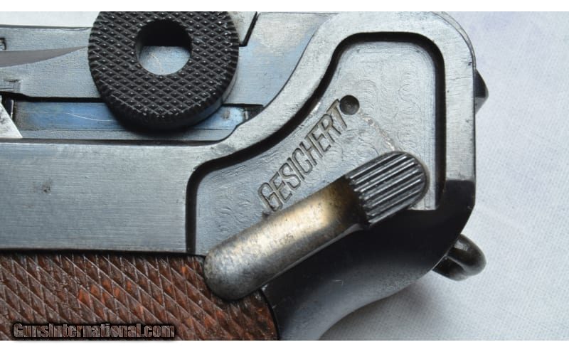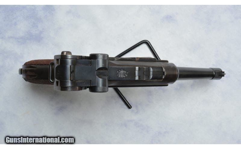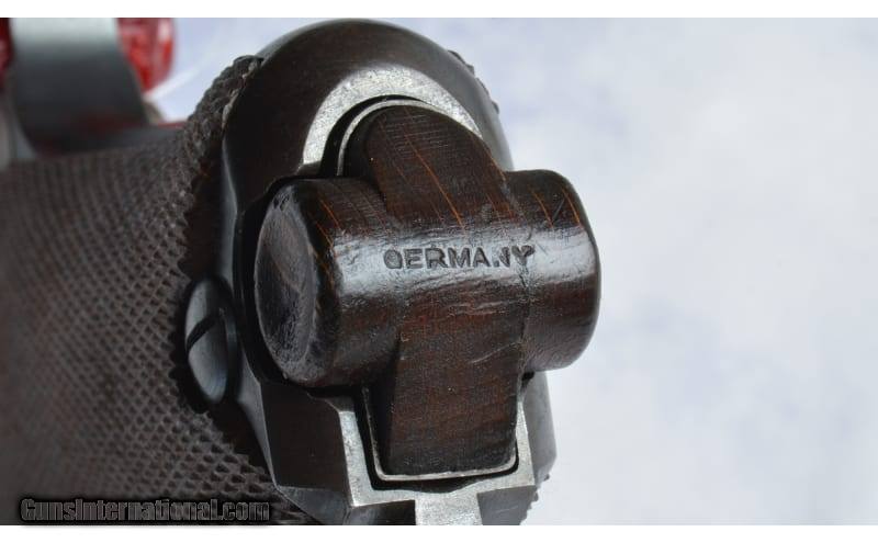 Description: This DWM P08 features; 4" Barrel with unmarked .30 Cal. chamber, "GERMANY" Export Stamp, "GESICHERT" Stamp, Commercial Nitro Proof, Matching External Numbers, Non-matching Wood Bottom Magazine. Soft Case and One (1) Magazine. None SOLD Chambers: Unmarked .30 Cal. Metal Condition: Good Wood Condition: Good Bore Condition: Good Barrels: 4 Sights: Fixed Integral Item Location: Green Bay |