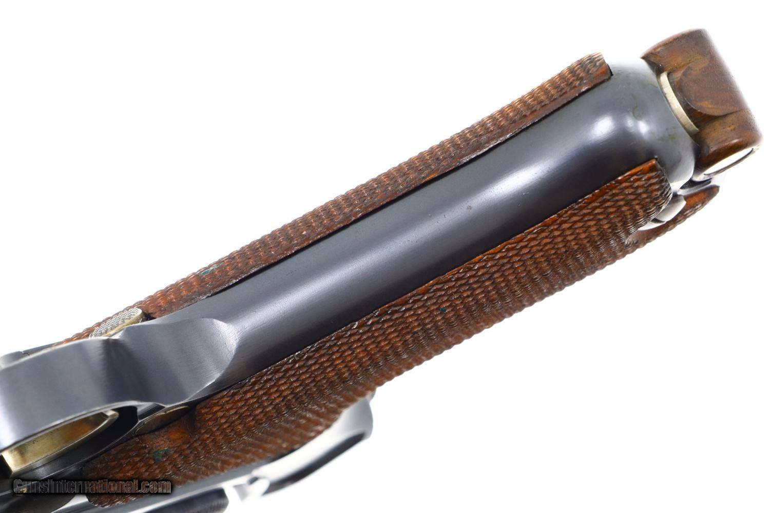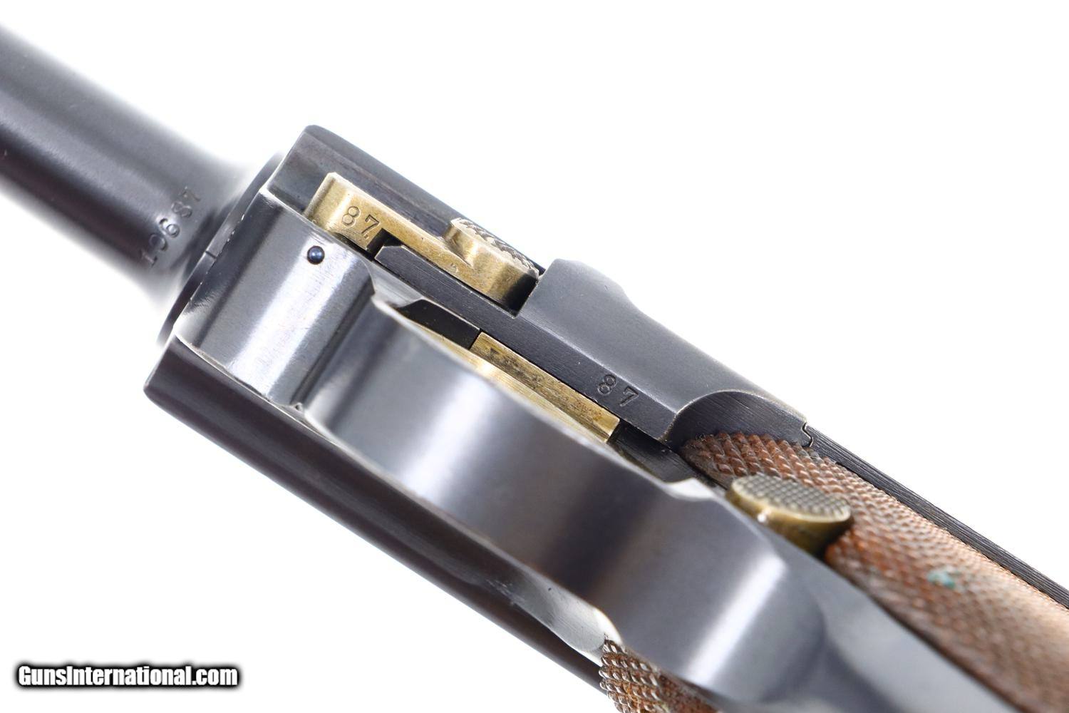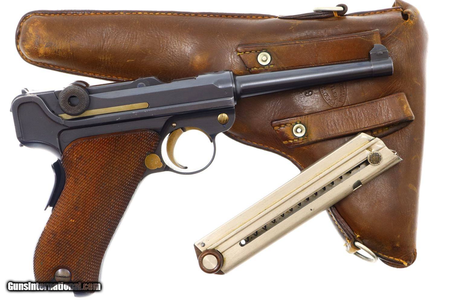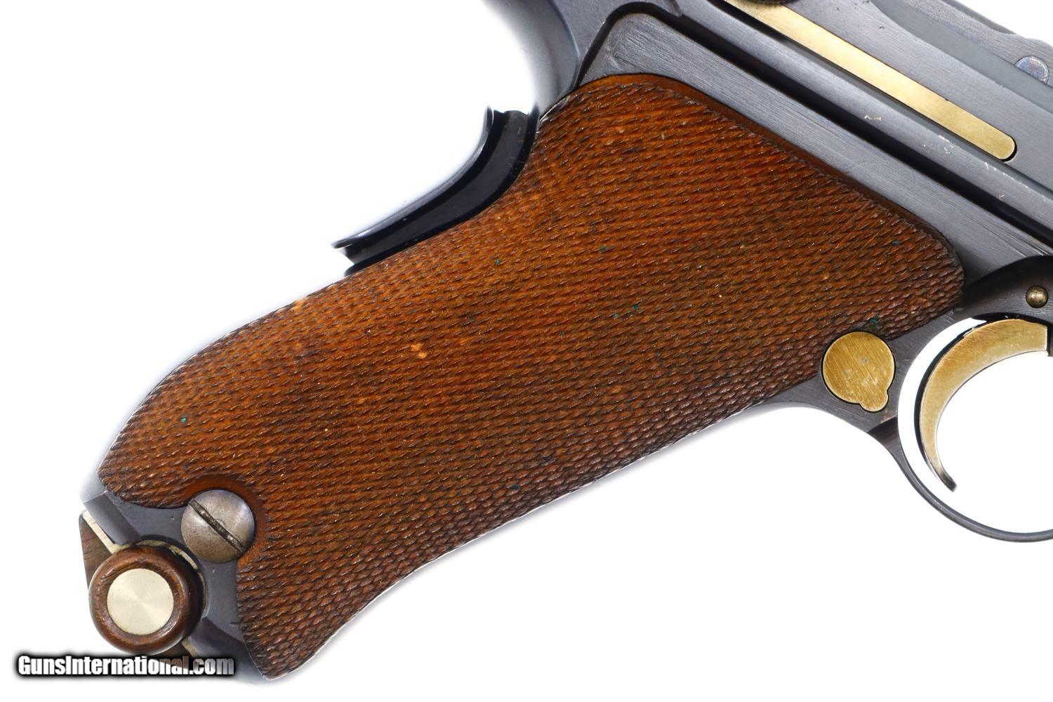 Description: Synopsis: Beautiful German DWM 1906 Swiss Military Luger, Matching with Correct Magazine and Holster Description: Very attractive M1906 Cross in Shield Swiss military Luger, .30 Luger, with 4 ¾” barrel having a drift adjustable front sight and fixed V-notch rear sight. Impressive and deep Cross-in-Shield over chamber with usual DWM over front toggle link. Full serial number under barrel and on forward frame. Numbered small parts are all matching except the grips, one panel with an inspection letter 'a'; the other with '09.' Deaccession marking: P52 at rear of frame. Correct early magazine with metal disc on each side of the unmarked walnut plug. Supple dark brown military holster dated '09.' Condition: Original finish, with 98+% rust blue with minimal sharp edge holster wear. Strawed parts, freshened, in comparable condition. Sharply checkered walnut grips, with usual oil staining. Comparable condition magazine. Mirror bore. Perfect manual mechanics. Near excellent holster. An extremely attractive, no excuse, 1906 Swiss Military Luger, with correct magazine and holster, well suited for the serious collector. ~~Insured shipping fee of $65; most packages shipped using FedEx 2nd Day.~~ SOLD Curio/Relic: Yes Manufacturer: DWM Serial Number: 10687 Caliber Info: .30 Luger |