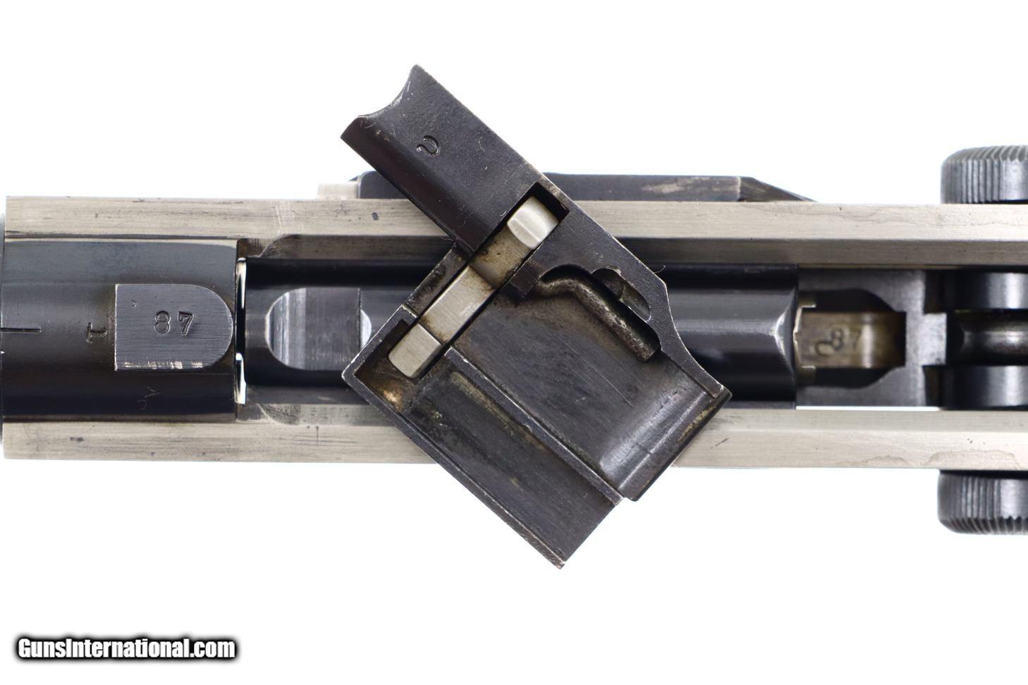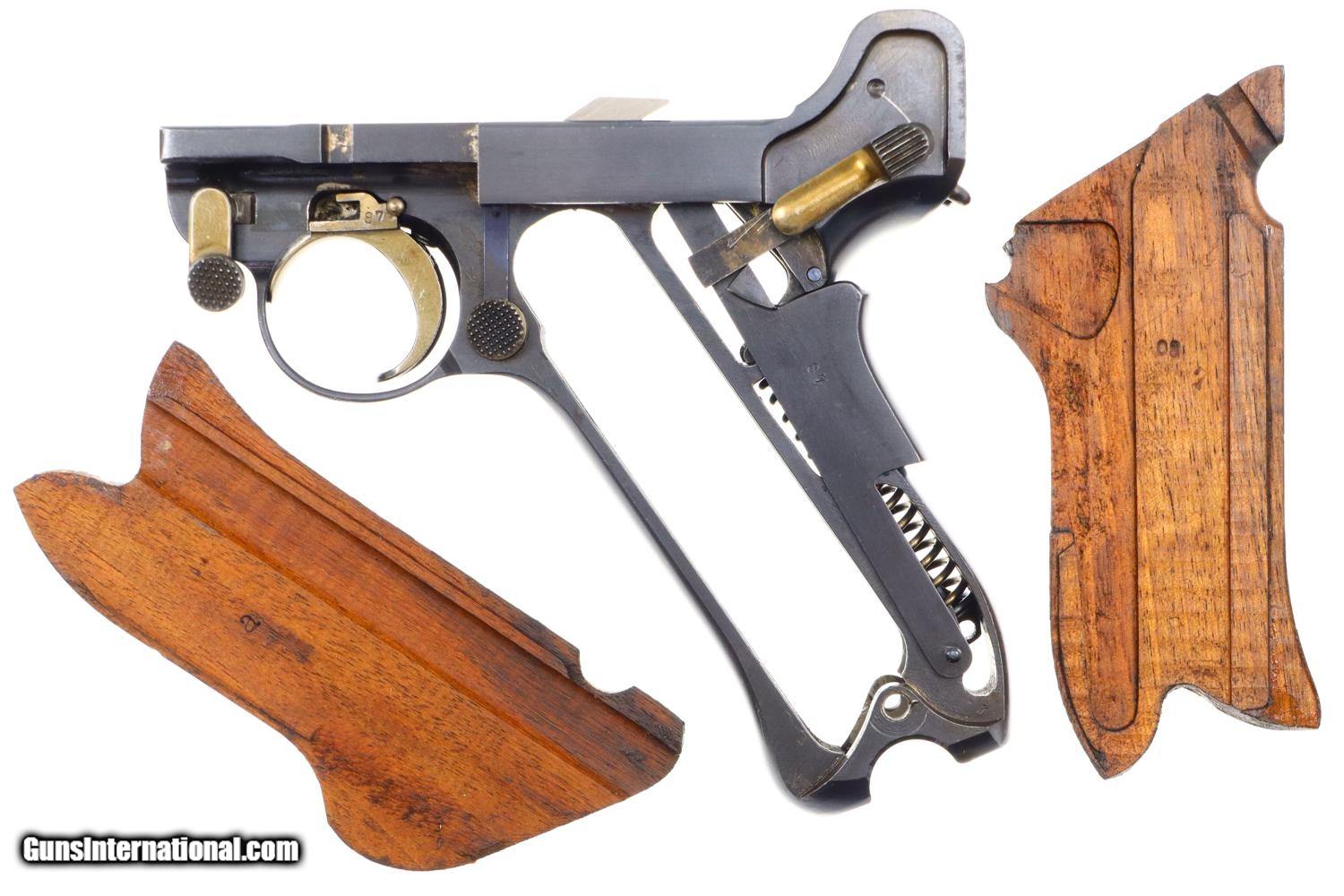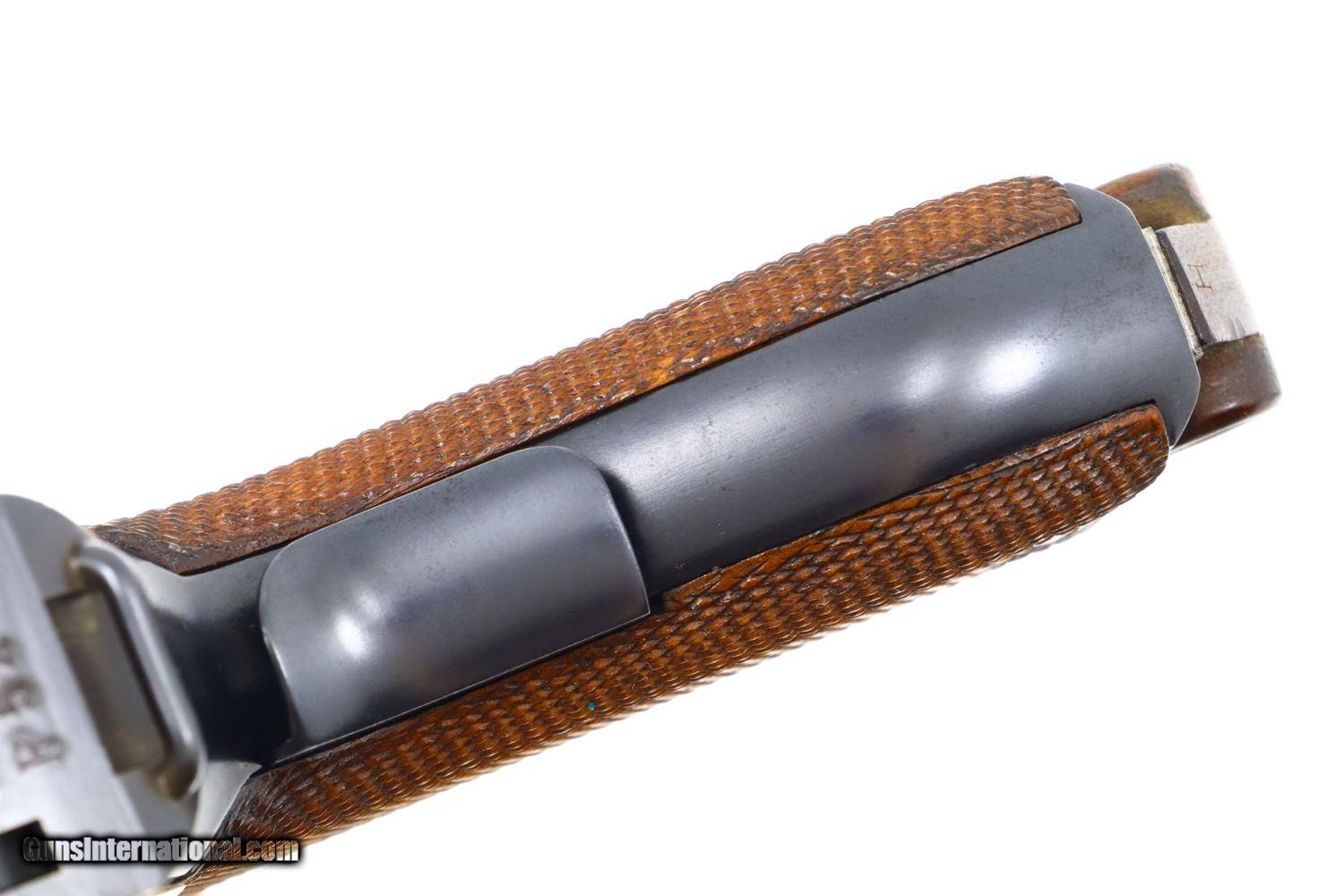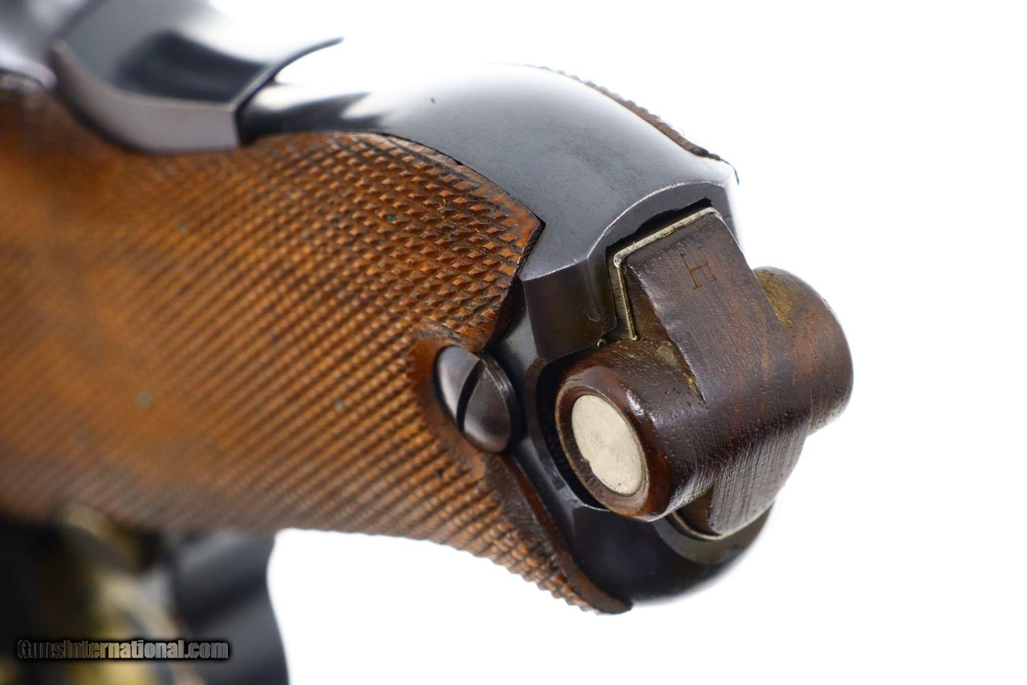 Description: Synopsis: Beautiful German DWM 1906 Swiss Military Luger, Matching with Correct Magazine and Holster Description: Very attractive M1906 Cross in Shield Swiss military Luger, .30 Luger, with 4 ¾” barrel having a drift adjustable front sight and fixed V-notch rear sight. Impressive and deep Cross-in-Shield over chamber with usual DWM over front toggle link. Full serial number under barrel and on forward frame. Numbered small parts are all matching except the grips, one panel with an inspection letter 'a'; the other with '09.' Deaccession marking: P52 at rear of frame. Correct early magazine with metal disc on each side of the unmarked walnut plug. Supple dark brown military holster dated '09.' Condition: Original finish, with 98+% rust blue with minimal sharp edge holster wear. Strawed parts, freshened, in comparable condition. Sharply checkered walnut grips, with usual oil staining. Comparable condition magazine. Mirror bore. Perfect manual mechanics. Near excellent holster. An extremely attractive, no excuse, 1906 Swiss Military Luger, with correct magazine and holster, well suited for the serious collector. ~~Insured shipping fee of $65; most packages shipped using FedEx 2nd Day.~~ SOLD Curio/Relic: Yes Manufacturer: DWM Serial Number: 10687 Caliber Info: .30 Luger |
