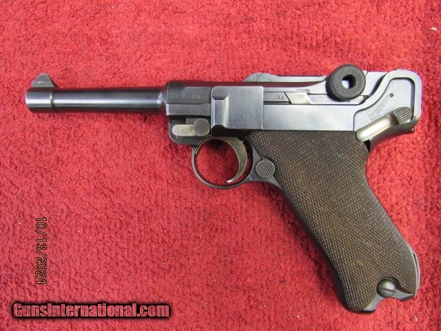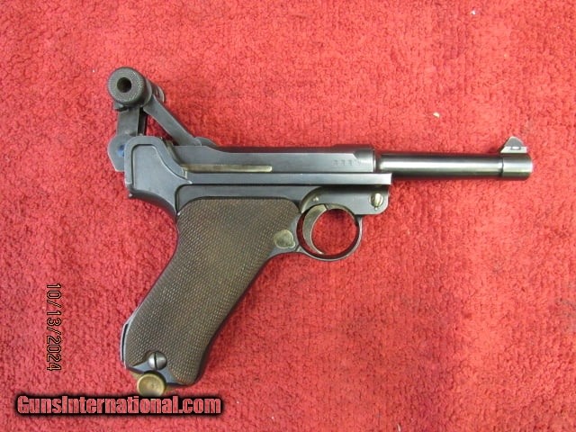 Description: Guns Listing ID: 1457624 EXCELLENT CONDITION- APPEARS TO BE ONLY ONCE FIRED ALL PARTS MATCHING- STRAW FINISH PRESENT ON ALL PARTS THAT SHOULD BE STRAW- WOOD GRIPS NO CRACKS, NO SERIAL NUMBER ON GRIPS 2 MAGAZINES- WOOD BOTTOM- NO MARKINGS TOGGLE LOCK (BOLT HOLD OPEN) RIFLE STOCK LUG IS PRESENT ON FRAME DMW MODEL P08 LUGER (1915 STAMPED) 9MM LUGER 9X19 4\" BARREL 2 MAGAZINES INCLUDED WOOD BOTTOMS ALL PARTS MATCHING \"88\ SOLD Manufacturer: LUGER Model: DMW 1915 P08 LUGER 9MM 2 MAGS AND HOLSTER Caliber Info: 9MM LUGER (9X19 PARA) Condition: Used - Non-Certified Barrels: 4 BARREL Finish: BLUED |
