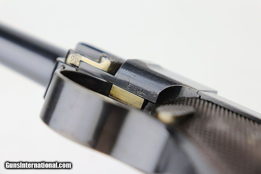 Description: This is a very desirable early Model 1902 "American Eagle" Luger pistol that is in excellent condition. These are rare with the fat barrel, as only 600-700 were ever produced in total, all for commercial sales in the United States. This model was a continuation of the earlier 1902 commercial Luger however these were specifically intended for the U.S. market, and these were the first 9mm chambered Lugers. This pistol has the short old style frame with leaf springs and no stock lug, recessed breech block, dished toggles with toggle lock and grip safety. The barrel extension is also the short old model with the top of the chamber area roll marked with the prominent "American Eagle" crest, with the front toggle correctly marked with the "DWM" logo. The bluing on this one rates at about 95%, with minor high edge wear on the muzzle and sideplate. There is also some patina on the grip frame, and the left side of the pistol has a few very minor areas of pinpricking. Original straw rates at around 90%. The grips show minor smoothing and handling wear but no cracks or chips. Both are marked internally with an asterisk, which we have seen specifically on other Fat Barrel examples but unsure the exact significance. Blank wood bottom magazine with a small crack in the base. Bore shows some use but has strong rifling and no pitting. SOLD Curio/Relic: Yes Handgun Caliber: 9x19mm Parabellum (9mm Luger, 9x19mm NATO) Manufacturer: DWM Model: 1902 Fat Barrel Serial Number: 22590 Condition: 95-96% Bore Condition: 8/10 Manufacture Date: 1902-03 |