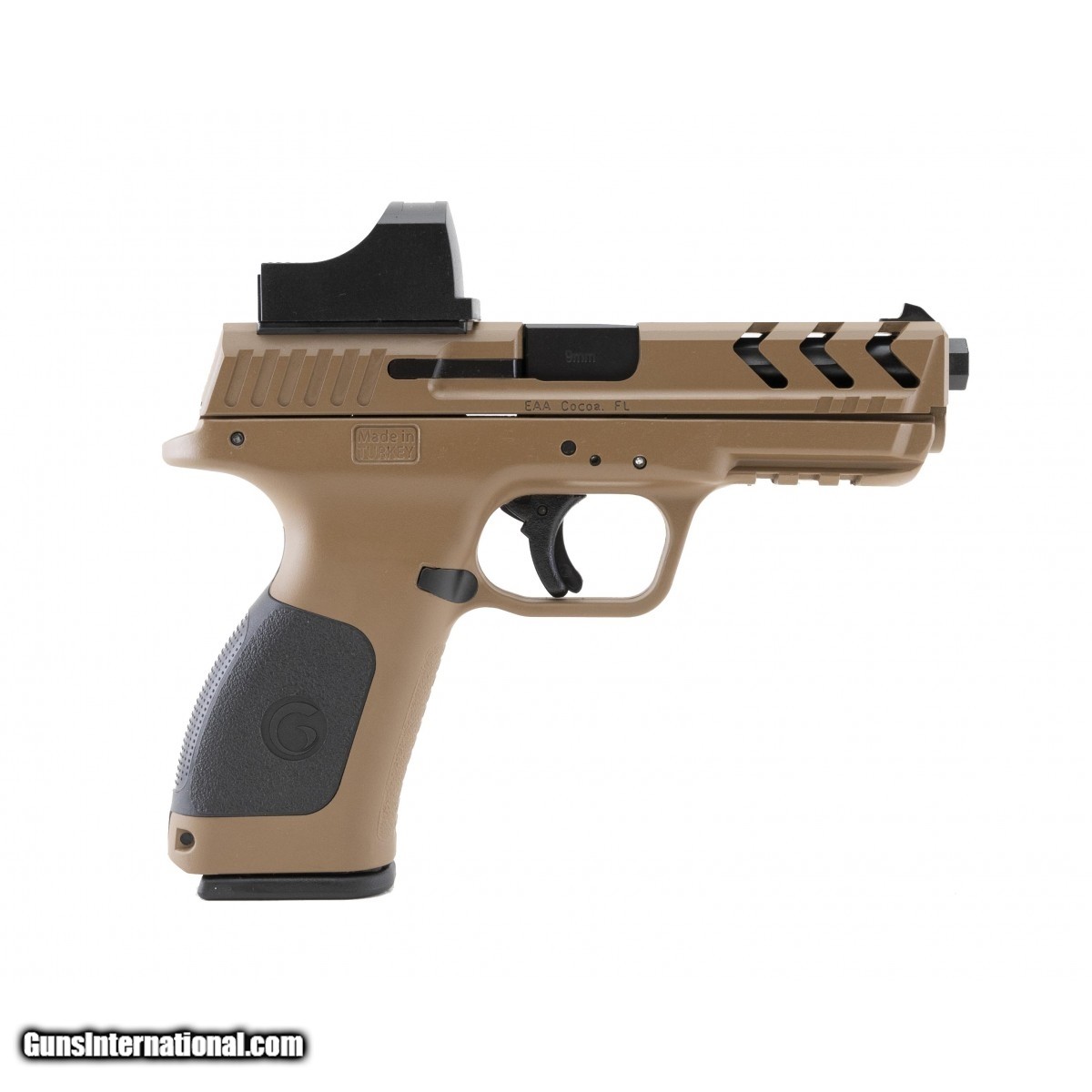 Description: " FDE polymer striker fired pistol with trigger safety, included red dot optic mounted to slide and slide porting with picatinny rail on frame. Excellent condition. SOLD |