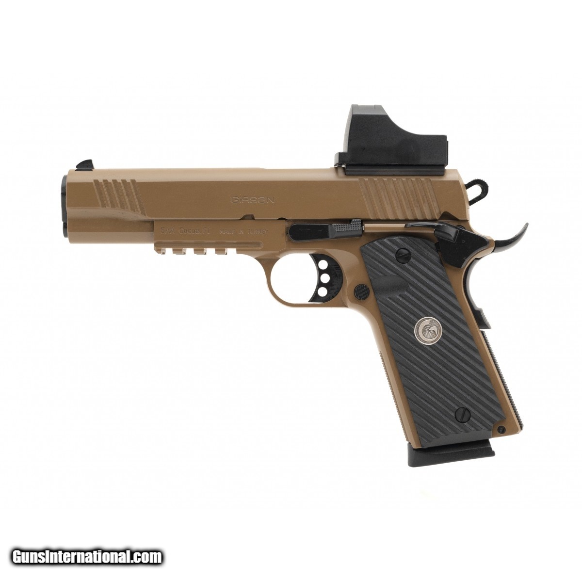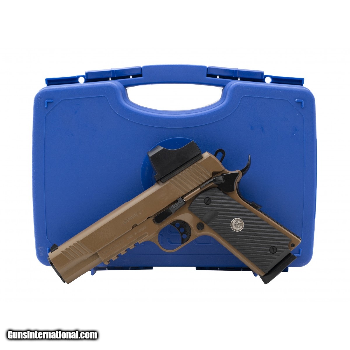 Full size Government model with 5"" barrel and FDE Cerakote finish. Has accessory rail, extended beavertail, checkered front and backstrap and mounted red dot optic. NEW UPC: 741566903588