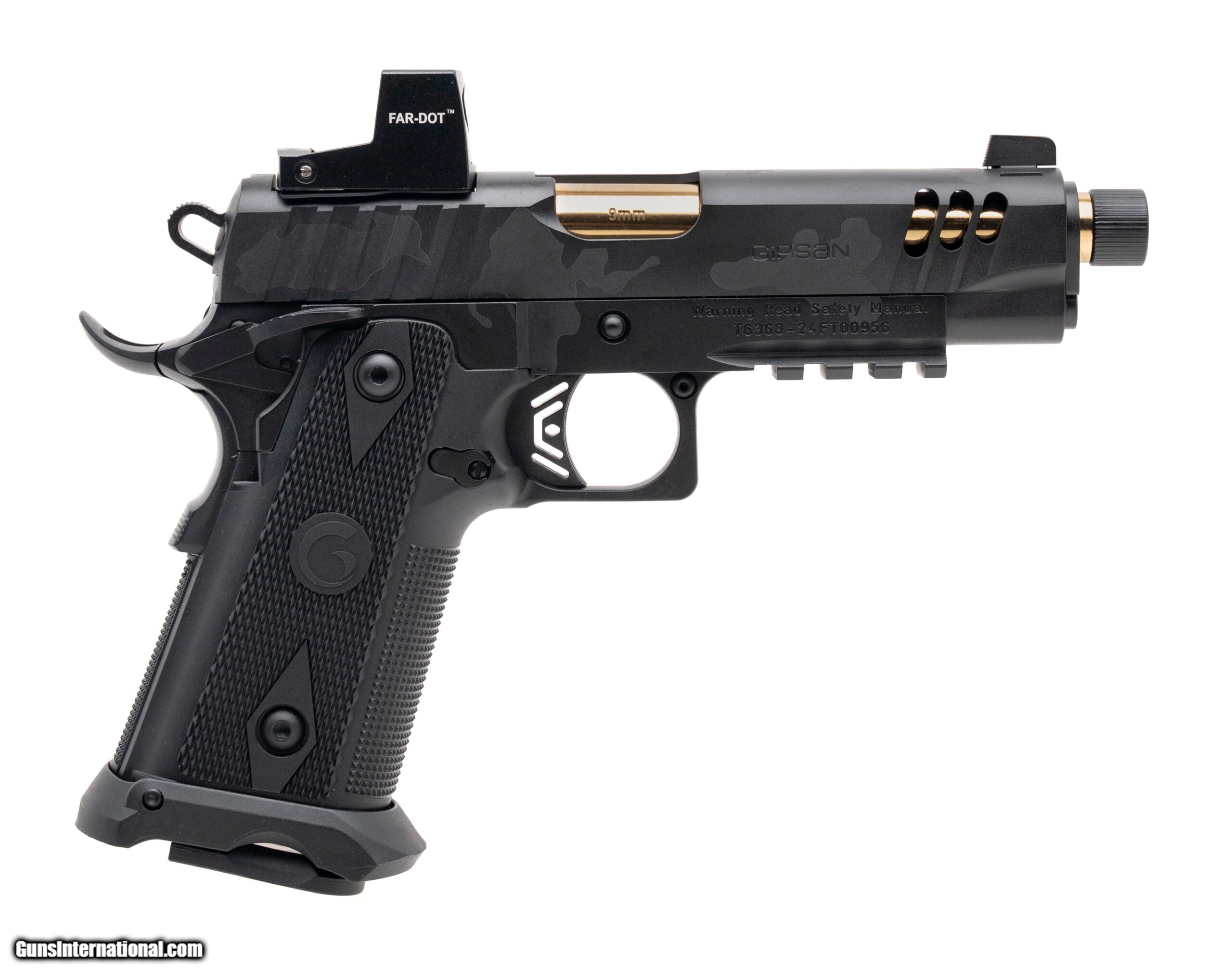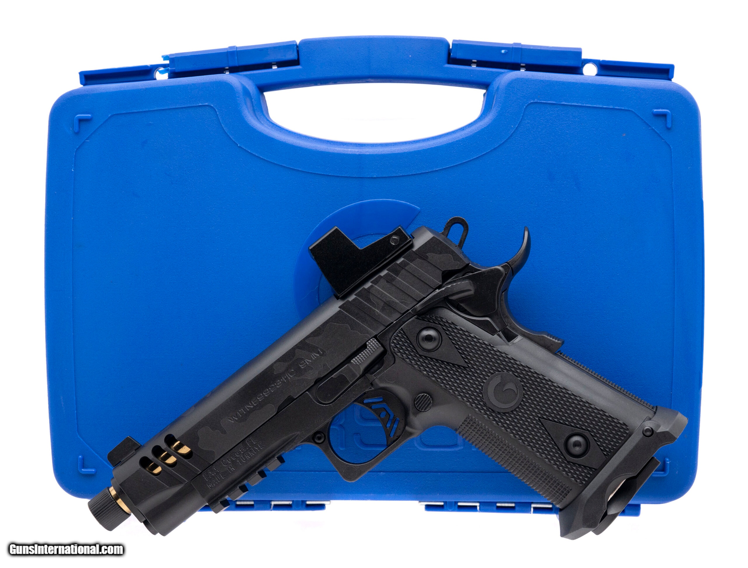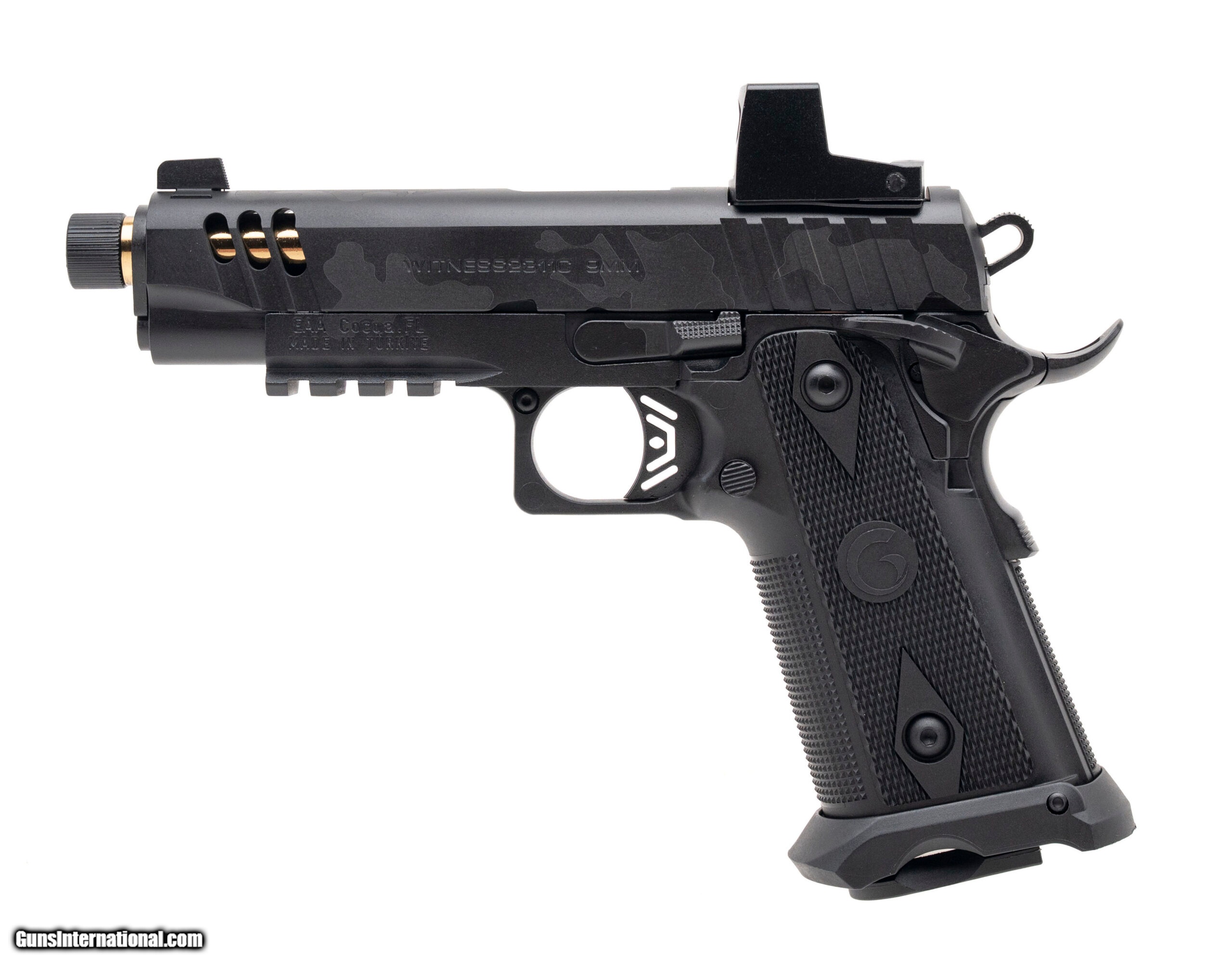 Description: "Turkish Made Double Stack 1911 Style Pistol with a 4.5"" Threaded Barrel. Black Camo Cerakote Finish, Steel Frame, Far-Dot Reflex Sight, Flared Magwell, and Accessory rail. Includes 1-17rd Magazine. NEW. UPC: 741566907319 SOLD |