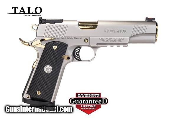 Description: EAA GIRSAN 1911NEG 38SUP 5TT 9 TL 390399 EAA GIRSAN 1911NEG 38SUP 5TT 9 TL 390399 In Stock--Ready to Ship!! Call for the best price!! The EAA Girsan MC1911S Negotiator is a semi?automatic 1911?style pistol chambered in .38 Super Auto +P with a 5?inch barrel and 9?round capacity. It features a steel frame and slide, external hammer action, ambidextrous safety, fiber?optic front sight, and an accessory rail for lights or lasers. The finish is a striking titanium nitride with gold accents, and it’s built on the classic 1911 single?action platform for target shooting and range use.