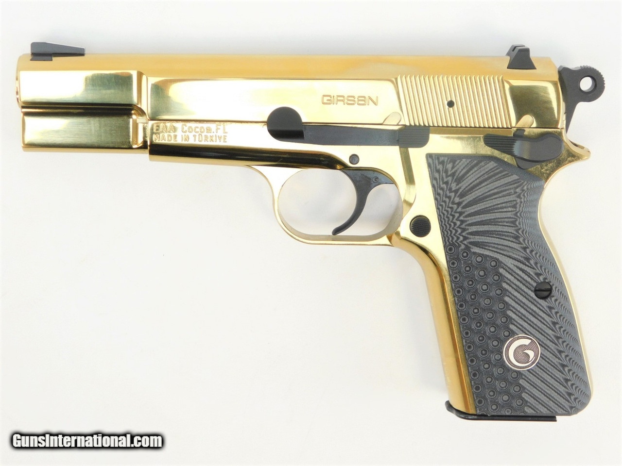 Description: Manufacturer: European American Armory / GiRSAN Model: Girsan MC P35 Gold SKU: 393488 Caliber: 9mm Luger Capacity: 15 Rounds Barrel Length: 4.6" Frame: Lightweight Alloy, Gold Plated Slide: Steel, Gold Plated Grips: G10 Sights: Adjustable - Rear, Fixed - Front Overall Length: 7.75" Ambidextrous Safety Weight: 2.10 lbs All items are factory new in box unless otherwise stated. Based on the information available to us, the above specifications describe this item to the best of our knowledge. For further information, please contact or visit the manufacturer's . SOLD |