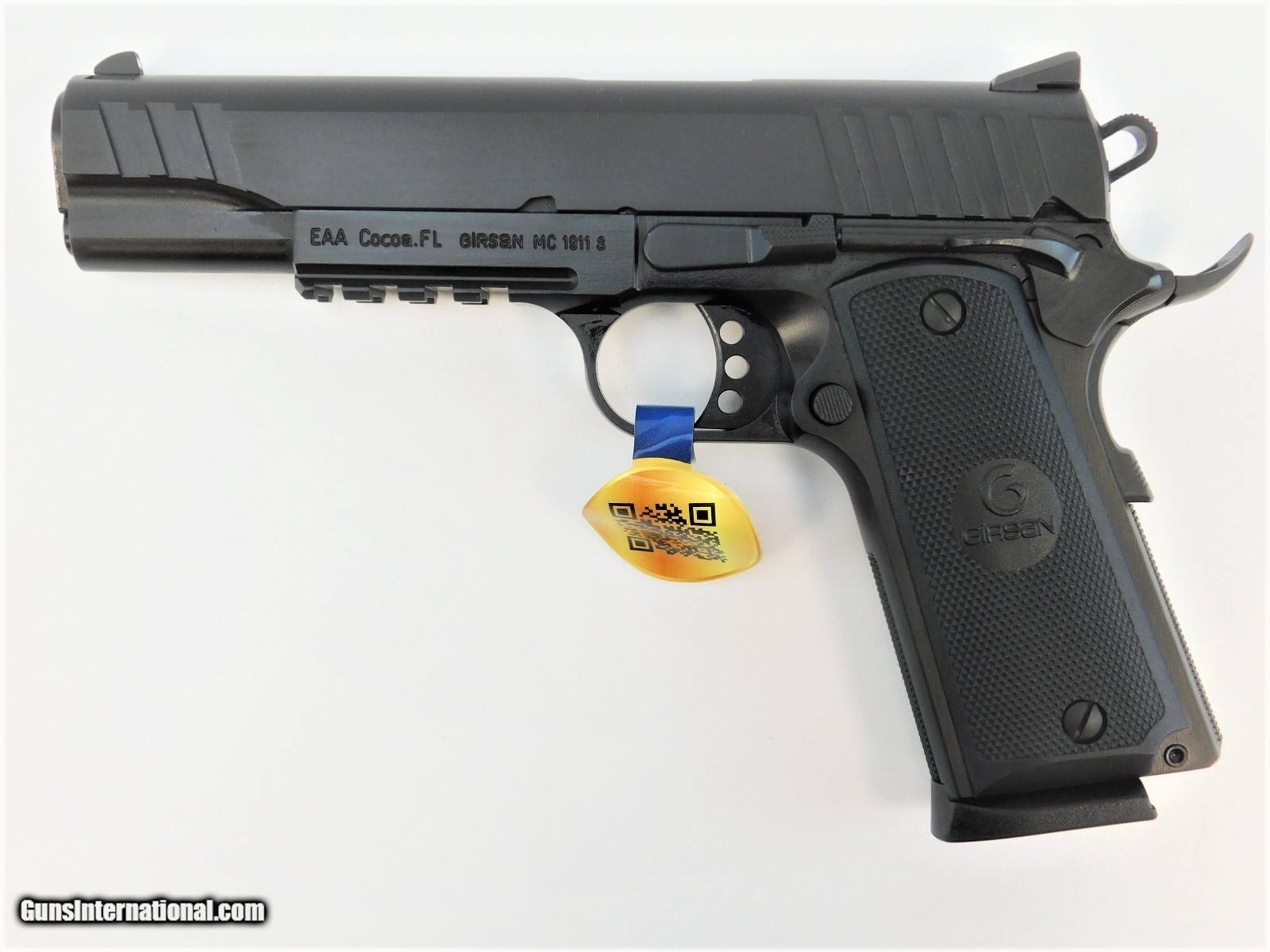 Description: BRAND NEW IN THE BOX AND READY TO SHIP! BUY IT NOW!! Manufacturer: European American Armory / GiRSAN Model: Girsan MC1911S "Reserve" SKU: 390031 Caliber: .45 ACP Capacity: 8 Rounds Barrel Length: 5" Frame: Steel Finish: Black Accessory Rail Grips: Black Checkered Polymer Sights: White 3-Dot Overall Length: 8.75" Weight: 2.55 lbs Much More Than Just Another 1911...."OK", you say, "Another 1911, big deal". Well, it is a big deal when you have a fully machined steel frame 1911 in three configurations, with a carry optics option or a MATCH option, that comes priced similar to the "big name" guy's basic model. So, before you "buy a name" and pay too much, take a look at the EAA / GiRSAN 1911 line up and don't forget, they have a limited LIFETIME warranty. KNOW YOUR LOCAL AND STATE LAWS!! ORDERS WILL ONLY BE ACCEPTED FROM US RESIDENTS OF THE LOWER 48 STATES, ALASKA AND HAWAII. OUR FFL CLASS DOES NOT ALLOW FOR THE EXPORT OF FIREARMS, THEREFORE WE CANNOT SHIP OUT OF THE US. IF YOU ARE INTERESTED IN PURCHASING THIS ITEM, PLEASE COMPLETE YOUR ORDER BY REFERRING TO THE "SELLER'S INFORMATION" ABOVE. SOLD |