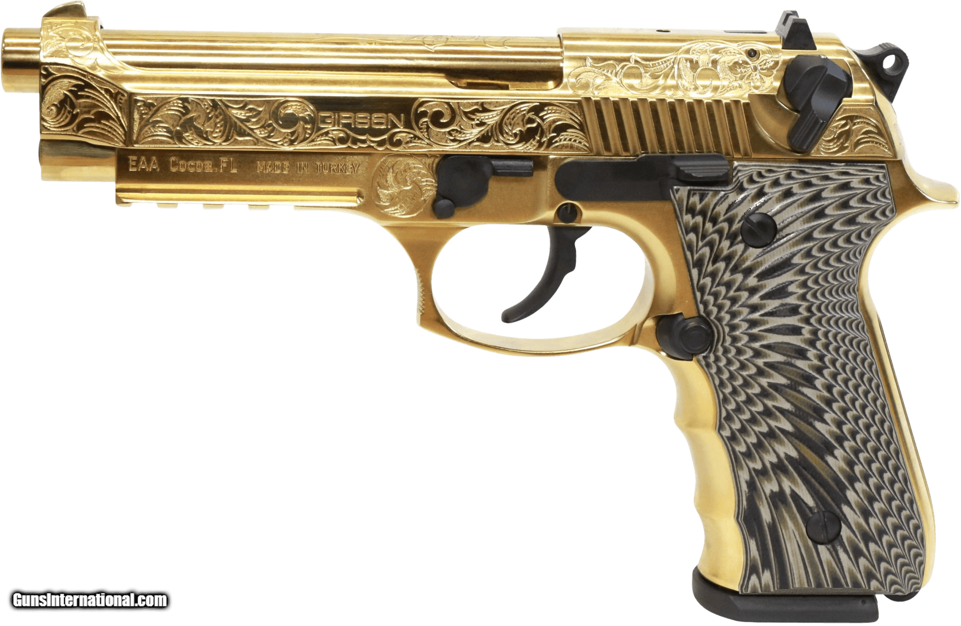 Description: Guns Listing ID: 1352776 This handgun has a 4.9\" barrel, one 18 round magazine, G10 grips, and an ambi safety. SOLD Manufacturer: EAA Model: Girsan Regard MC Deluxe Caliber Info: 9MM LUGER (9X19 PARA) Condition: Used - Non-Certified Barrels: 4.9 BARREL Finish: GOLD PLATED |