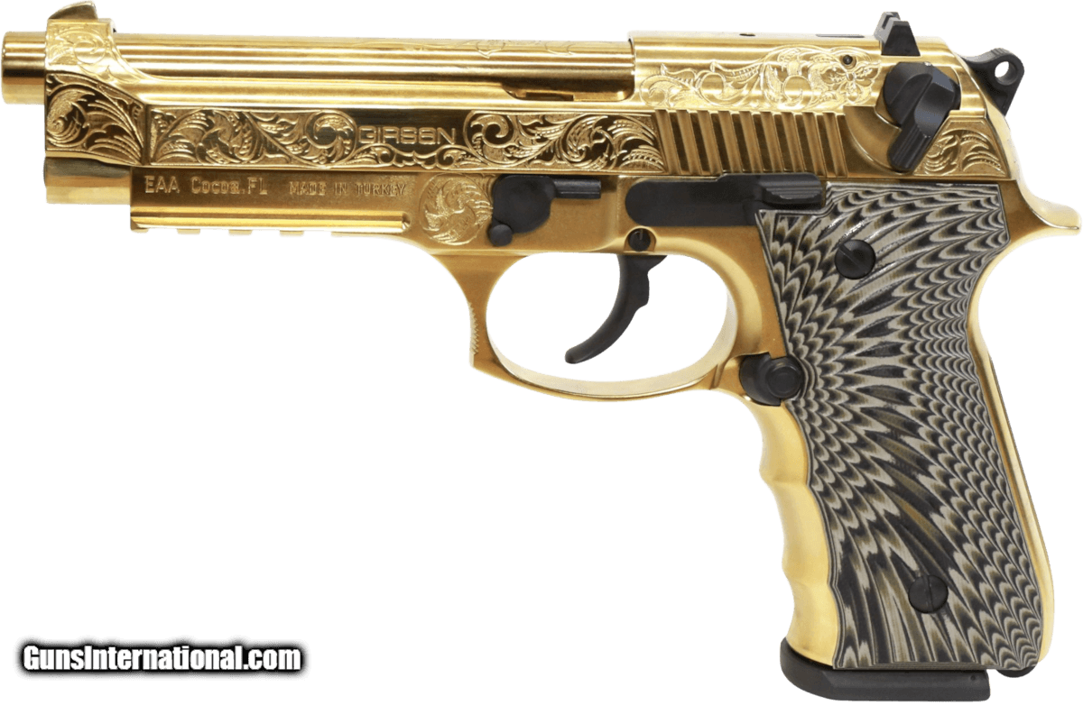 Description: Guns Listing ID: 273122 The Regard MC Deluxe is the newest model from the Regard MC series. This gold plated pistol features a hand-engraved design, along with an ambi safety, drift adjustable sight, accessory rail, and decocker. SOLD Manufacturer: EAA Model: Girsan Caliber Info: 9MM LUGER (9X19 PARA) Condition: new Barrels: 4.9" barrel Finish: GOLD PLATED |