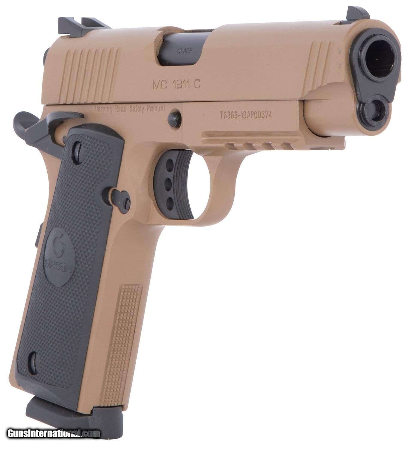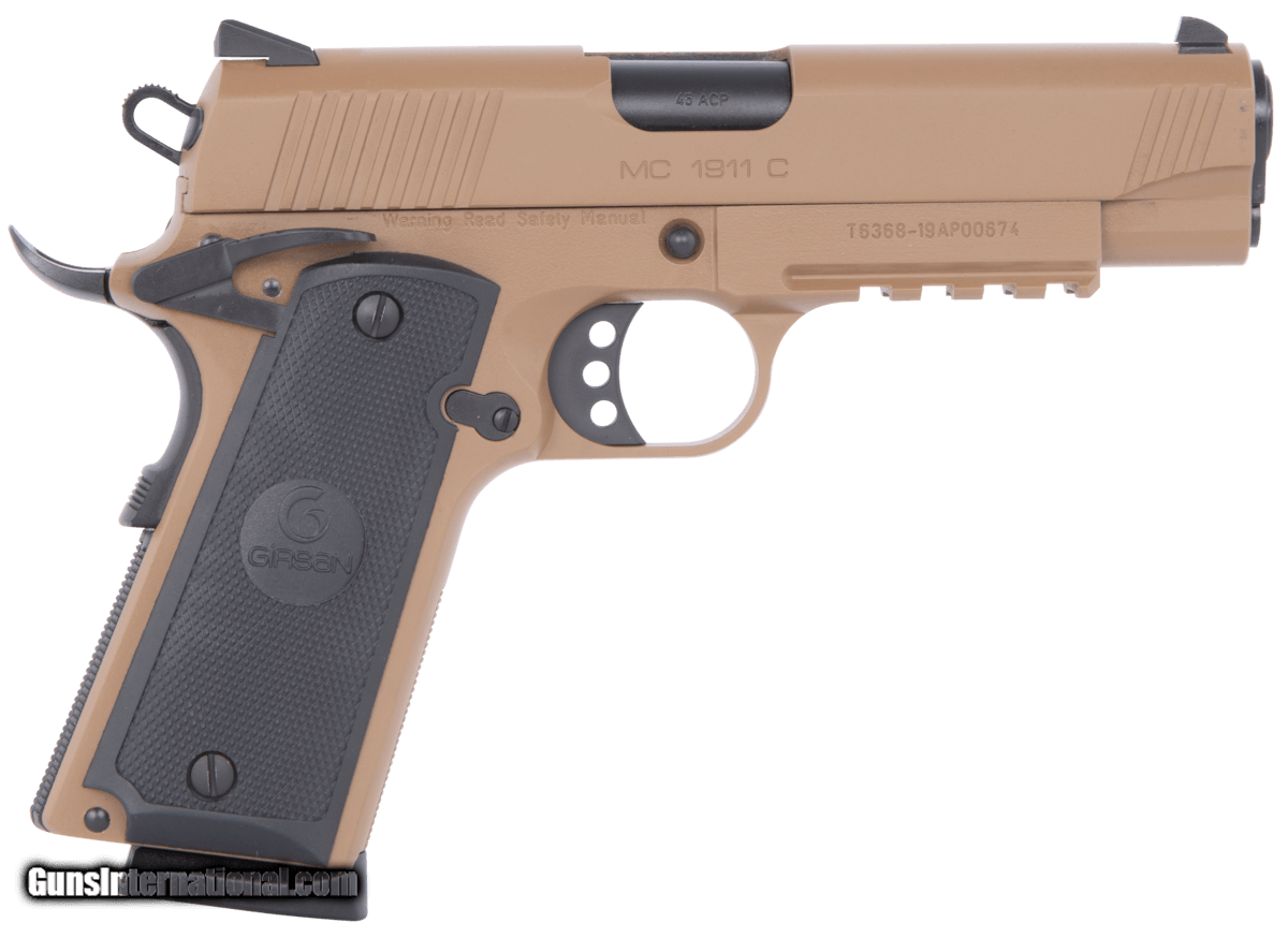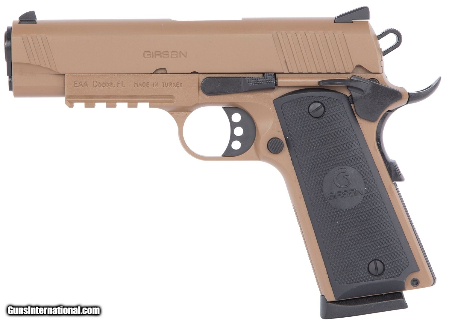Description: Guns Listing ID: 282907 This model of the Girsan MC1911 Commander version features a checkered grip ambidextrous safety and 3.5 to 4 lbs trigger. It also features Novak style rear sight extended beaver tail under barrel accessory rail steel machines frame and slide and deep slide serrations. It has a 91 capacity and a 4.4 barrel.\ SOLD Manufacturer: EAA Model: GIRSAN Caliber Info: 9MM LUGER (9X19 PARA) Condition: new Barrels: 4.4 BARREL Finish: FLAT DARK EARTH |