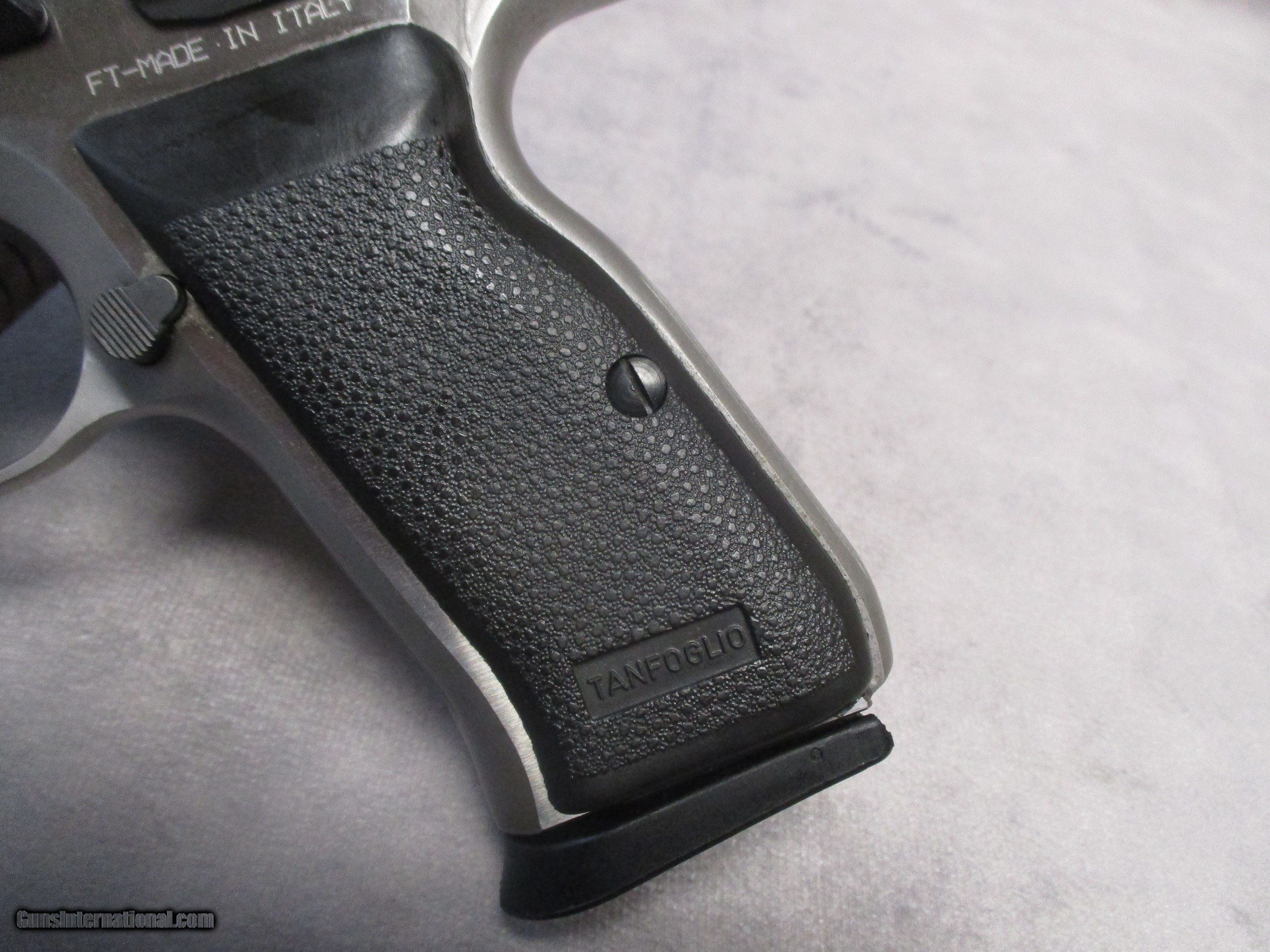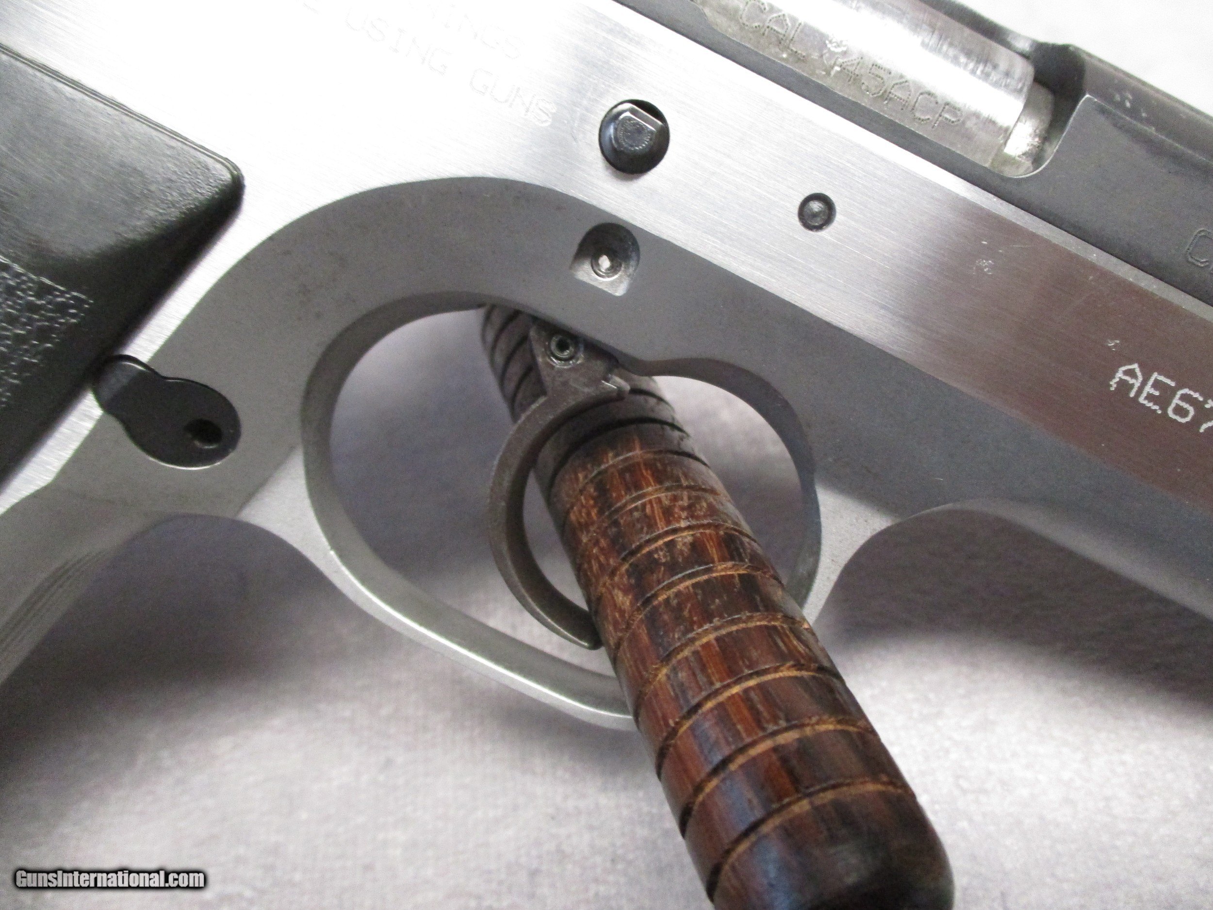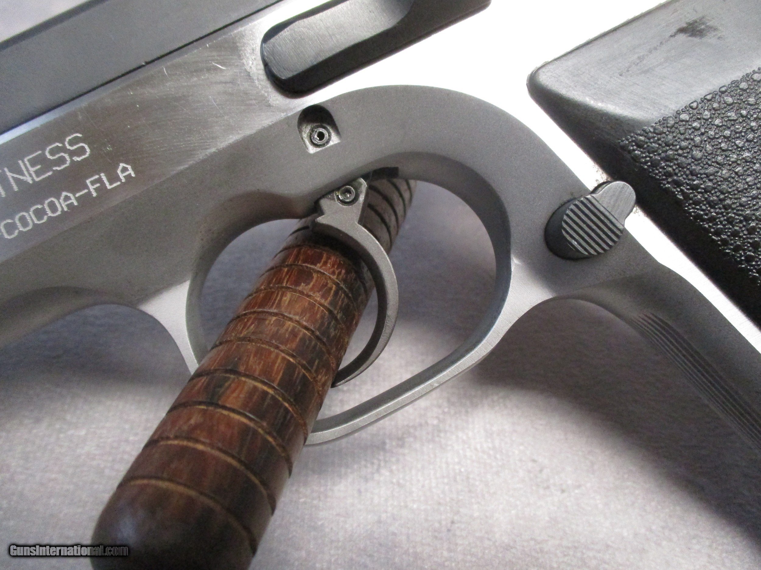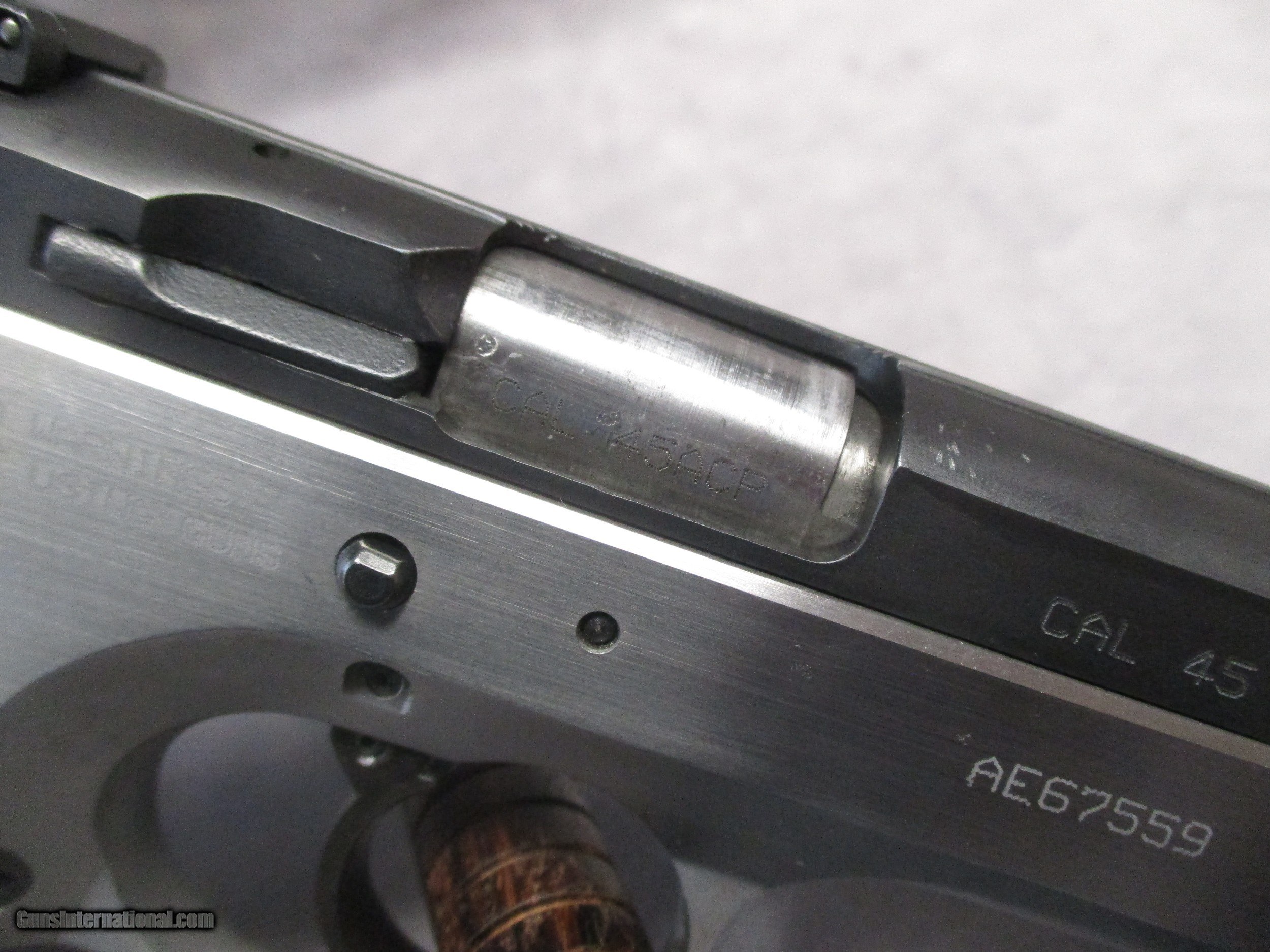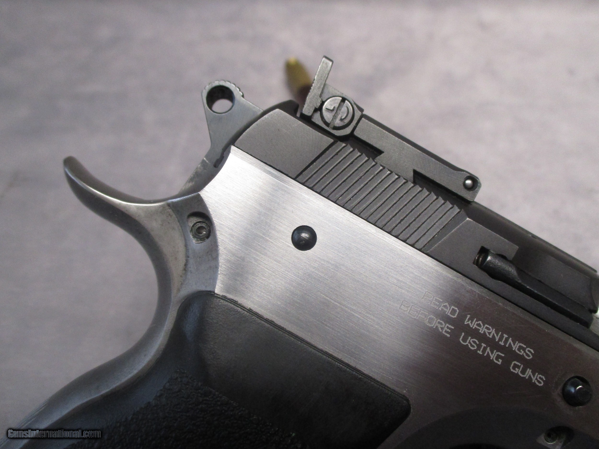 Description: The EAA/Tanfoglio Witness is an excellent pistol based on the famous CZ 75. This example sports a duo tone finish, fully adjustable rear sight, rubber grips, and is chambered for the legendary .45 ACP, well-known for its stopping power. This example is used, and exhibits fairly light pitting on the frame but not on the slide. The bore is in excellent shape, if a little dirty, with no rust or pitting. Mechanically, the Witness is in excellent shape. It comes with three ten-round magazines. Please note that this the DA/SA version of the pistol. It is NOT the SA only Match version despite the similar appearance. There is no factory box or manual though it does come with a small hard case. As it is based on the CZ 75, the Witness is a very accurate and reliable pistol. In fact, Tanfoglio pistols based on the Witness have been utilized by some of the world’s top competition shooters. As an example, the I.P.S.C. World and European Championship has seen seven consecutive victories by Tanfoglio’s competition models. This pistol would make an excellent target pistol but can double as a home-defense gun very easily. SOLD Handgun Caliber: .45 ACP (.45 Auto) Manufacturer: EAA/Tanfoglio Model: Witness Serial Number: AE67559 Bore: Rifled Ejectors: Auto-ejection Condition: Good Barrel Type: Standard Action: Semi-Auto, Short recoil, Locked Breech Triggers: DA/SA crescent moon trigger Stock: Rubber grips Finish: Blued (slide), Stainless Steel (Frame) Sights: Fully adjustable rear sight, integral front sight, sight radius 6.9375 inches (176 mm) Extras: 2 spare mags for a total of 3 Case: Hard case |