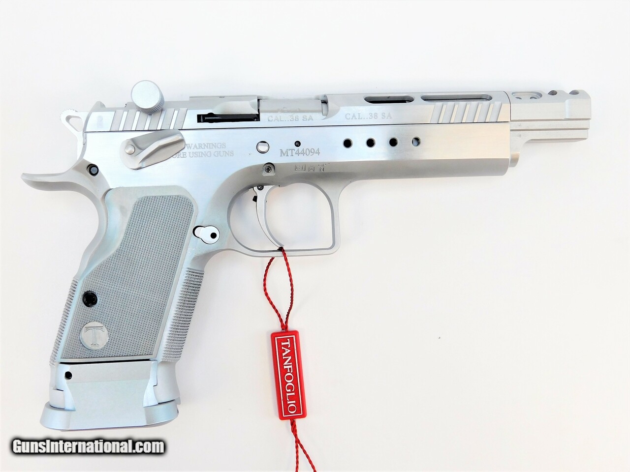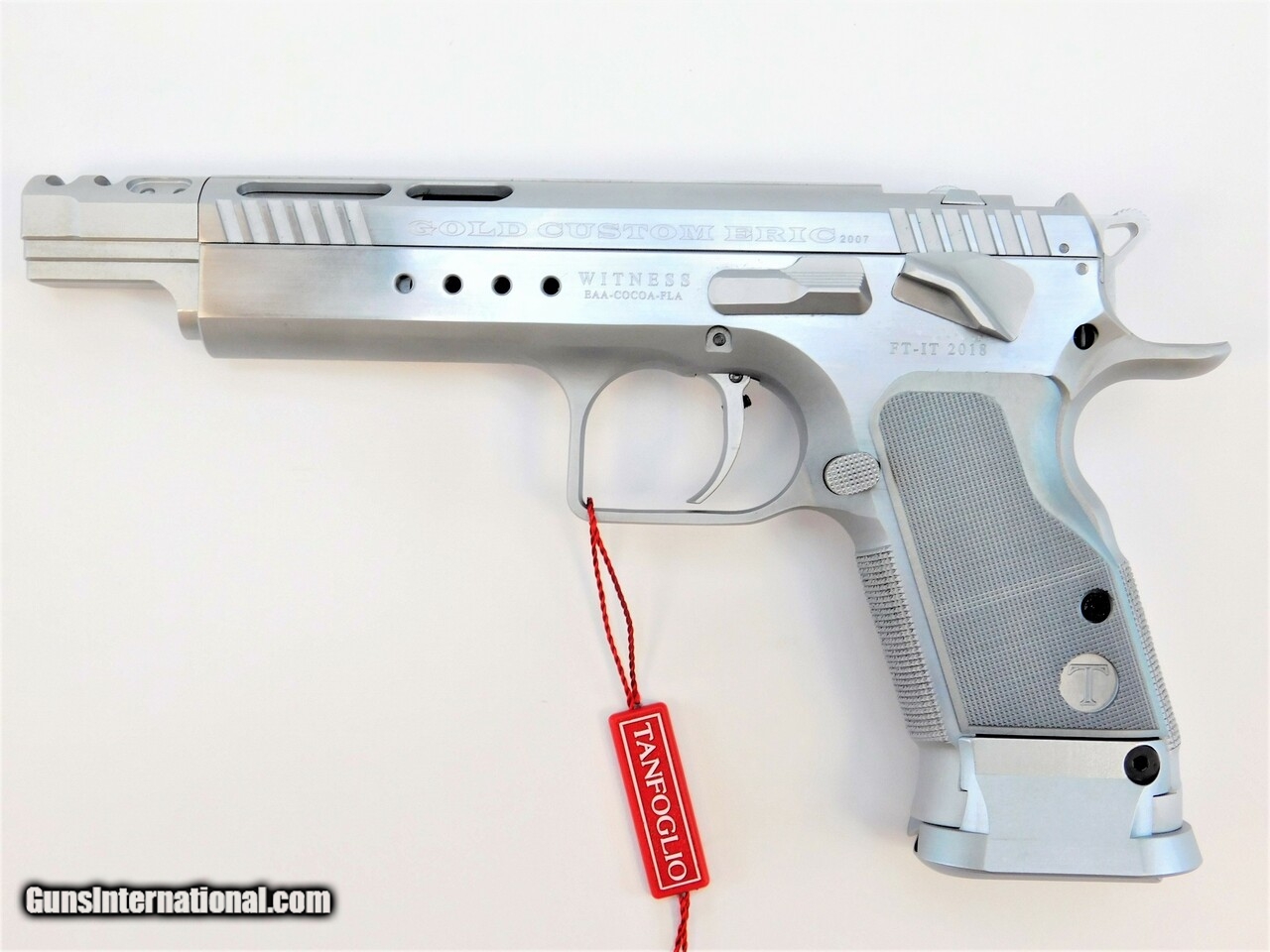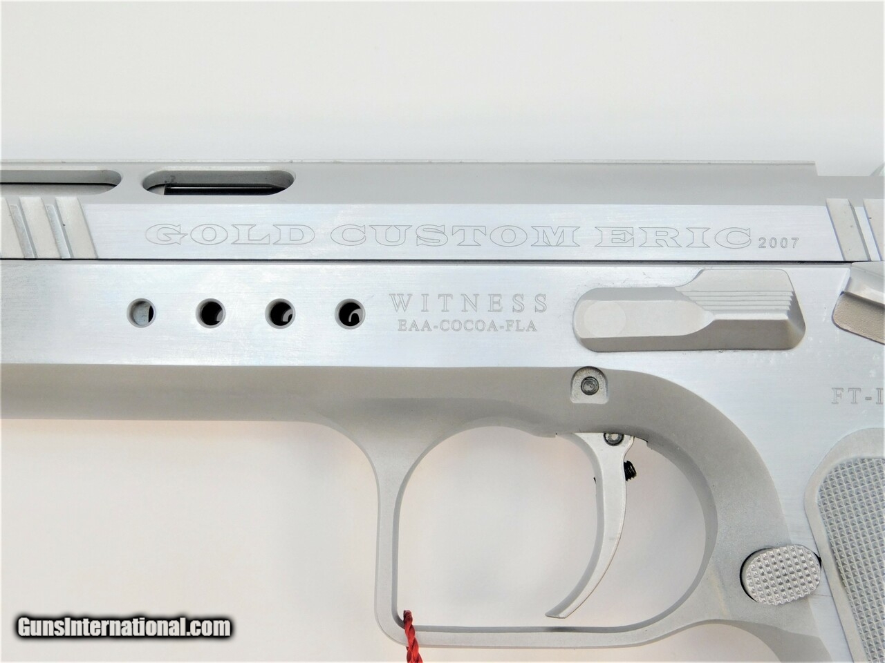 Description: Manufacturer: EAA (European American Armory Corp.) Model: Tanfoglio Witness Elite Gold Team SKU: 600095 Caliber: .38 Super Barrel Length: 5.25" Ported Frame: Competition Finish: Chrome Capacity: 17 Rounds Overall Length: 10.5" Weight: 2.56 lbs Grips: Aluminum, Checkered Front and Backstrap Sights: Adjustable From our Witness Elite Series by Tanfoglio, the Gold Team is the perfect open division competition pistol for those wanting to use optics or red dot mounts. The sleek chrome finish and Italian design make this pistol stand out in a crowd. The Gold Team is equipped well beyond other comparably priced firearms. It is also a joy to handle and shoot. From the strategic checkering, the heart shaped hammer and aluminum grips, there’s plenty to love with the Gold Team. SOLD |