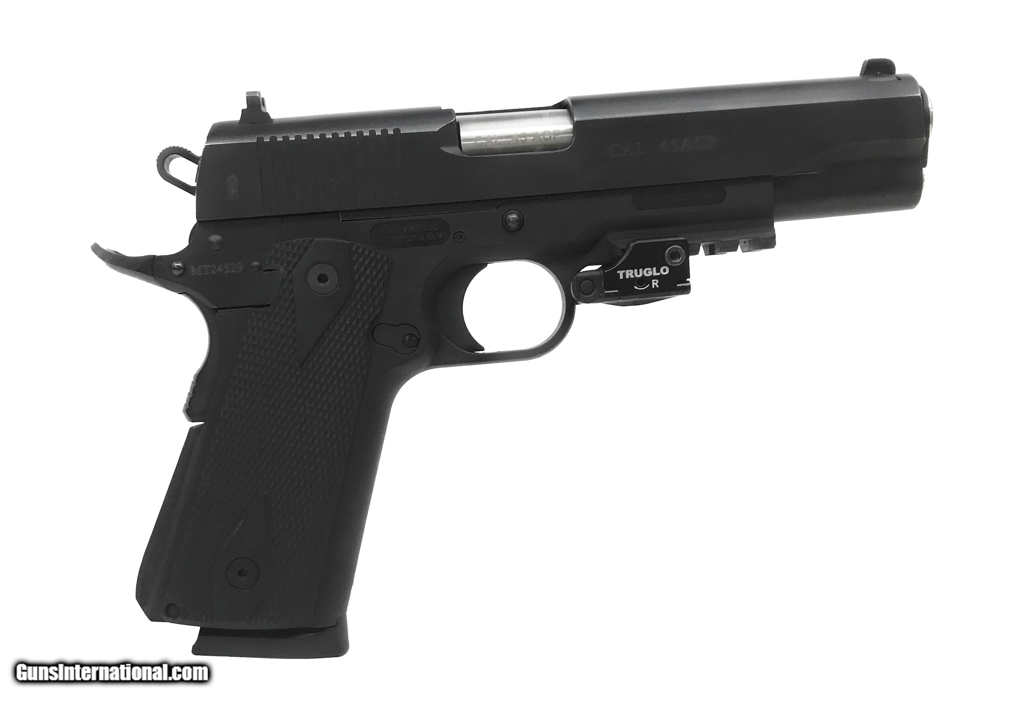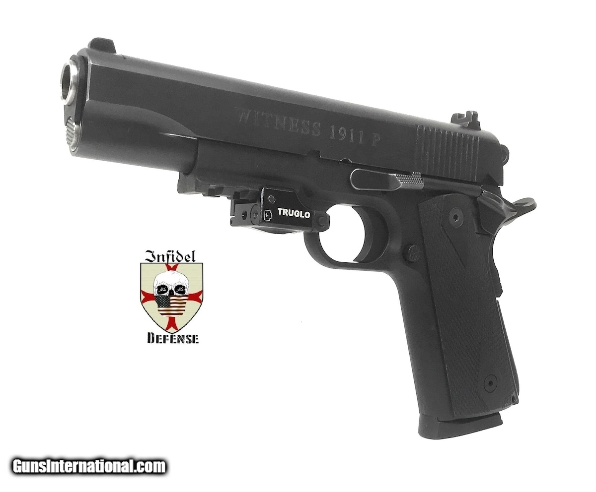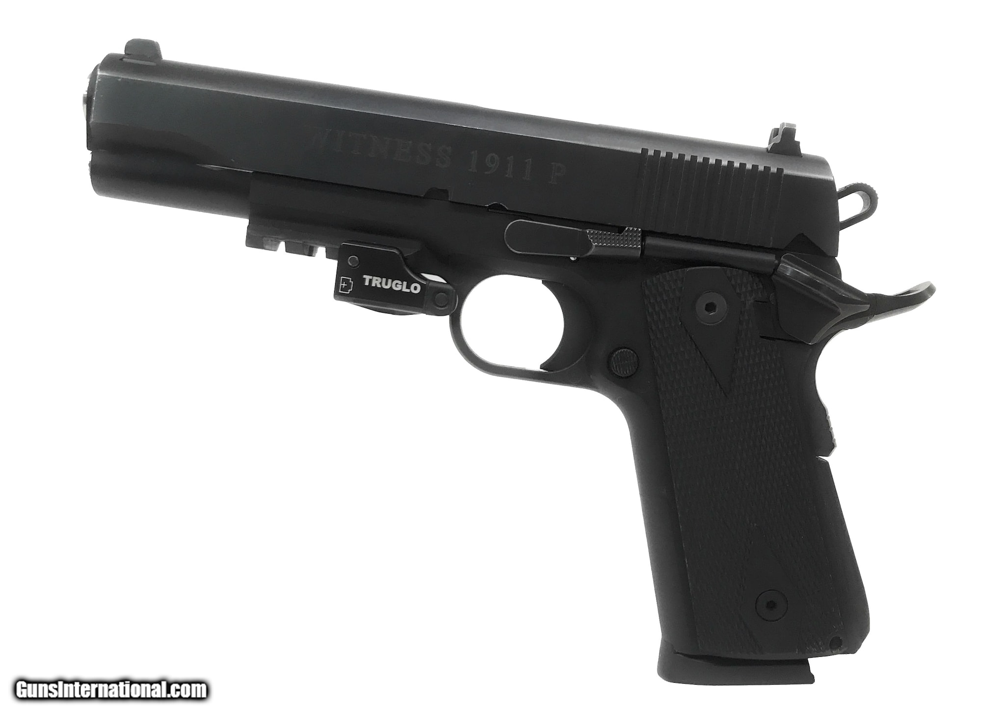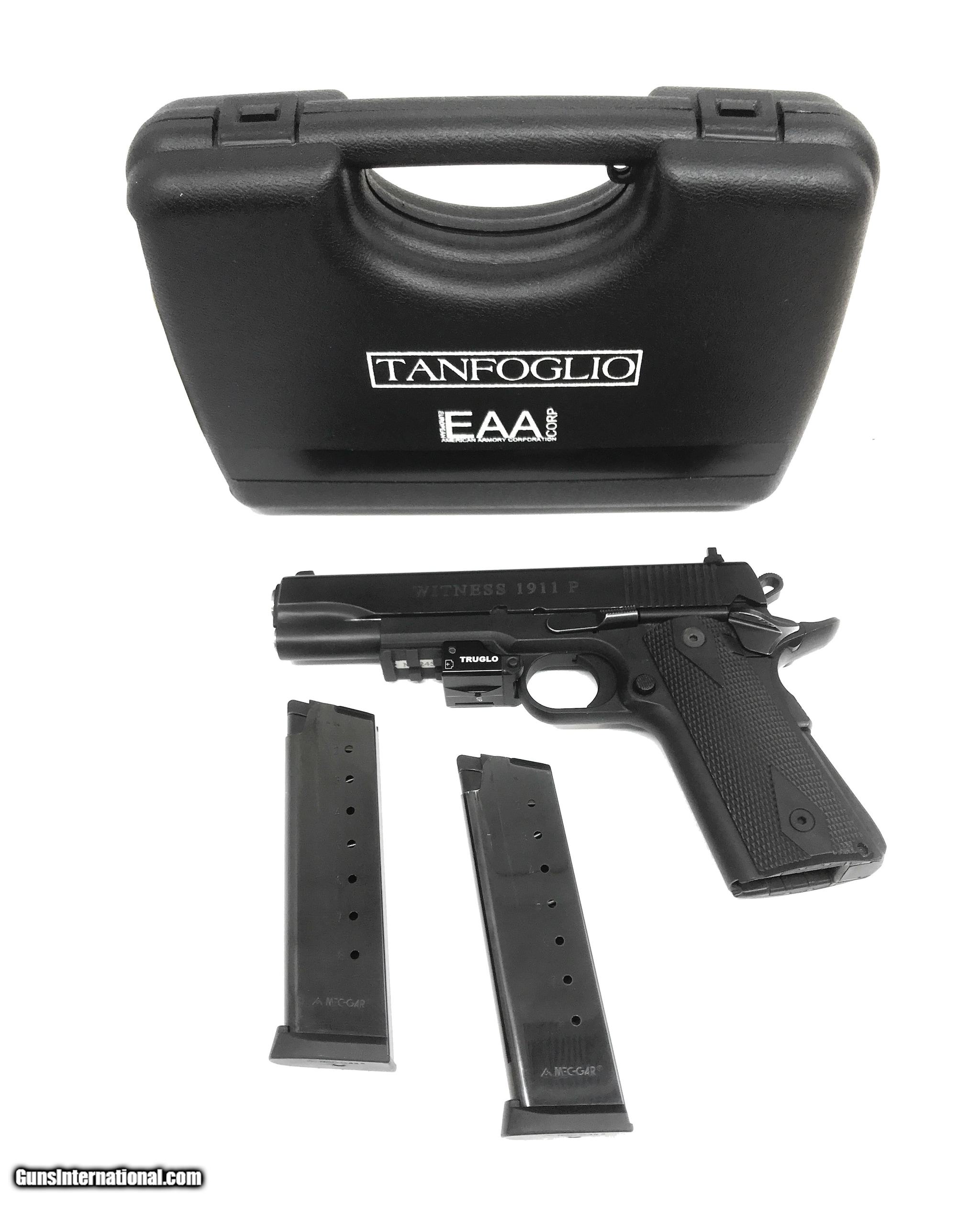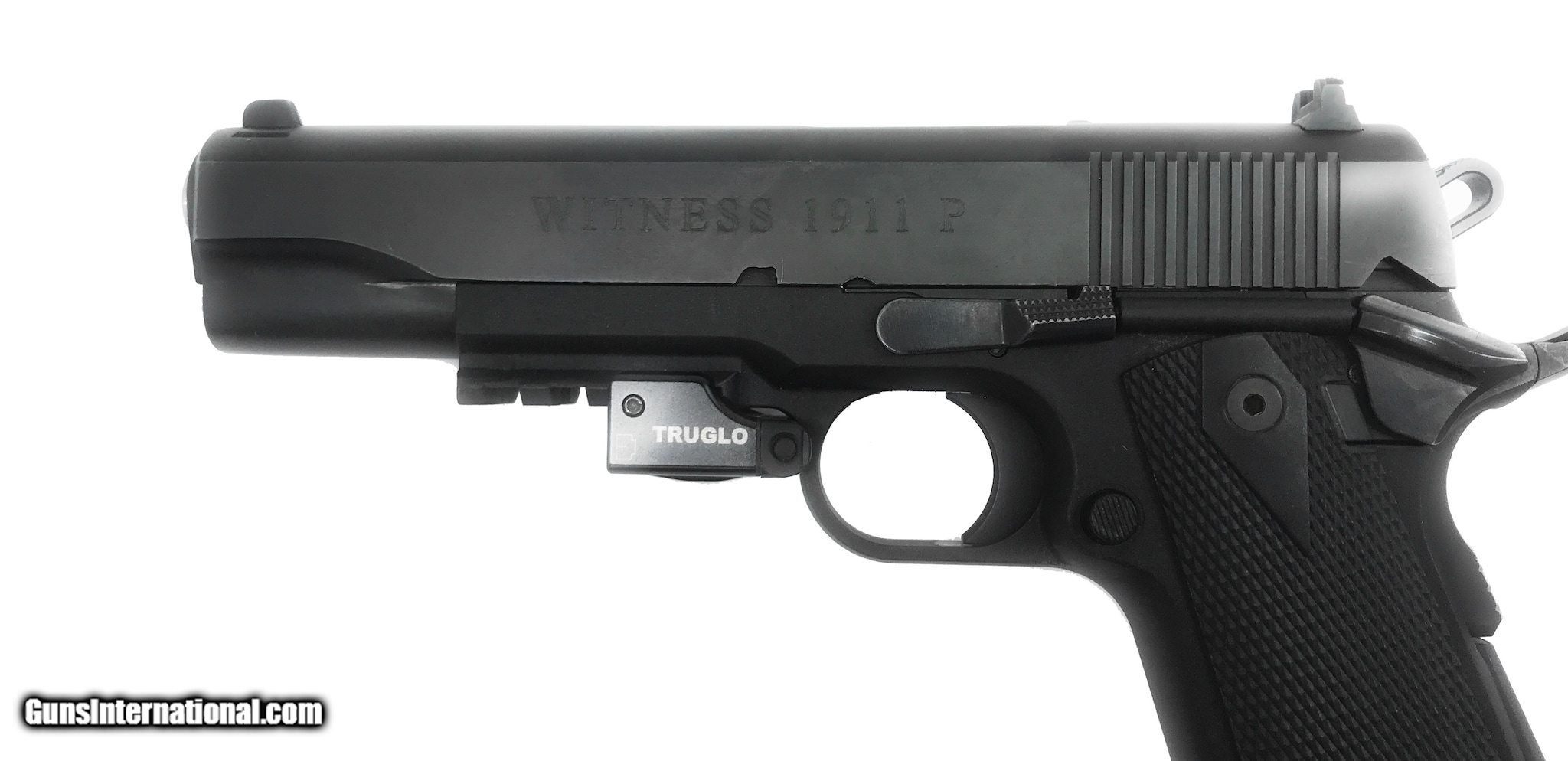 Description: Guns Listing ID: 738925 Manufacturer: EAA (European American Armory) Model: Witness 1911P Type: Semi Automatic Pistol Caliber: 45 ACP Serial No.: MT24529 Capacity: 8+1 (Two Magazines) Safety: Manual Thumb Safety Barrel Length: 5\" Front Sight: Adjustable Post Rear Sight: Fixed Notch Action: Single Action Grip: Black Plastic Grips Slide Material: Steel Frame Material: Polymer Slide Finish: Blued Frame Finish: Black Polymer Frame size: Full Size Overall Length: 8.58\" Weight: 32 oz SKU: 22070045 TRUGLO Laser Installed stainless Steel Recoil Spring Coil Two 8 Rounds Magazines SOLD Manufacturer: EAA Model: Witness 1911P Caliber Info: .45 ACP Condition: Used - Non-Certified Barrels: 5 BARREL Finish: BLACK |