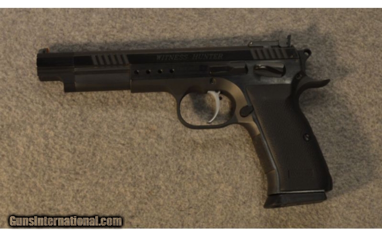 Description: This is a pre-owned Tanfoglio EAA Witness Hunter in 10mm with a 6” barrel. It features a competition hard chrome frame, 15 shot magazine, tapered cone slide/barrel lock up, drilled and tapped, single action, and an extended manual safety. This handgun is in excellent condition showing very little visible wear, there is just some bluing rubbed off of the corners at the muzzle. SOLD Caliber Info: 10mm Metal Condition: Excellent condition. Wood Condition: Excellent condition. Bore Condition: Clean with bright lands. Barrels: 6” Stock: Factory rubber grips. Weight: 2 ¾ lbs. Sights: Adjustable rear with fixed front. Extras: Comes with 1 factory 15 round magazine. Item Location: Glendale, AZ |