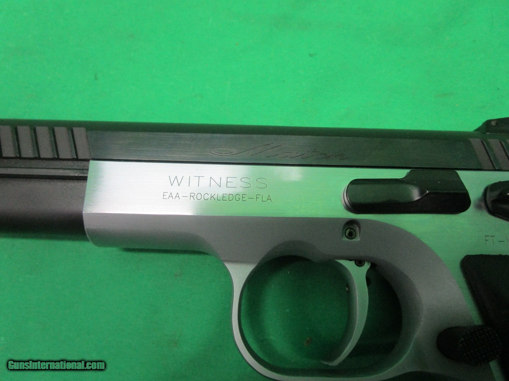 Description: Guns Listing ID: 864312 We have a used EAA Witness Match semi-automatic pistol for sale. This is chambered in 10mm with a 4.8\" barrel. It comes as shown in pictures with with two magazines and factory case. This is in Excellent Used Condition. Overall we would grade at approx 98%. Check out the pictures and feel free to call or email with any questions. SOLD Manufacturer: EAA Model: WITNESS MATCH Caliber Info: 10MM Condition: Used - Non-Certified Barrels: 4.8 BARREL Finish: BLACK AND STAINLESS |