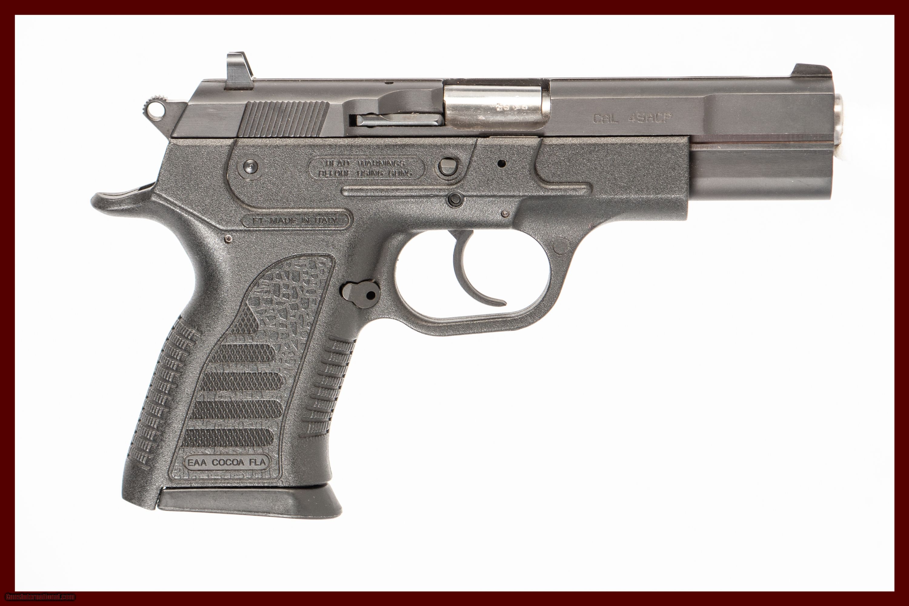 A EAA Witness-p chambered in 45 ACP with a 4 1/2 inch barrel with a bright and shiny bore. This firearm is in excellent condition and is covered by Dury's Lifetime Warranty.