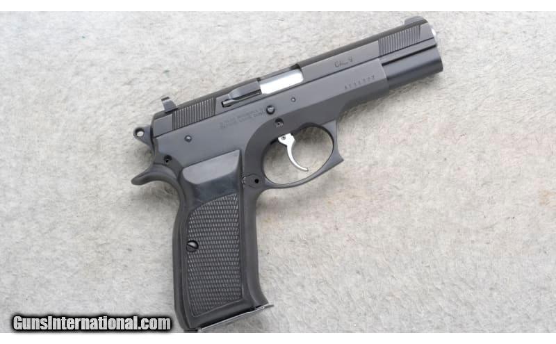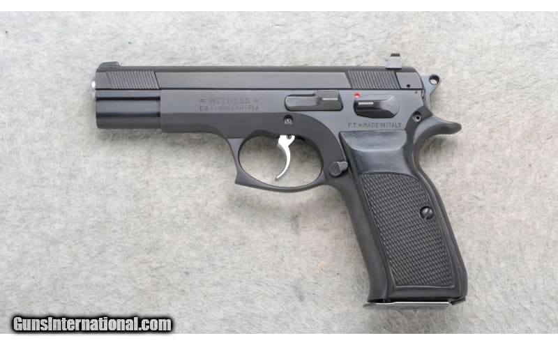 Description: This F.T./EAA Model Witness is a right hand semi-auto pistol in 9mm Cal. It has a 4.5 inch barrel with a front and rear serrated slide. A blade front sight and notch rear sight with white sight dots. The grip is a checkered black rubber. The front and back straps are grooved. It has a ringed serrated hammer. 9mm Parabellum SOLD Chambers: 15 round magazine. Metal Condition: Very Good. Bore Condition: Very Good. Barrels: 4.5 inch barrel with a front and rear serrated slide. Triggers: SA/DA Weight: 42 oz. Sights: Blade front. Notch rear. White sight dots. Item Location: Richfield, WI |