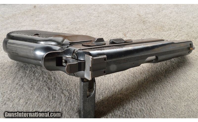 Description: This is a good quality pistol at a fair price. The pistol is a High Power knock off and looks and feel good. The pistol has a 4.5" barrel and hard rubber grips. The trigger is smooth in both single and double action. All in all a very nice pistol with some finish wear. 9mm Parabellum SOLD Chambers: Semi-auto. Metal Condition: Good to very good with minor wear and small scratches. Wood Condition: The checkered black grips are very good. Bore Condition: Very good. Barrels: 4.5" with sights on the slide. Triggers: Single silver color for single and double action. Weight: 36 oz. Sights: Raised notch rear and a blade front. Item Location: Owatonna, MN |