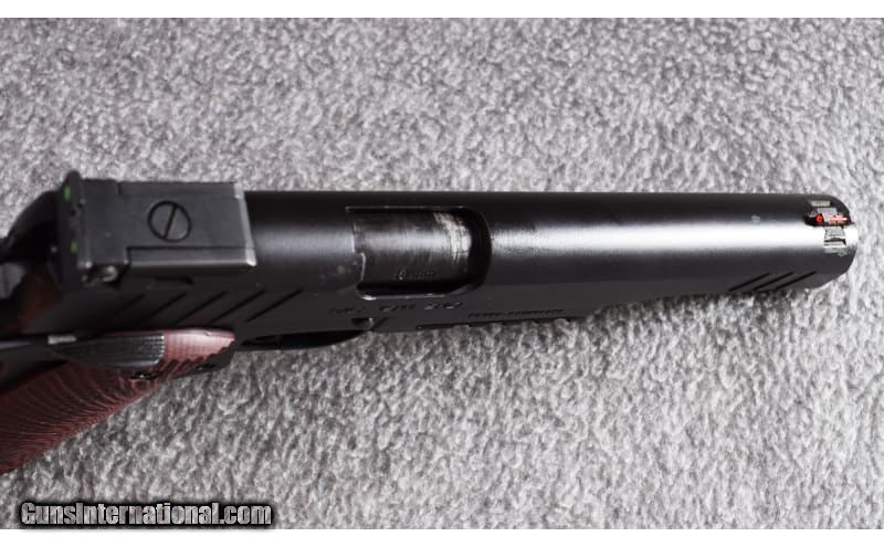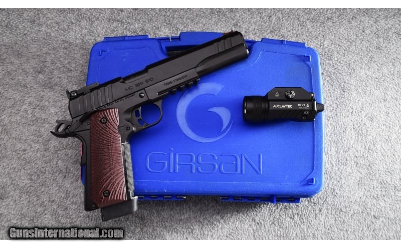 Description: This Girsan MC1911 in 10mm Auto is in excellent condition. It features a 6" long slide barrel with full length guide rod and ambidextrous safety. A checkering strip has been added to the front strap of the grip. This pistol will ship with the original hard case and a weapon light. One (1) eight round magazine included. 10mm Auto SOLD Metal Condition: Excellent Bore Condition: Excellent Barrels: 6 Triggers: Factory Weight: 3 lbs Sights: Fiber Optic Red Front - Serrated U Notch Rear With Green Dots Item Location: Wheeling |