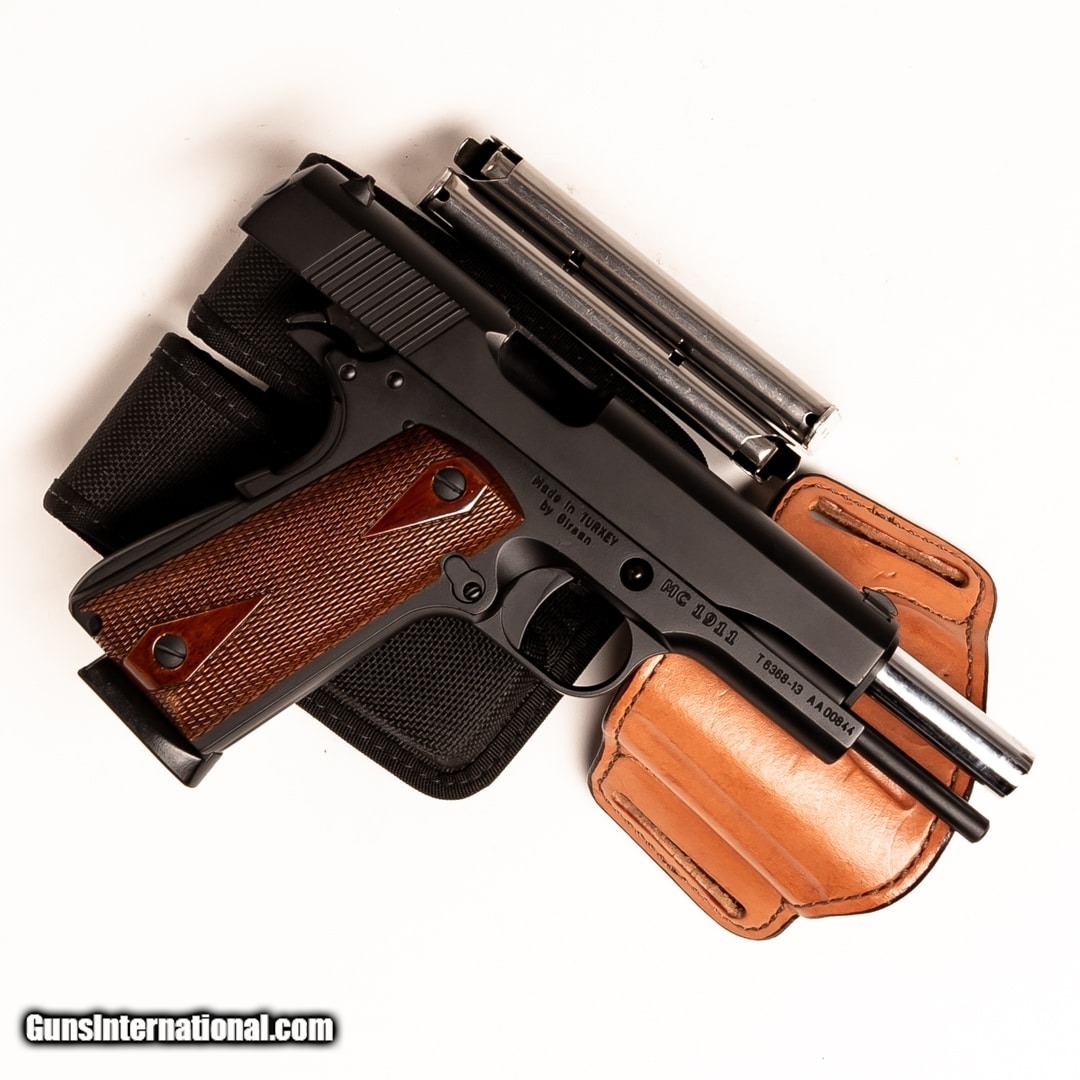 Description: Guns Listing ID: 616389 The Girsan MC1911 is a semi-automatic handgun with a short recoil operation system. It is crafted with a steel frame, CNC machined bar stock slide, and cold-forged barrel. Other features include user-friendly sights and thumb and grip safeties. This MC1911 comes with three magazines, a Bianchi leather holster, and a Bianchi mag pouch. SOLD Manufacturer: GIRSAN Model: MC1911 Caliber Info: .45 ACP Condition: Used - Certified Barrels: 4.4" BARREL Finish: BLACK |