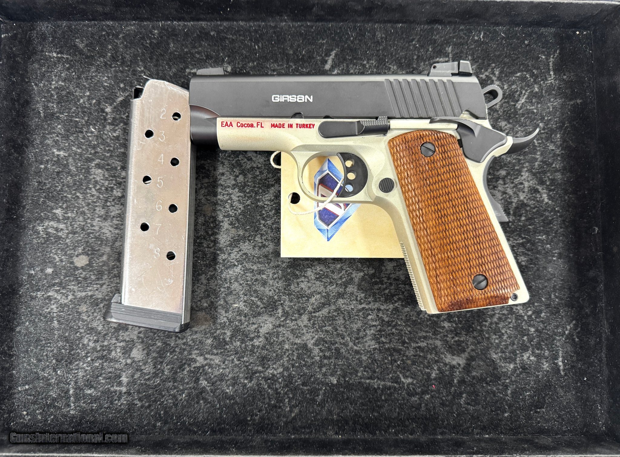 Description: Guns Listing ID: 558536 Girsan MC1911 SC two-tone compact .45 ACP, offering reliable 1911 performance in a sleek design. Comes with one 8-round magazine. SOLD Manufacturer: GIRSAN Model: MC1911SC Caliber Info: .45 ACP Condition: Used - Non-Certified Barrels: 3.4" BARREL Action: SEMI AUTOMATIC Finish: black and tan |