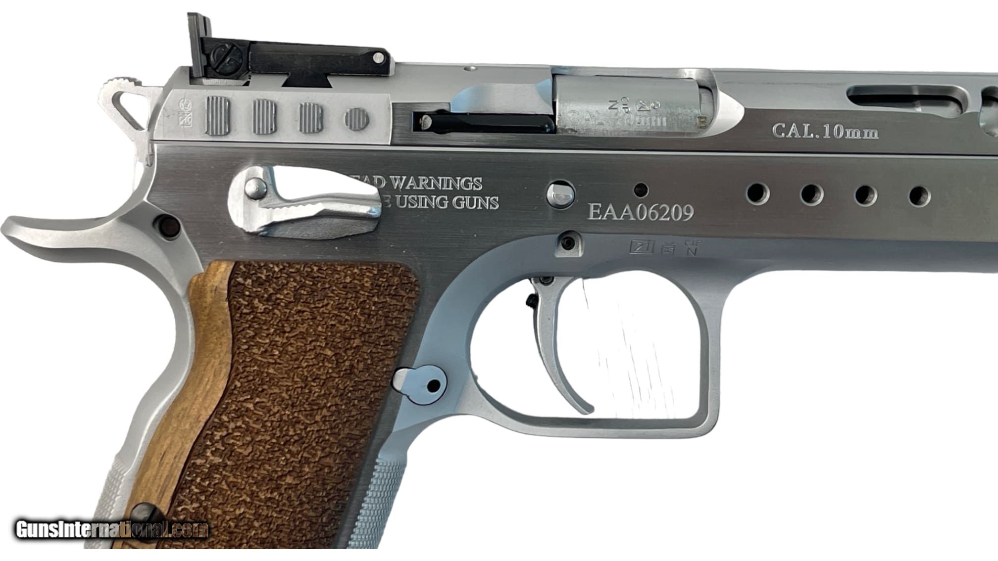 Description: Guns Listing ID: 814600 This listing is a for a used but LIKE NEW Tanfoglio imported by EAA model Witness Limited Customer semi-auto pistol chambered in 10mm. Pistol has a 4.75\" barrel, a 14rd magazine capacity, stainless finish, steel frame, wood grips, ported slide and frame, flared magwell, thumb safety, adjustable rear sight, and a front black sight. Overall pistol is in very good to almost like new condition with little sign of actual use/wear. Bore is bright and sharp. Listing includes original lockable case, original manual, and 1 14rd magazine. SOLD Manufacturer: TANFOGLIO Model: LIMITED CUSTOM WITNESS Caliber Info: 10MM Condition: Used - Non-Certified Barrels: 4.75 BARREL Finish: STAINLESS |