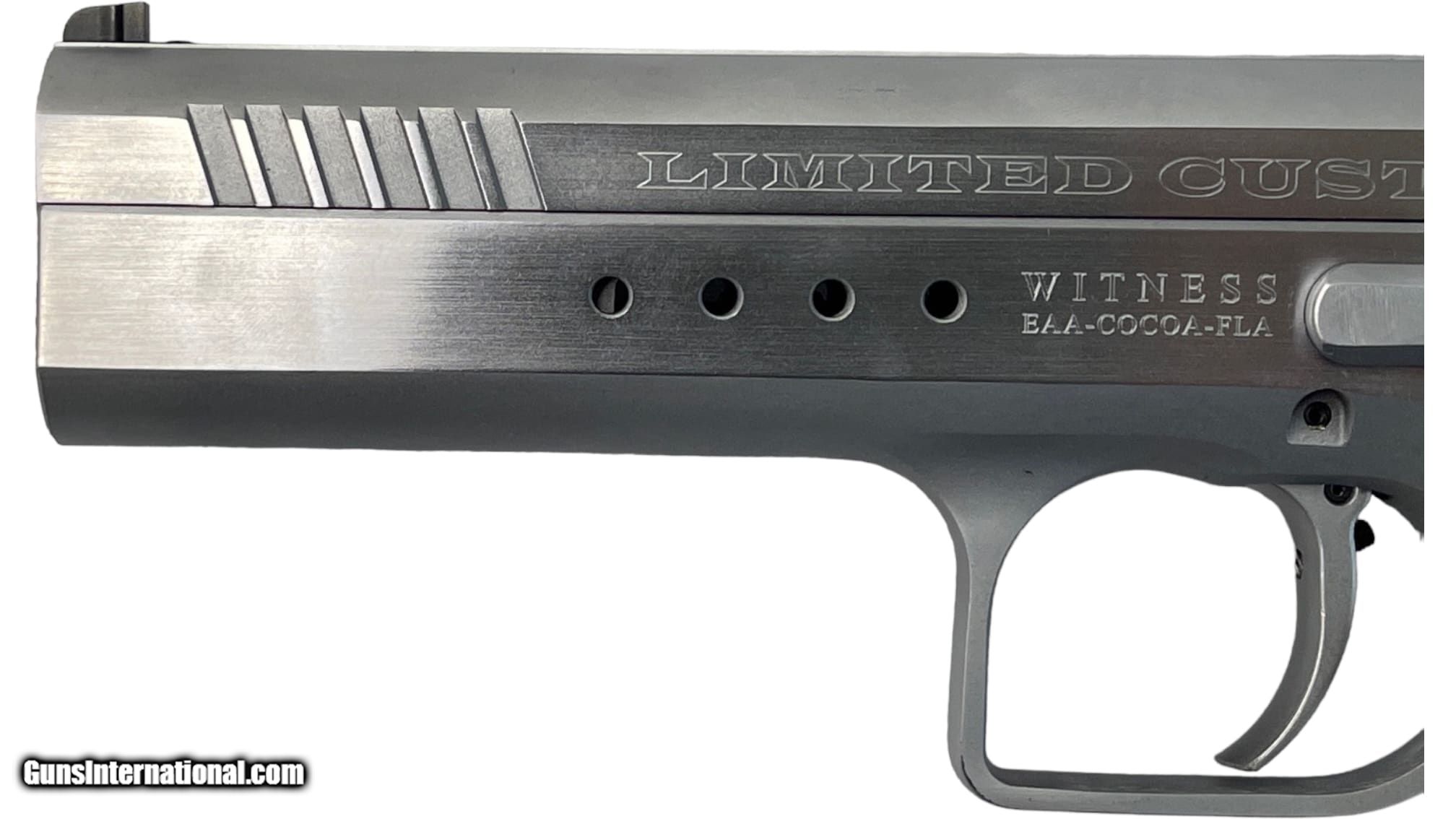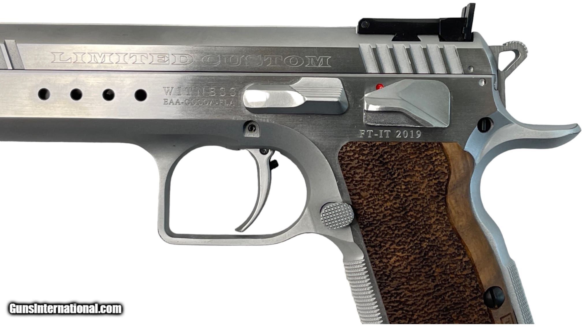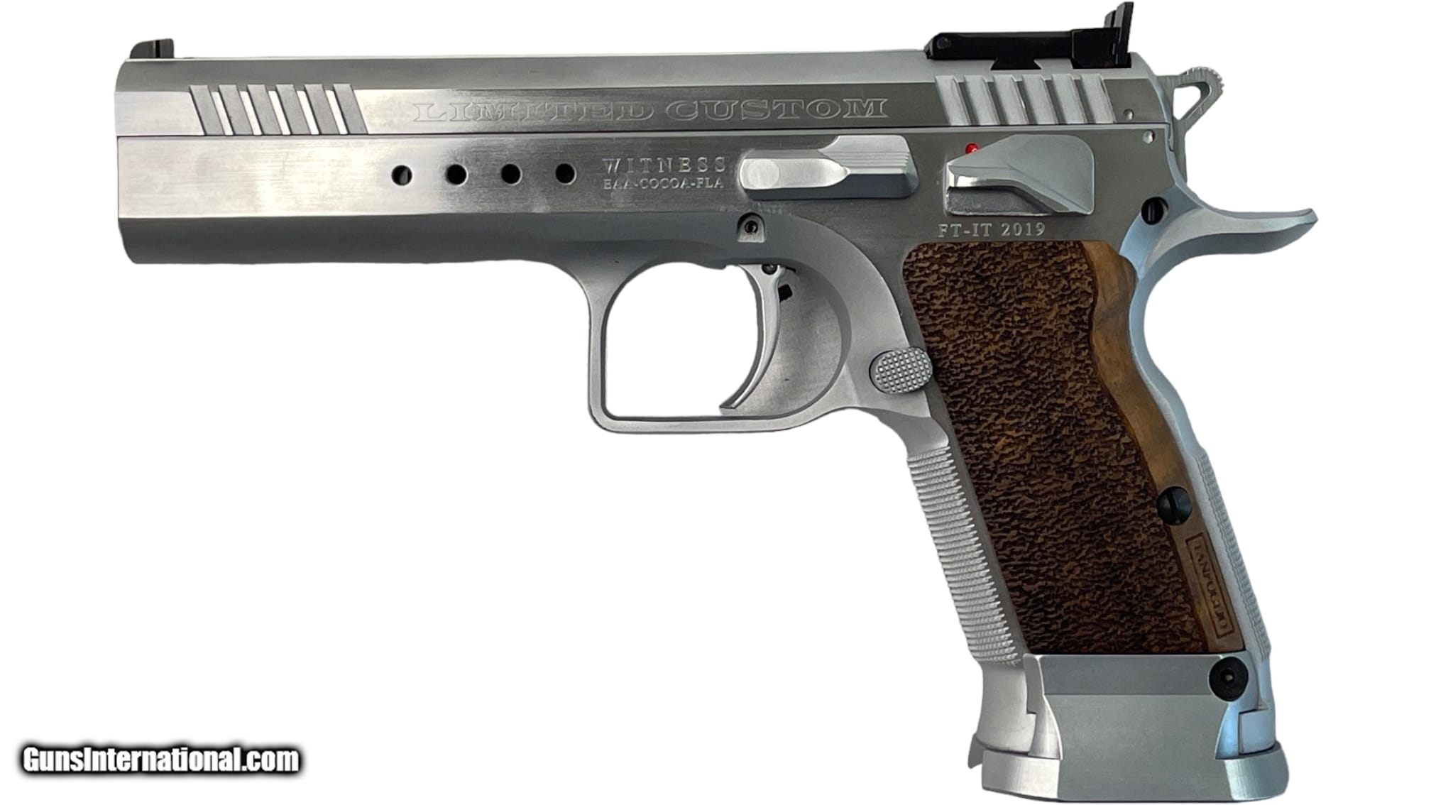 Description: Guns Listing ID: 814652 This listing is for a Tanfoglio imported by EAA model Witness Limited Customer semi-auto pistol chambered in 9mm. Pistol has a 4.75\" barrel, a 21rd and 17rd magazine capacity, stainless finish, steel frame, wood grips, flared magwell, front and rear slide serrations, adjustable rear sight, and a front black. Overall pistol is in very good to almost like new condition with little sign of actual use/wear. Bore is bright and sharp. Listing includes original lockable case, manual, and 3 magazines (1x 21rd, 2x 17rd). SOLD Manufacturer: TANFOGLIO Model: LIMITED CUSTOM WITNESS Caliber Info: 9MM LUGER (9X19 PARA) Condition: Used - Non-Certified Barrels: 4.75 BARREL Finish: STAINLESS |