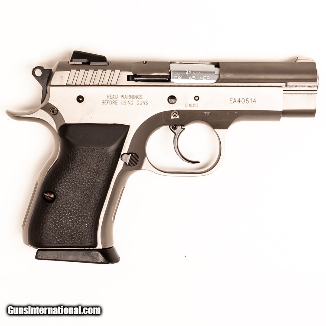 Description: Guns Listing ID: 553950 The Tanfoglio Witness is a semi-automatic handgun closely patterned off the legendary CZ 75. It‚‚s well-suited for self-defense. One 8-round magazine is included. SOLD Manufacturer: TANFOGLIO Model: WITNESS Caliber Info: .45 ACP Condition: Used - Certified Barrels: 3.6 BARREL Finish: STAINLESS |