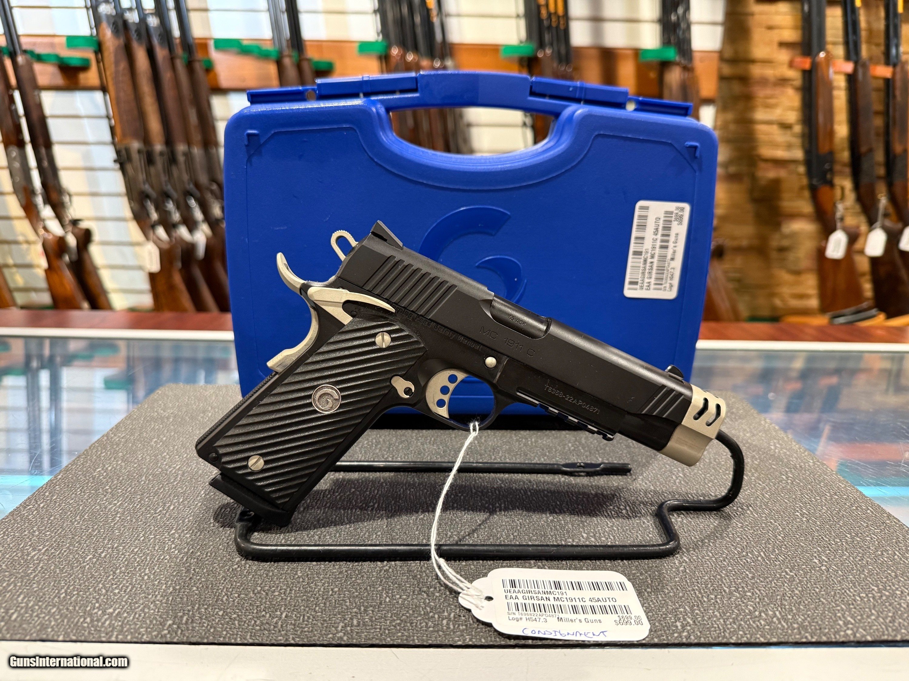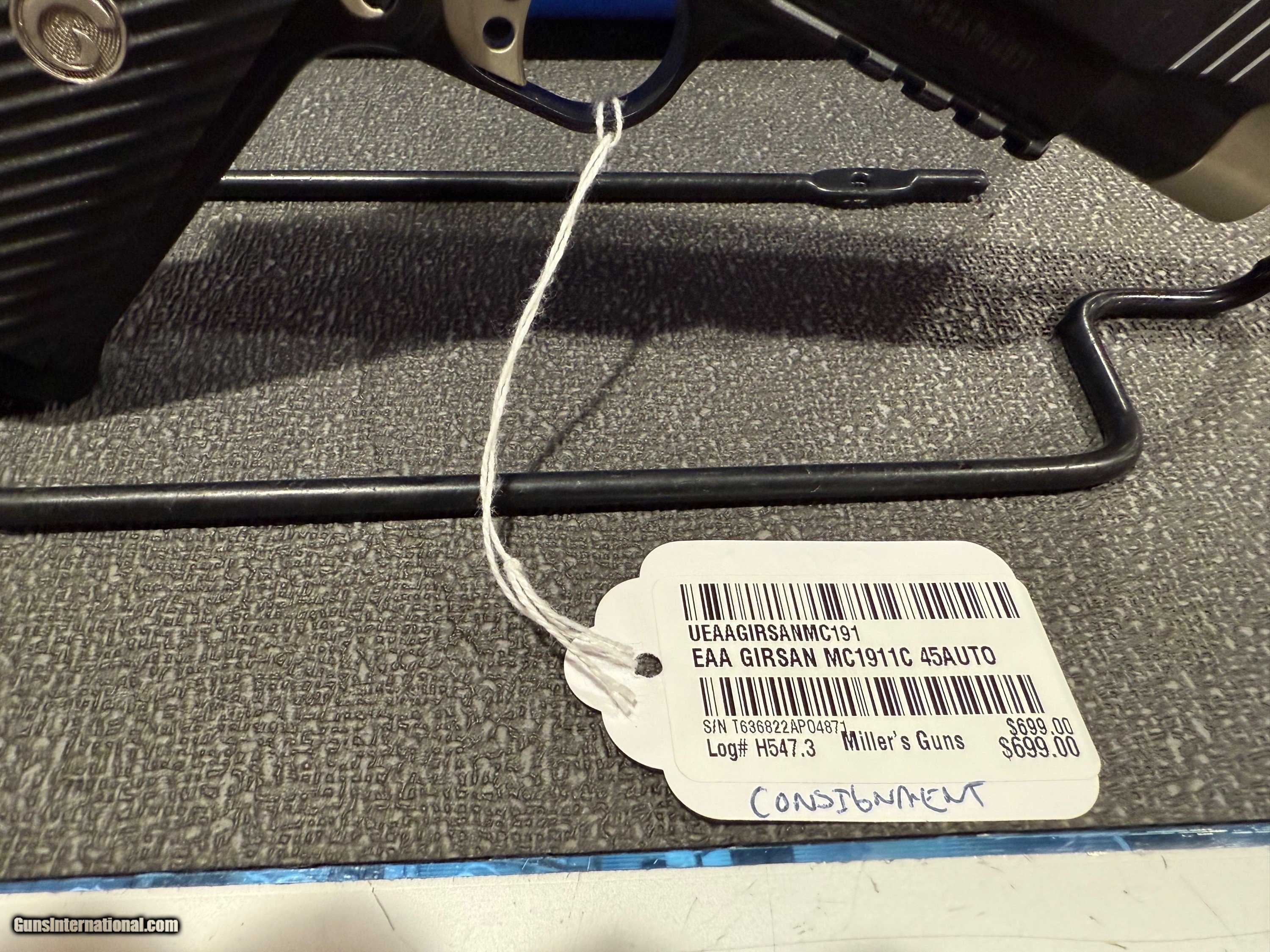 Description: USED EAA/Girsan MC1911C .45acp Compensated 8 round capacity (1) magazine included Factory hard case included Handgun Caliber: .45 ACP (.45 Auto) Manufacturer: EAA/Girsan Model: MC1911C Serial Number: T636822AP04871 Barrel Length: 4.25” w/ .750 Comp Condition: VERY GOOD Price: $699.00 Contact Seller |