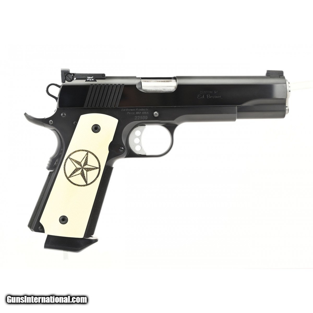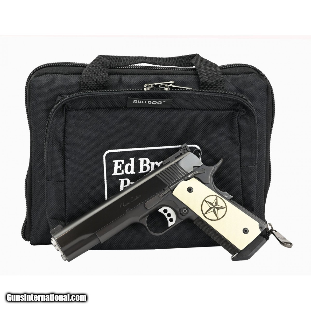 Description: " Ed Brown Classic Custom .45 ACP caliber pistol. 5" Blue Target model with polished slide and Texas grips Excellent condition with bag.