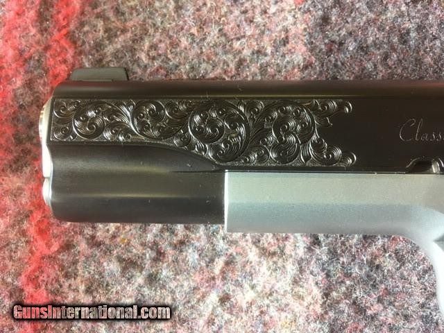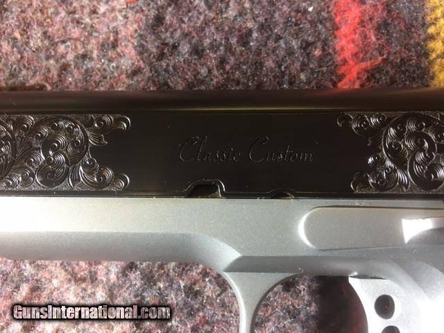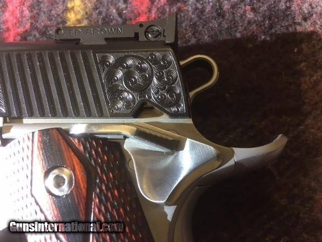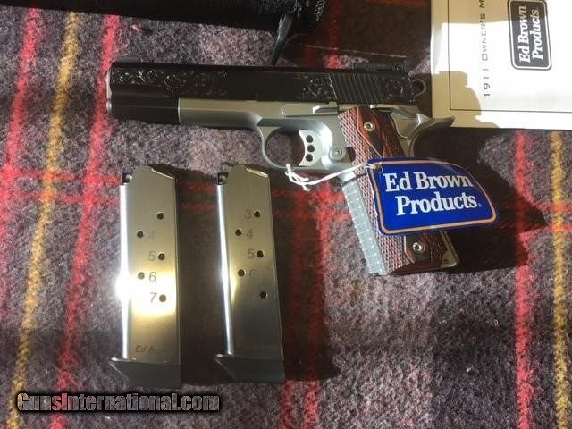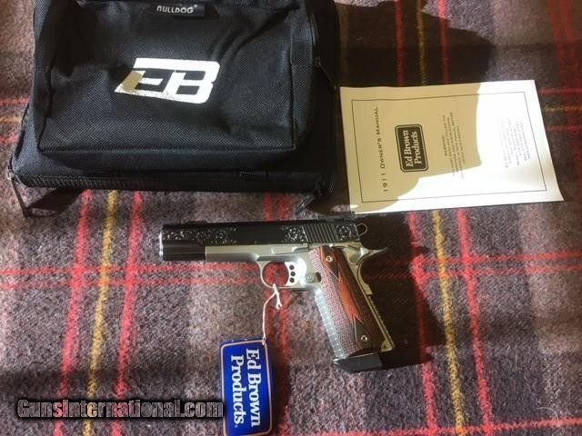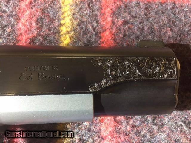 Description: ED BROWN CLASSIC CUSTOM 45 ACP 1911 PISTOL, ATTRACTIVE TWO TONE FINISH, ENGRAVED SLIDE, BEAVERTAIL GRIP SAFTEY, EXTENDED MAG RELEASE, CHECKERED FRONT GRIP STRAP, BEAUTIFUL GUN SOLD |