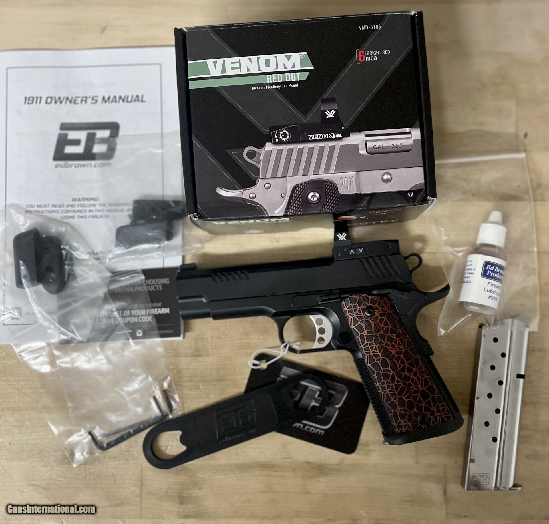 Description: Guns Listing ID: 375828 The EVO Series was intended from its inception to evolve. In today’s market you’ll find more and more handguns equipped with electronic sights, while the requirement for smaller and lighter also increases. The E9-LW meets both of these demands, featuring a lightweight aluminum frame, with a shortened and thinned 4\" slide topped with a Vortex Venom® red dot sight. The E9-LW is the first model in the EVO series equipped with a red dot sight. The 6 MOA dot promotes rapid target acquisition, while providing a precise point of aim. Featuring 25 LPI checkering, and fitted with a Chen Gen2 magwell, it is the ideal choice to add a 360 degree funnel, without increasing the height of the frame. Finished out with the exclusive Labyrinth grips, seven top slide and special front and rear cocking serrations, the E9-LW continues the striking appeal of the EVO series. Optimized for 9mm, it retains 100% 1911 controls and handling characteristics, and features an external extractor, easy-to-change front sight, fluted bull barrel, and a flat wire recoil spring system. SOLD Manufacturer: ED BROWN Model: EVO E9-LW Caliber Info: 9MM LUGER (9X19 PARA) Condition: Used - Non-Certified Barrels: 4 BARREL Action: SEMI AUTOMATIC Finish: BLACK Weight: not specified |