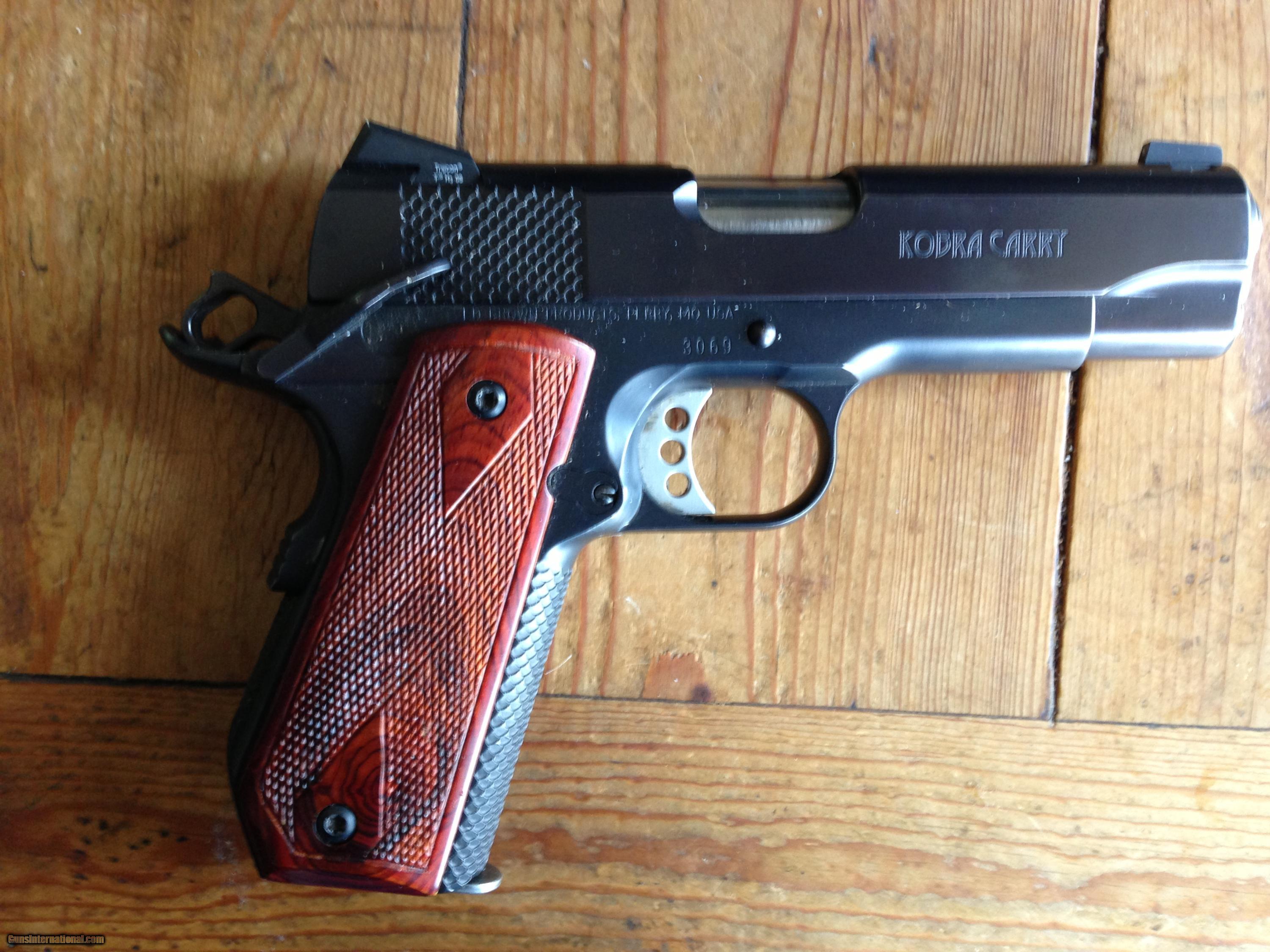 Description: Ed Brown Kobra Carry 45 ACP 4 1/4 " barrel Blued finish. Excellant condition. Esmerelda grips. Bobtail and snakeskin. Factory soft case and two magazines. Holster. SOLD |