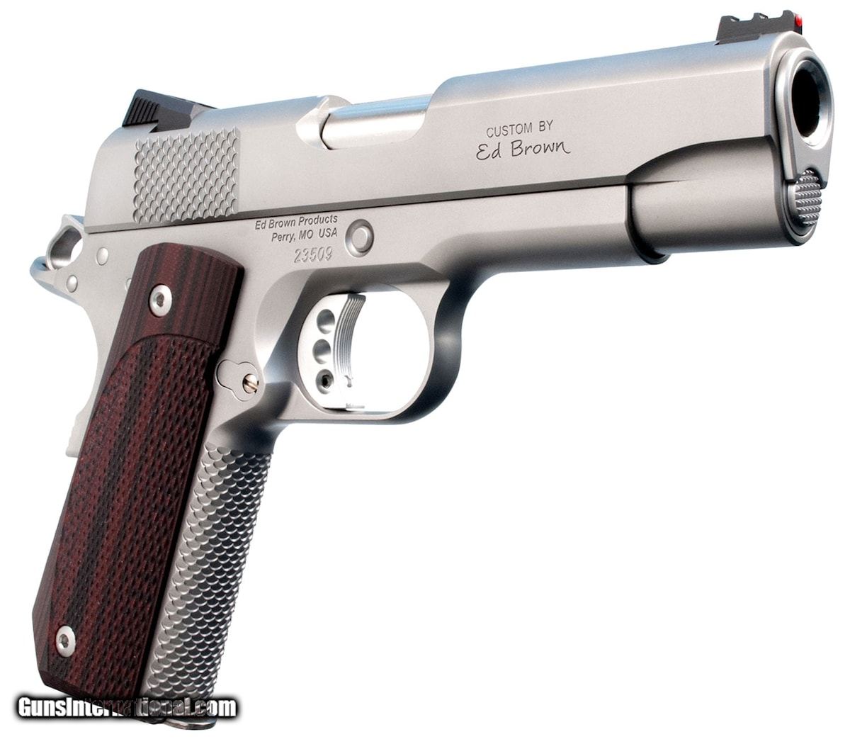 Description: Guns Listing ID: 518882 Ed Browns Kobra Carry is a perfect choice for those who prefer a smaller model 1911 but insist on complete reliability. The slide has been reduced to the minimum possible 4.25 without significantly impairing the legendary reliability of the 5\" slide. The frame has been modified with the innovative Ed Brown Bobtail housing which reduces the projecting butt of the mainspring housing without sacrificing the full size frame and magazine capacity. The Bobtail minimizes the print under your clothing for conceal carry and reduces weight. Unique to the Kobra pistol series is the innovative directional Snakeskin treatment on forestrap Bobtail housing and slide. This pattern is smooth to slide your hand up but bites in for a snug grip the other way where you need it. The Kobra Carry model includes custom features such as recessed slide stop flush barrel with recessed crown and heavy chamfer. Kobra Carry has a red fiber optic front sight with a fixed black rear sight. This model is has a matte stainless steel metal finish.\ SOLD Manufacturer: ED BROWN Model: KOBRA Caliber Info: .45 ACP Condition: new Barrels: 4.3 BARREL Finish: STAINLESS |