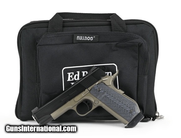 Description: Ed Brown Special Forces .45 ACP caliber pistol. Commander size carry model with two-tone finish and bobtail grip. Very good condition with bag.