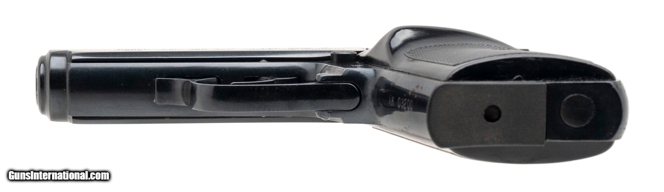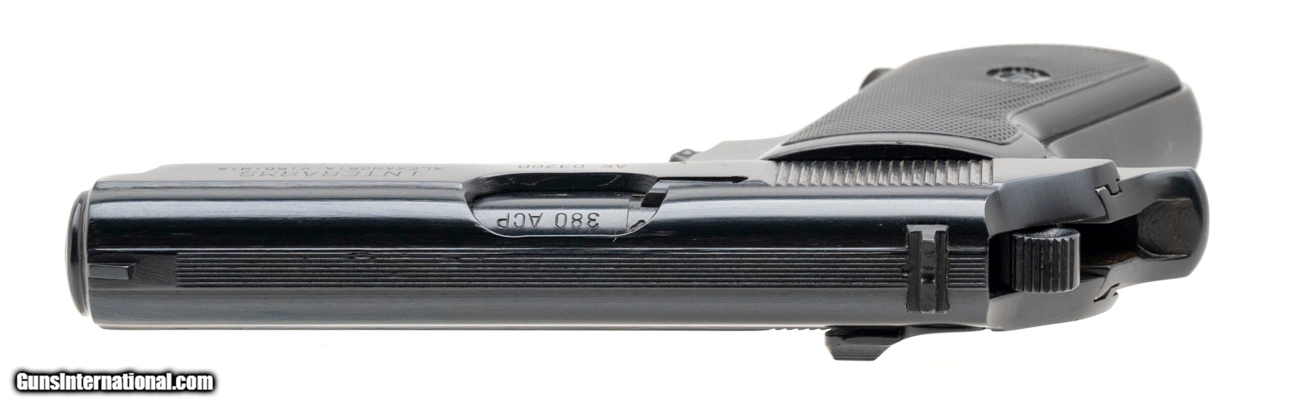 Description: "SN: AK03200. 1990s vintage, .380ACP with a 3.4"" barrel. Bore is excellent. Hungarian made compact pistol imported by Interarms with a manual thumb safety/decocker, blued finish, and checkered black plastic grips. Finish shows minor handling wear. Includes additional magazine, additional right grip panel, and original carry case. Overall condition is very good. SOLD |