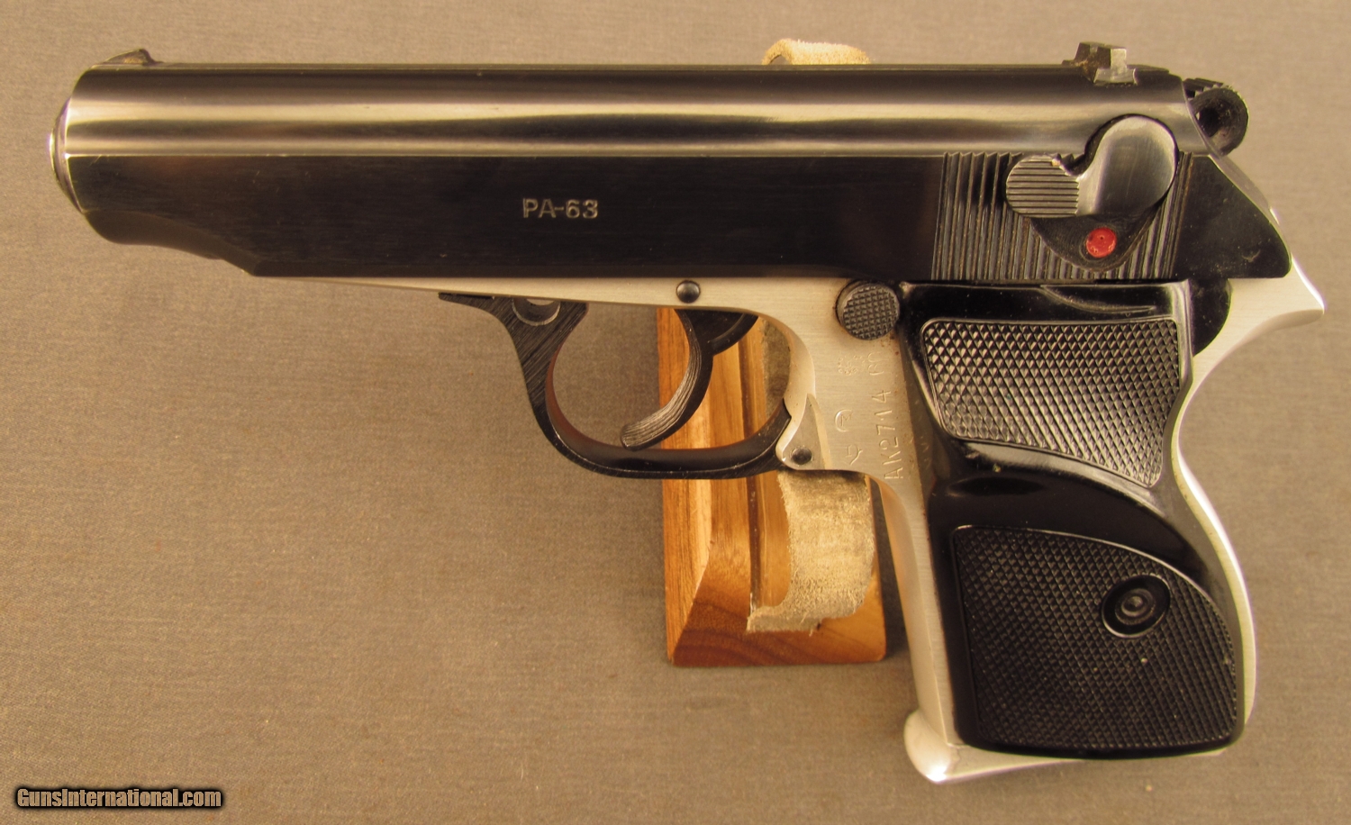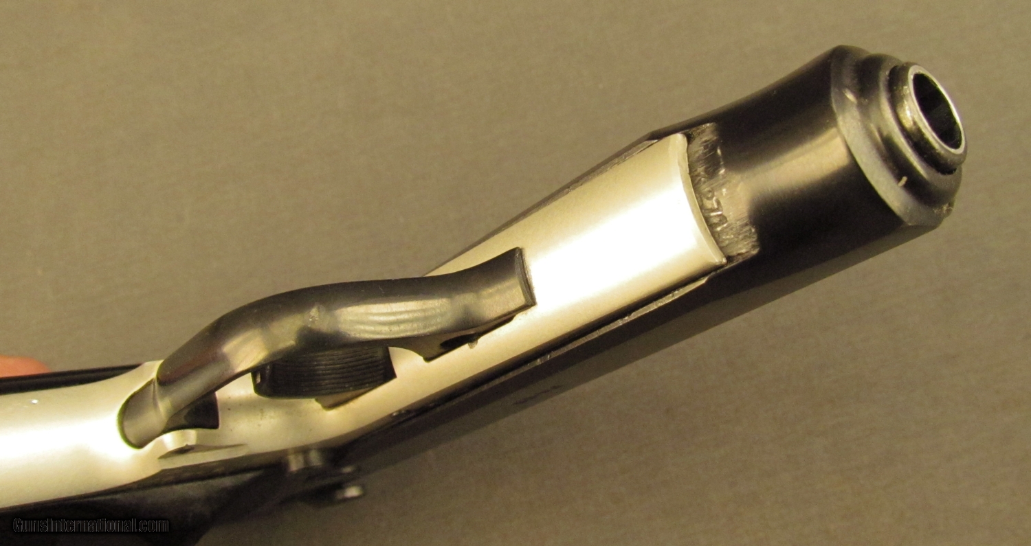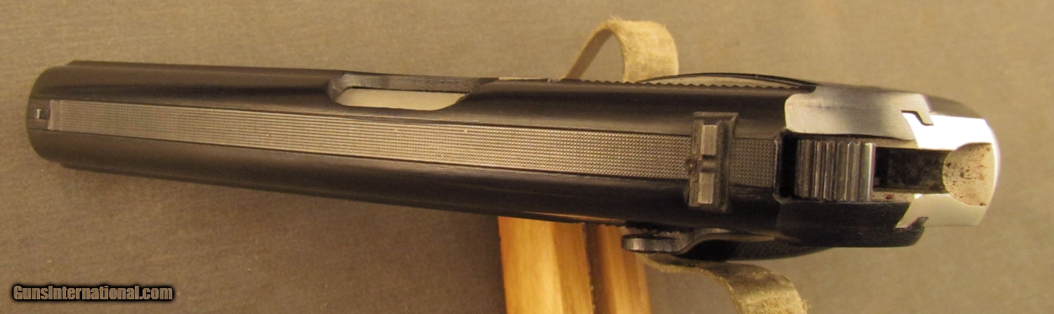 Description: Serial #AK2714, 9mm Makarov, 3 3/4” barrel with an excellent, bright bore. This is a two-tone, C.A.I. import that exhibits very little evidence of use and has 98-99% of the original blue remaining on the slide. The frame is bright and the checkered black plastic thumb-rest grips are in fine shape with some very minor handling marks and blemishes present. The pistol is housed in a lightly worn military flap holster along with two finger-rest magazines (one with matching numbers). This is a nice Hungarian-made pistol that is in excellent condition overall. FFL SOLD Manufacturer: FEG Model: PA-63 Serial Number: AK2714 Caliber Info: 9mm Gauge Info: 9mm |