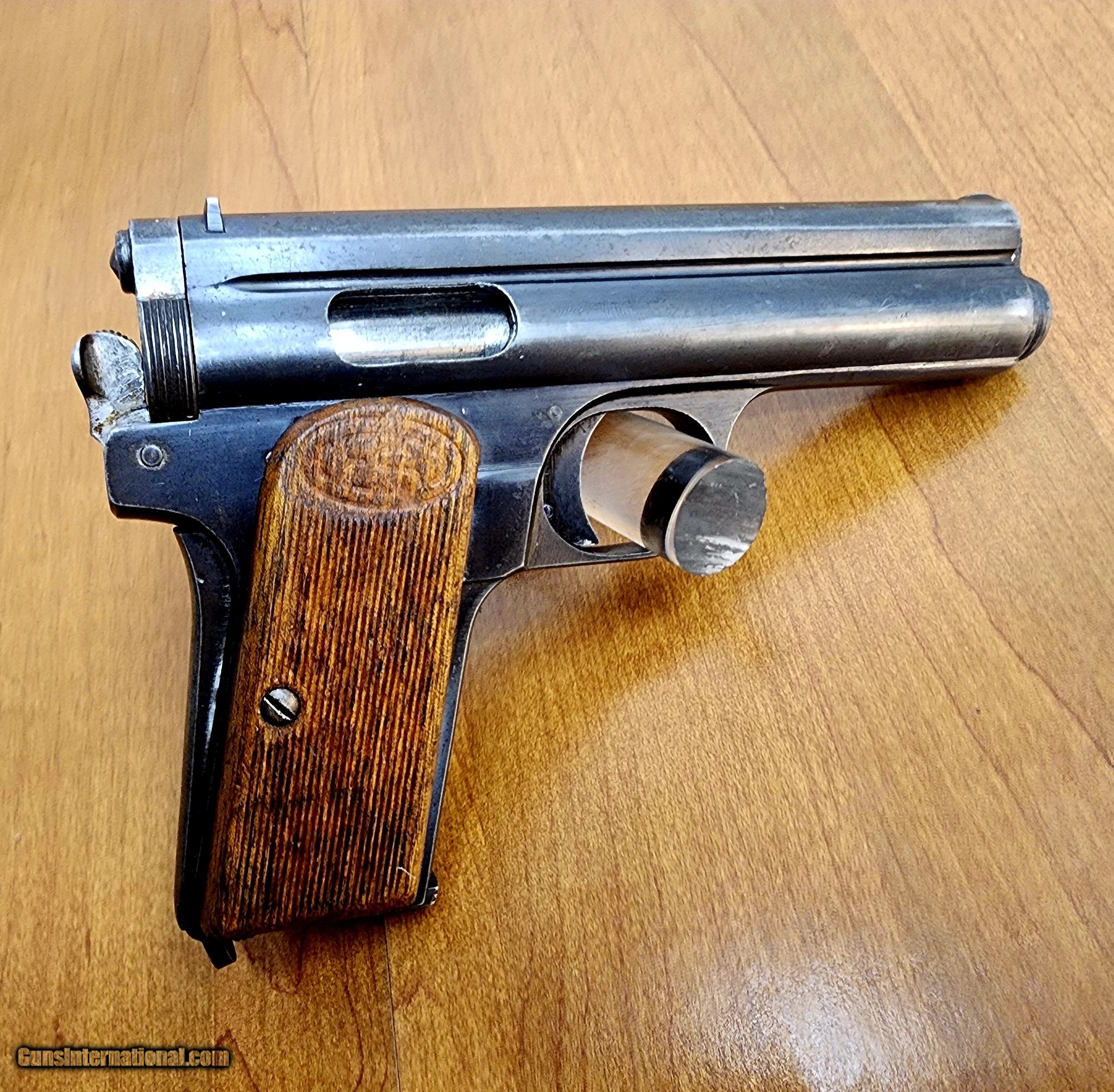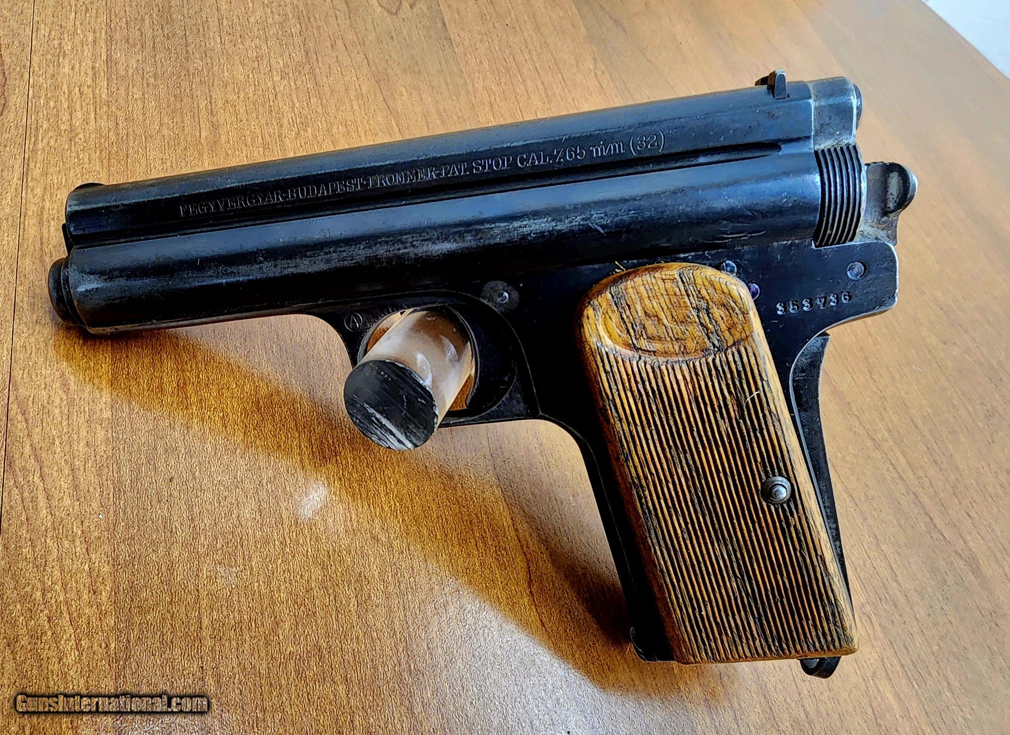 Description: Guns Listing ID: 546319 The Frommer STOP (Szabályozott Öntölto Pisztoly, StÖP) is a Hungarian semi-automatic pistol which was manufactured by small arms firm Fegyver- és Gépgyár (FÉG) in Budapest. It was designed by Rudolf Frommer and adopted by the Austro-Hungarian Army in 1912 as the Pisztoly 12.M alongside the Steyr-Hahn. The STOP was also sold to Bulgaria, Germany and Turkey for service use. The pistol was manufactured in various forms from 1912 to 1929 and was also used by the Ottoman Army and the Royal Hungarian Army, seeing action in World War I and World War II. Its design features a 165 millimeters (6.5 in) long frame with a 95 millimeters (3.7 in) 4-groove rifled barrel using a long-recoil, straight-pull, rotating bolt locking action with the barrel and bolt employing independent return springs in a cylindrical housing above the barrel. Unloaded weight is 610 g (22 oz), and the detachable box magazine holds seven rounds of 7.65 x 17mm Frommer Long (essentially a higher velocity .32 ACP round). The model designation \"STOP\" is often mis-attributed as solely a marketing allusion to the pistol‚s stopping power as used with commercial advertising after the war but was originally an acronym, szabályozott öntölto pisztoly, related to the unique bolt hold (stop) mechanism employed in the long-recoil action. Such a complex locking action is not necessary for .32 ACP and .380 ACP cartridges and later FÉG Frommer 29.M and 37.M pistols used more conventional simple blow-back actions. The pistol incorporated design features of Frommer‚s earlier sidearm designs, including the M1901 and M1904, both of which were inspired by the Roth–Theodorovic pistol. The Frommer Stop was chambered in a proprietary 7.65mm cartridge which had a crimp in the shell casing at the base of the bullet. This round achieved a velocity of 920 feet per second (280 m/s) from the gun. Using his earlier pistols‚ basic long-recoil locked action, Frommer redesigned it with a more compact and conventional layout for the Model 1910 and patented it in 1911 for use with the STOP. Barrel is 3-7/8 inches. Caliber: .32 ACP SOLD Manufacturer: FEG Model: Stop Caliber Info: 7.65MM Condition: Used - Non-Certified Barrels: 4 BARREL Action: SEMI AUTOMATIC Finish: blued |