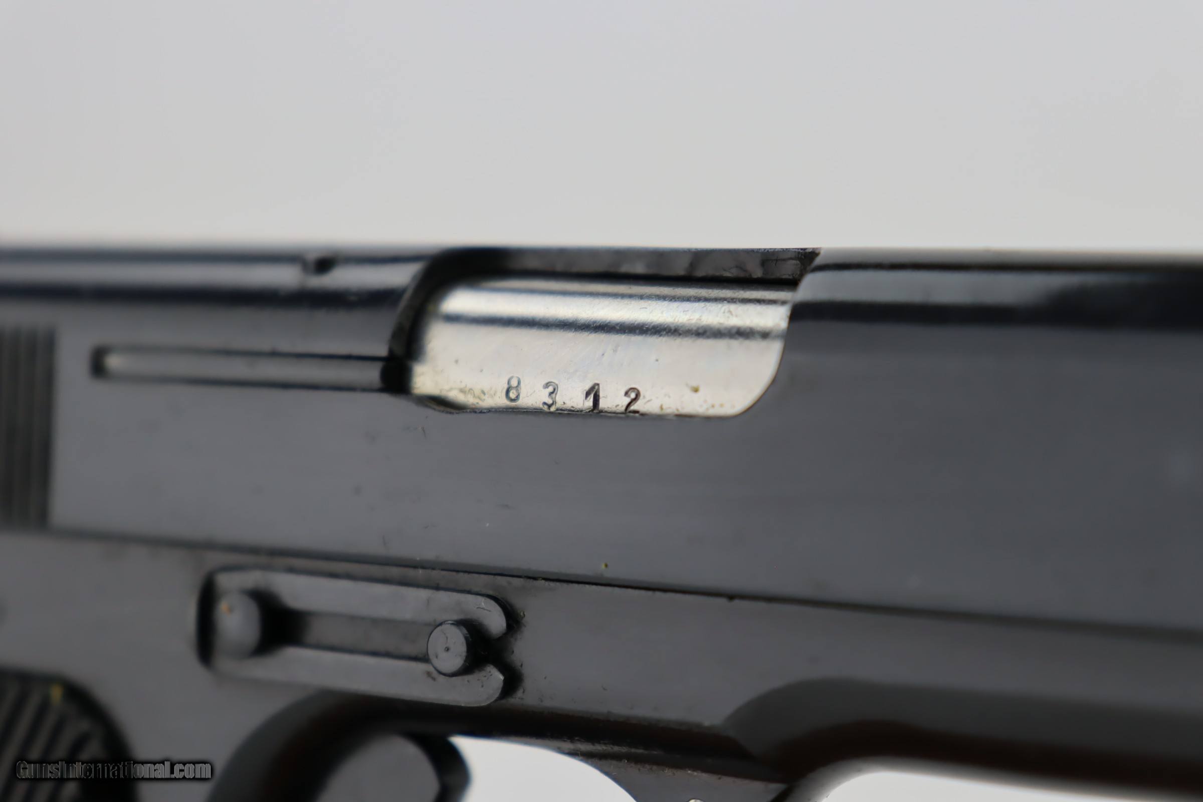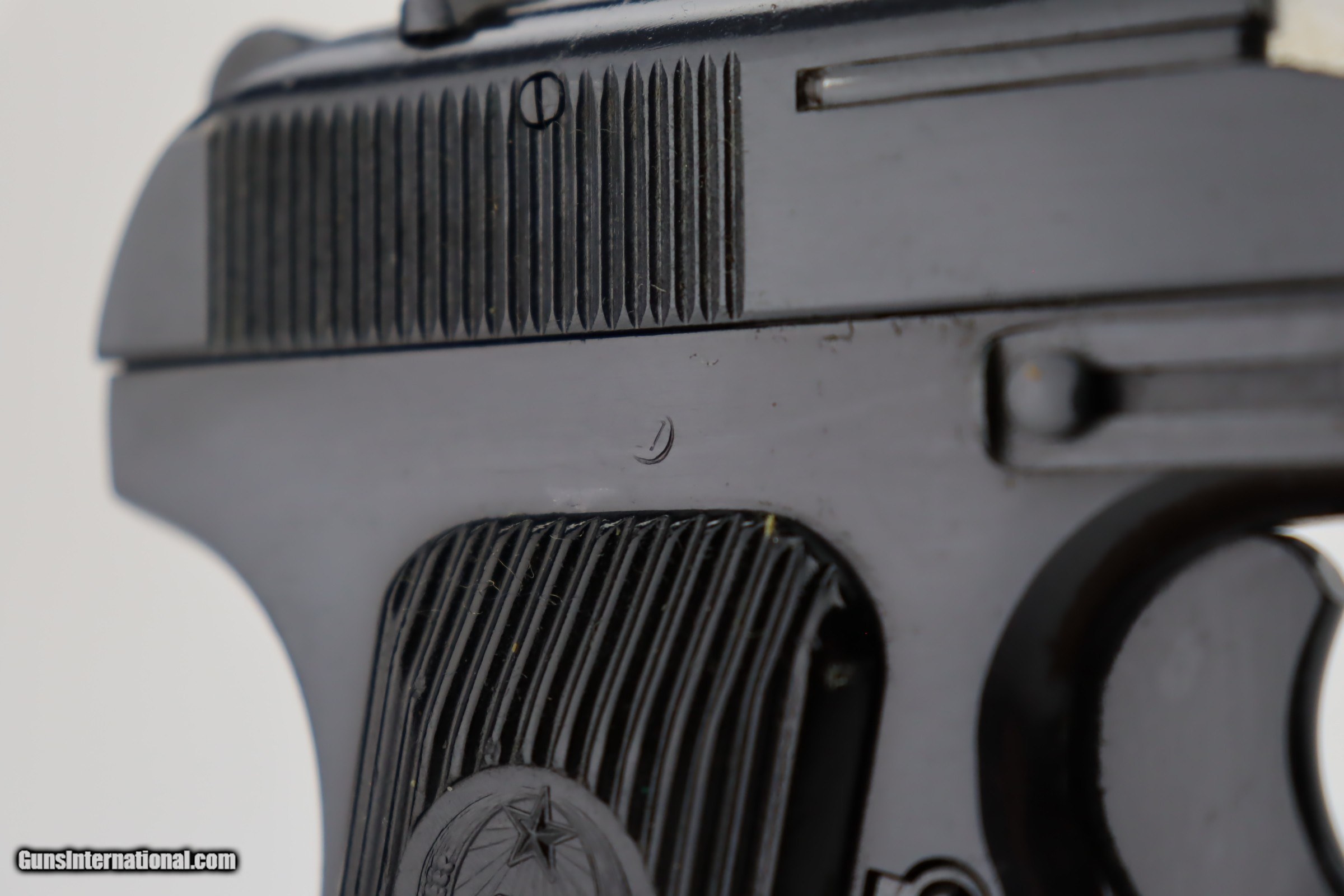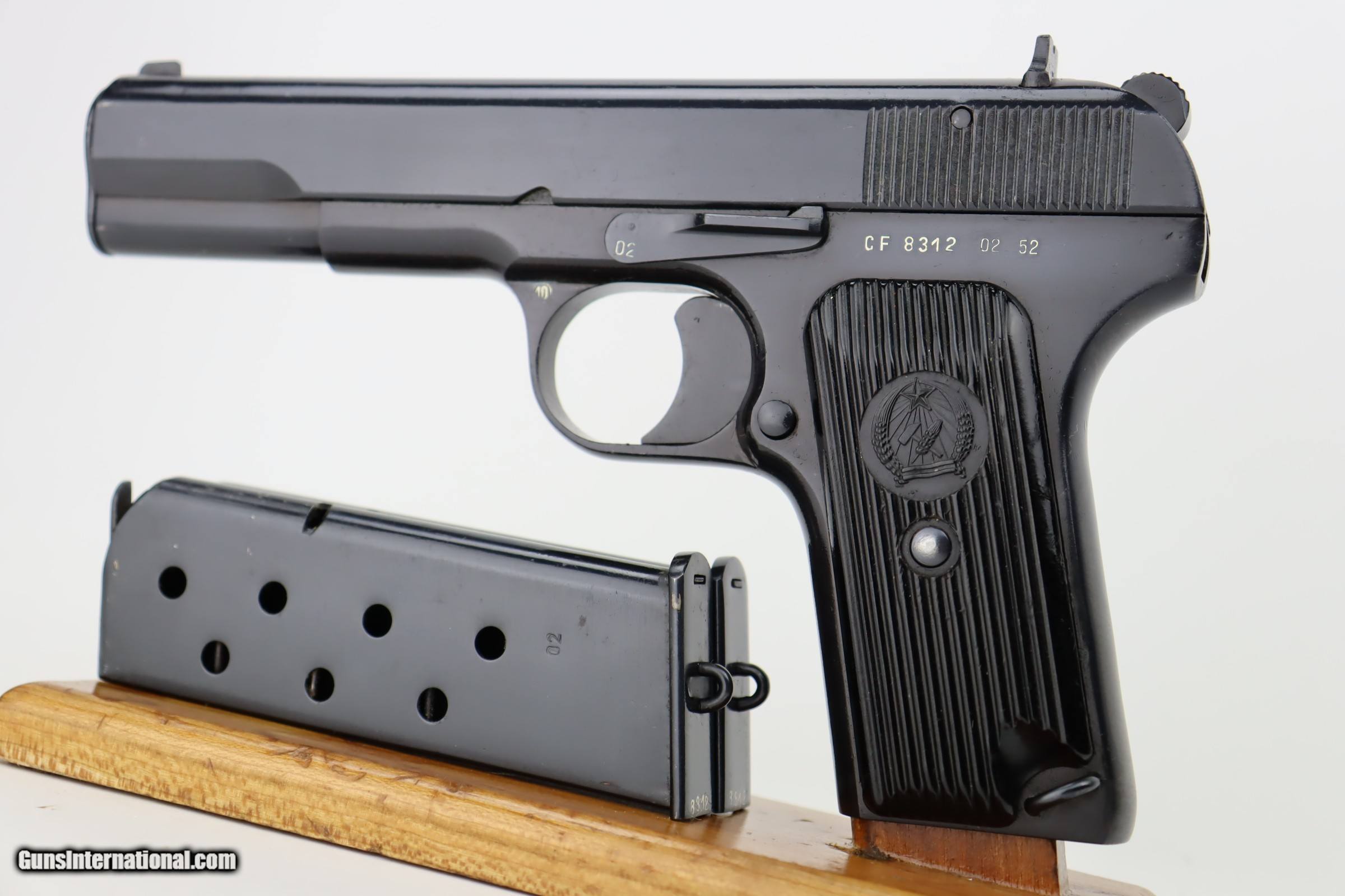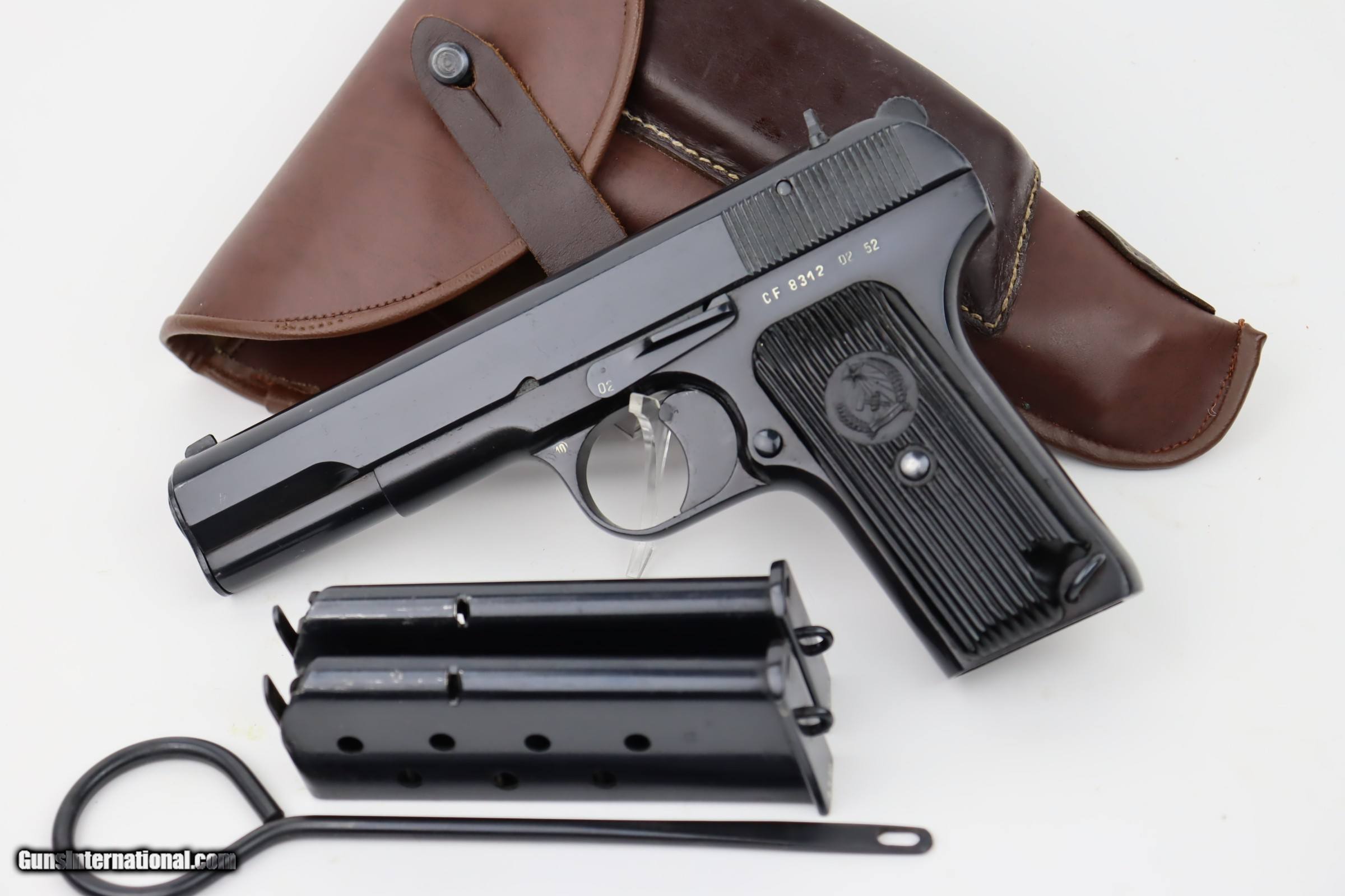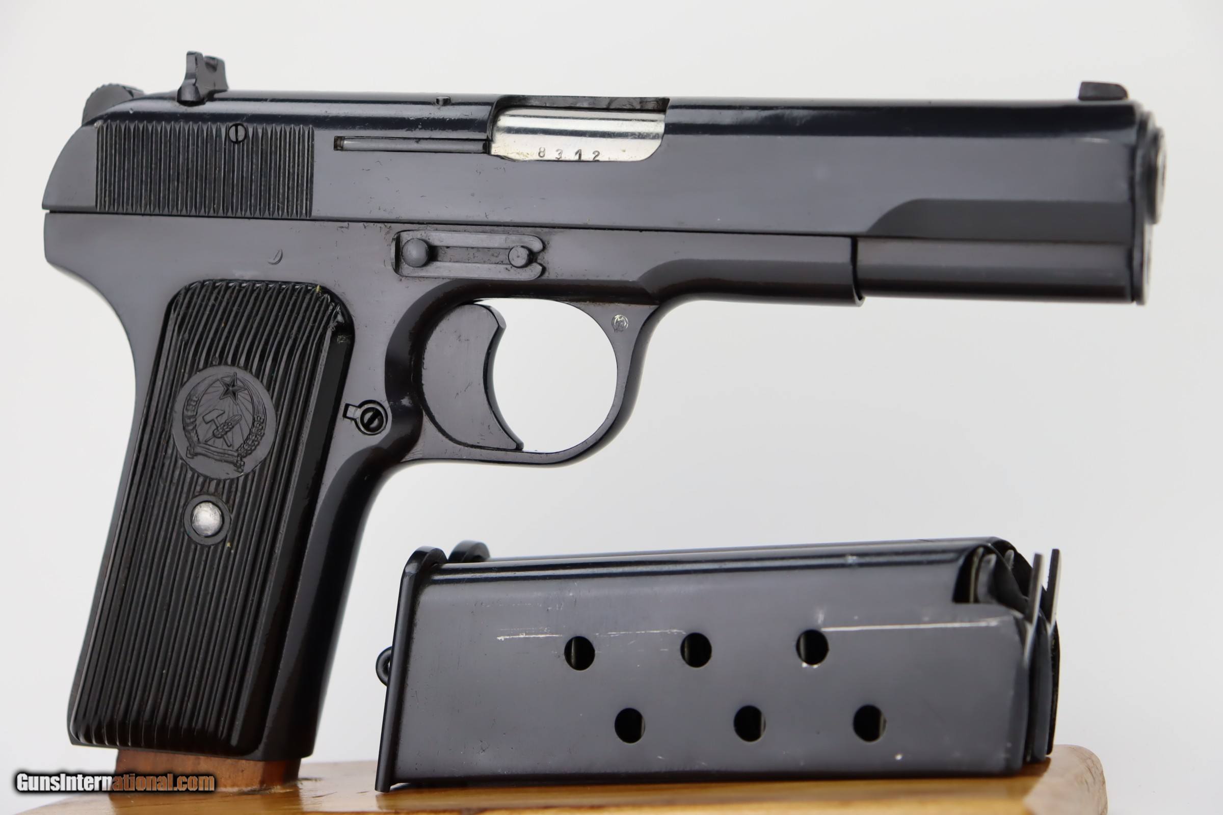 Description: This is one of the rarest TT-33 variants ever produced - a Hungarian made Model 48 pistol. This is a mint, all original and all matching example, retaining virtually all of its original blue. The rig is as issued with original holster, cleaning rod and two matching magazines! Perfect grips with Hungarian Soviet era crest, excellent bore and no import markings. Every part is proofed with Hungarian “02” acceptance proof that is also present on the magazines. Very few of these guns made it into the US, most likely either with military personnel stationed in Europe in the 1950s or via Vietnam as bring-backs. To find a complete rig in such outstanding condition is nearly impossible. SOLD Curio/Relic: Yes Handgun Caliber: 7.62x25mm Tokarev |