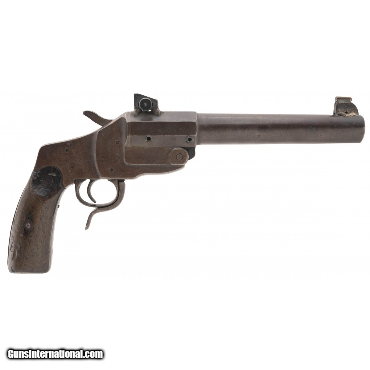 Description: " Hebel model 1894 flare gun.26.5MM barrel but has been deactivated.Someone welded target sights on? Hammer and trigger still work. Missing lanyard loop. SOLD |