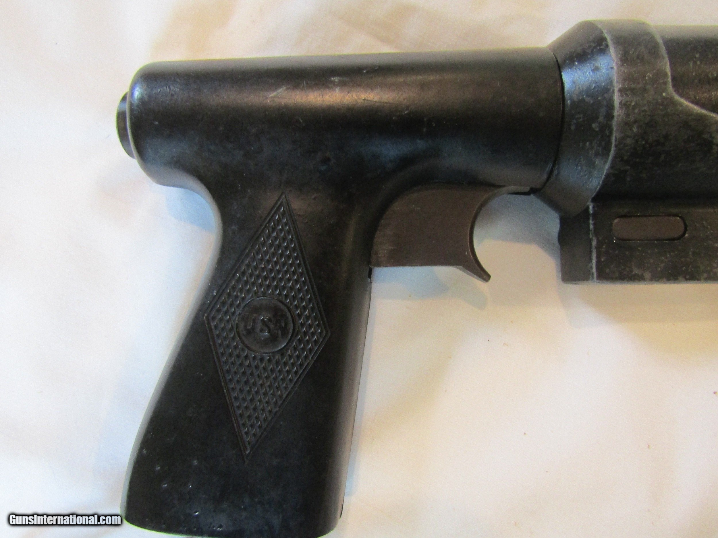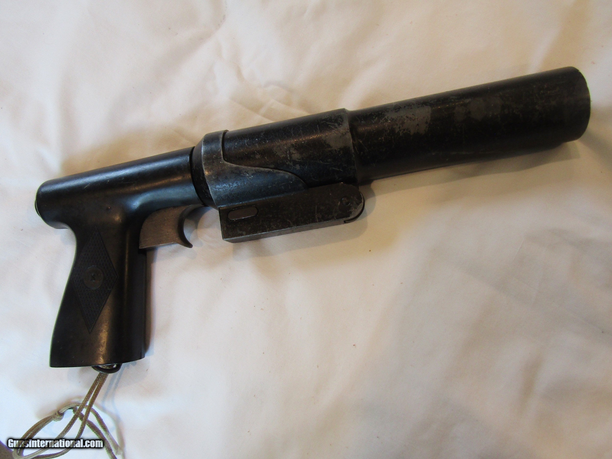Description: This is as early as I can find this model it has all the info stamped that are needed to id when this was made and by who. The gunshoot a 37 MM parachute flare and was used extentively in lifeboats, and was also standard provision on United States Coast Guard boats. I have looked for info , sort of rareish flare pistol,. All the part work and 80 to 90% of the original paint is intact. It is over 13 inches long. This flare gun was so rare know one knew when it was patented, on mine it stamped 1932, quite a bit before the war.Call 859-533-5445 Dan SOLD Manufacturer: r.f. sedgley inc. Model: 1943 Bore: 33mm Condition: above good Barrel Type: flare gun |