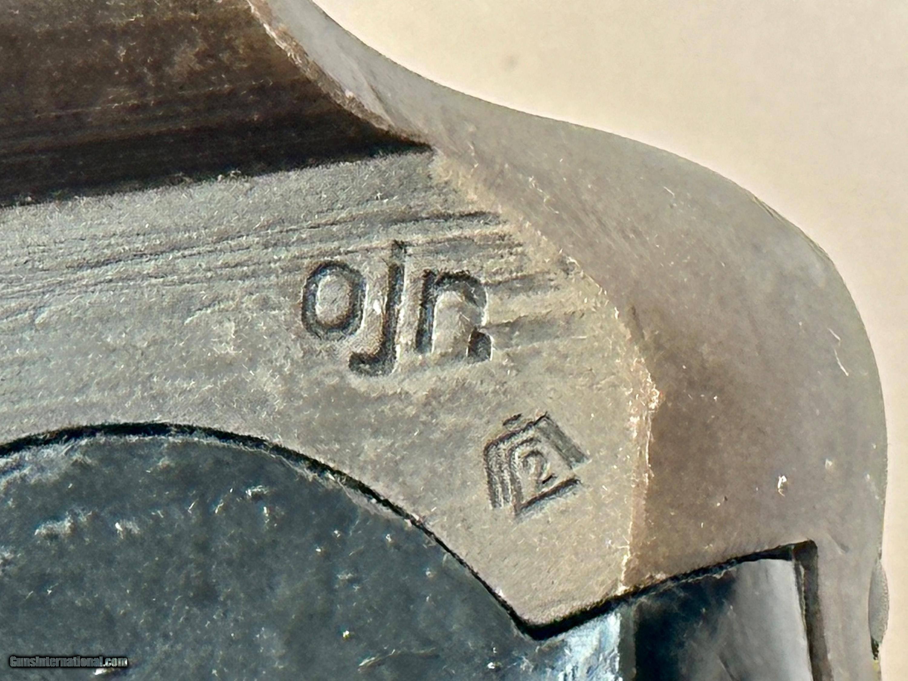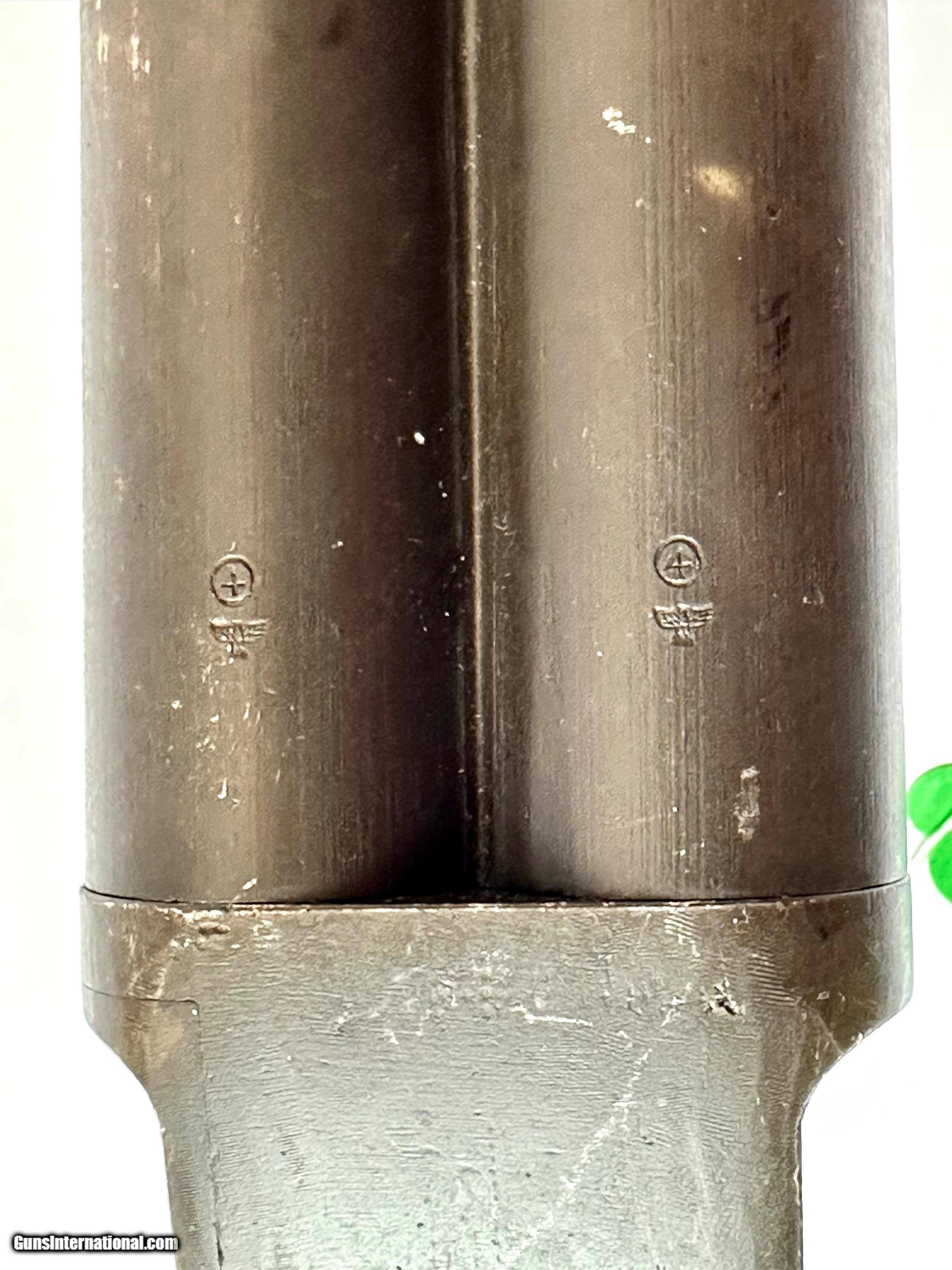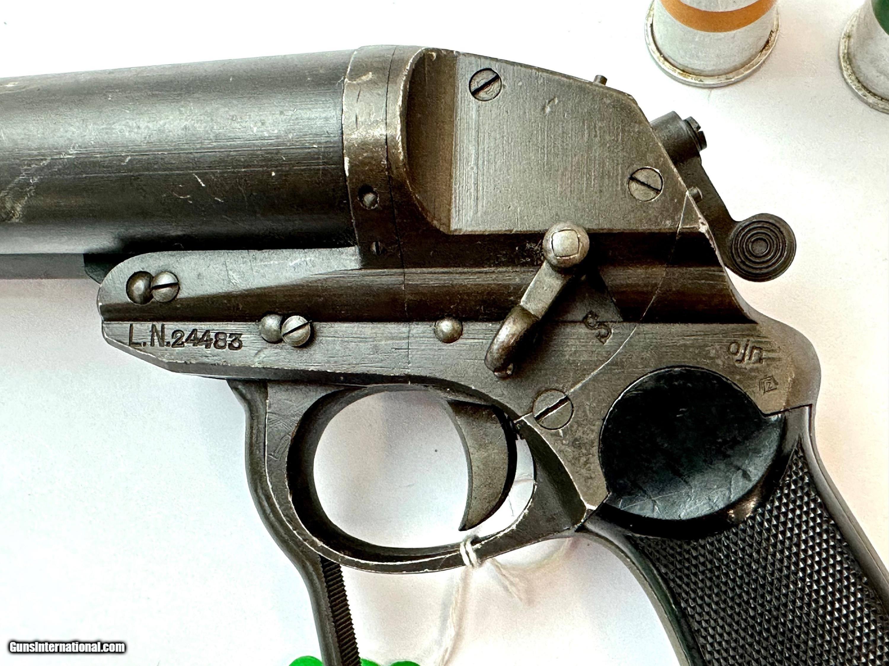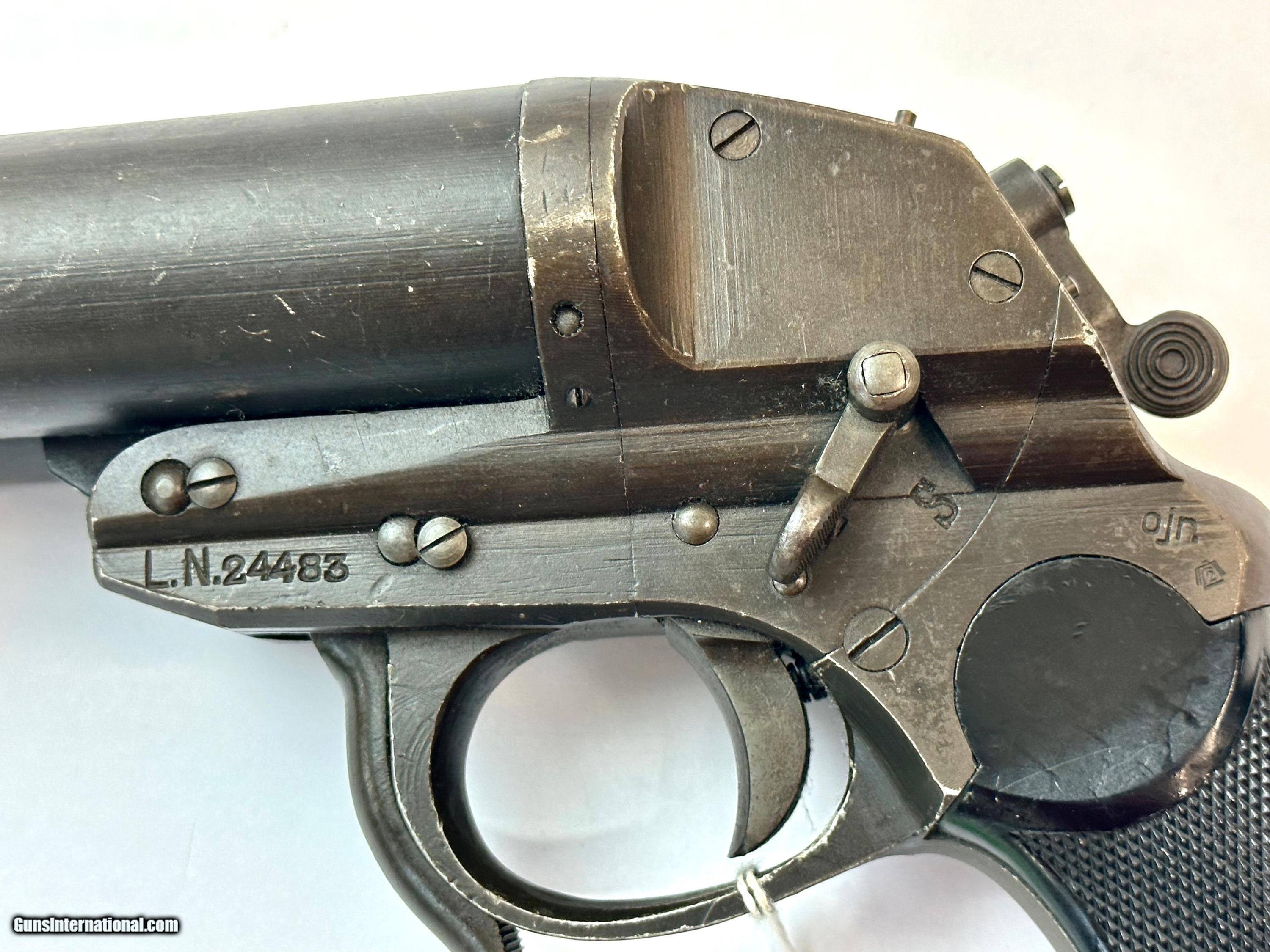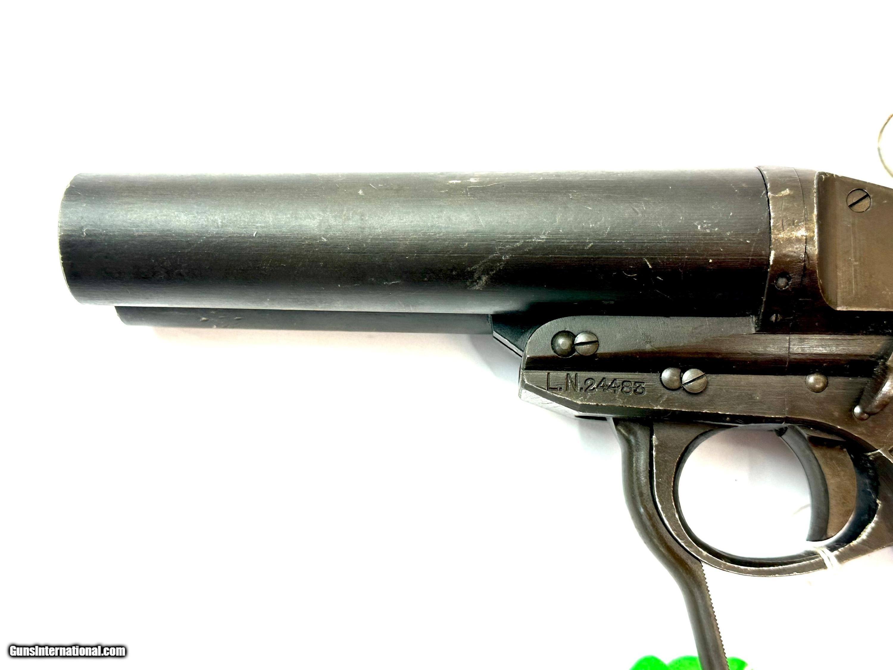 Description: **Flares Are Still Available** (26.5mm) This is an excellent condition example of the Luftwaffe Flieger-Leuchtpistole L or Aviators Flare Gun L. These double-barreled, 26.5mm (4 Bore) signal pistols were issued to Luftwaffe aircrews in order to give them a method of communication that did not rely on their radio transmitters. This pistol is marked with the maker code ojn, The ordnance code is located to the rear of the safety lever on the left side of the frame under the makers mark. The tops of the barrels are both marked with a 4 in a circle (4-Bore) over the Luftwaffe Stick Eagle acceptance mark. This same proof appears on the rear of the receiver between the L and R barrel selector marks, and is covered when the selector switch is in the middle or "both barrels" position. The signal pistol is marked with the serial number 27746 on the forward lower portion of the right hand side of the frame, and the Luftwaffe contract number L.N. 24483 is present on the opposite side of the frame. The gun has a frame mounted safety with Fire and Safe markings. The pistol uses a break open design that is activated by pushing the release lever, located under the trigger guard, forward. This action releases the locking lugs, opens the action, cocks the pistol and automatically sets it on safe. After closing the action, the shooter can use the selector switch on the rear of the frame to determine whether they want to fire the Left barrel, Right barrel or both barrels simultaneously, by pulling the split trigger.The Flare Gun L offered here is in fantastic condition. The pistol retains about 95%+ of its original blackened phosphate finish, with most of the wear and finish loss confined to the sharp and high edges and the muzzle crowns, along with a few minor handling nicks and scratches. The pistol is in excellent mechanical condition and functions perfectly, with a very crisp, tight action. The two-piece black Bakelite grips are in excellent condition as well. They retain sharp checkering, with only the most minor handling and finish wear. They are free of any of the breaks, chips or cracks. No FFL is required to purchase as this is not a firearm Must be 18 years or older. ID is required. Maine Residents add 5.5% Sales Tax SOLD Manufacturer: Ojn Model: Luftwaffe Flieger-Leuchtpistole Serial Number: 27746 Barrel Length: 6.5 Condition: Very Good-Excellent Metal Condition: Very Good-Excellent Wood Condition: Very Good-Excellent Bore Condition: Very Good-Excellent Action: Break open Item Location: Buxton Maine |